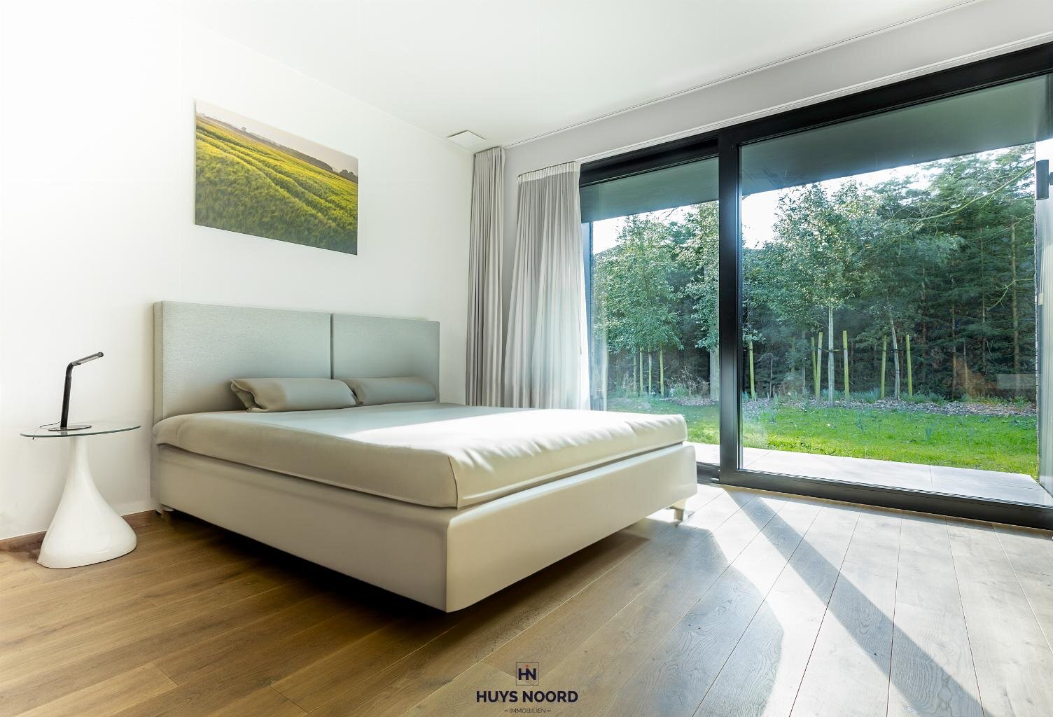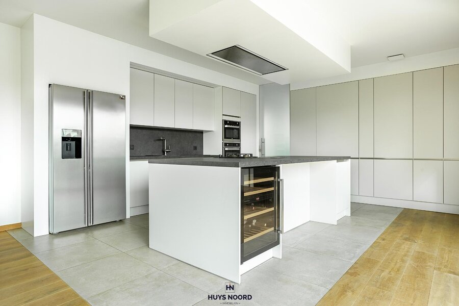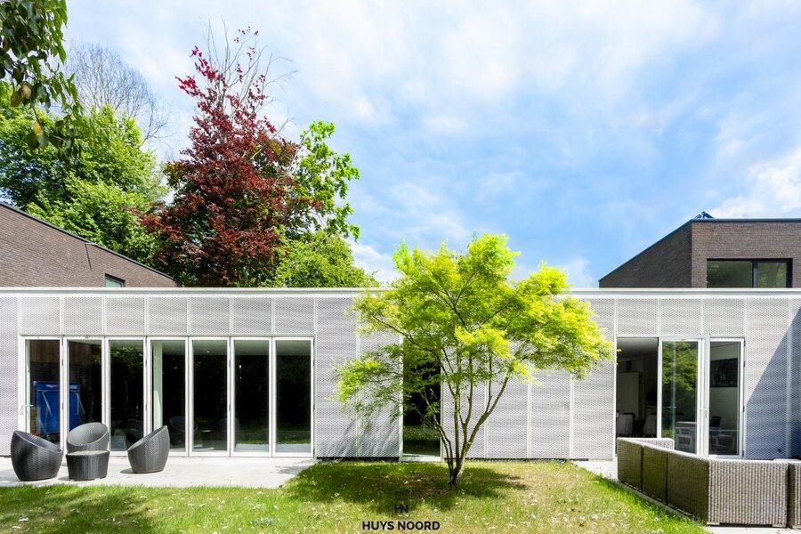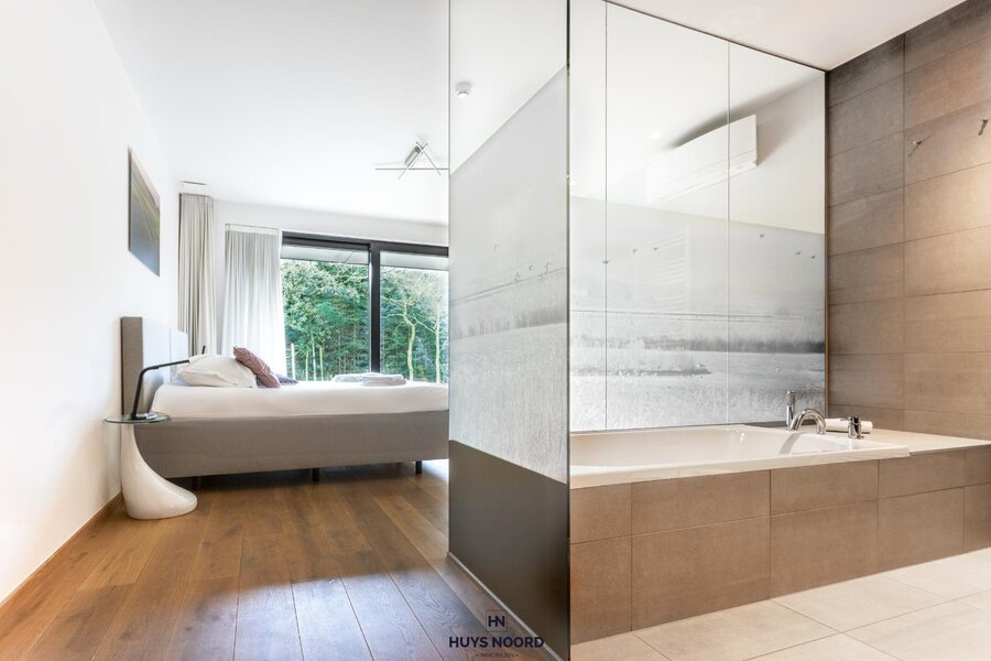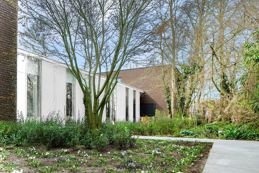 Het linkergedeelte beschikt over een aparte inkom met vestiaire en leidt naar een lichtrijke leefruimte en een open keuken met kookeiland, voorzien van hoogwaardige toestellen. Op de begane grond bevindt zich de masterbedroom met en-suite badkamer en dressing. De eerste verdieping telt twee extra slaapkamers, een badkamer met inloopdouche en een ontspanningsruimte.