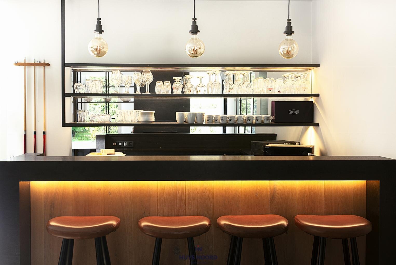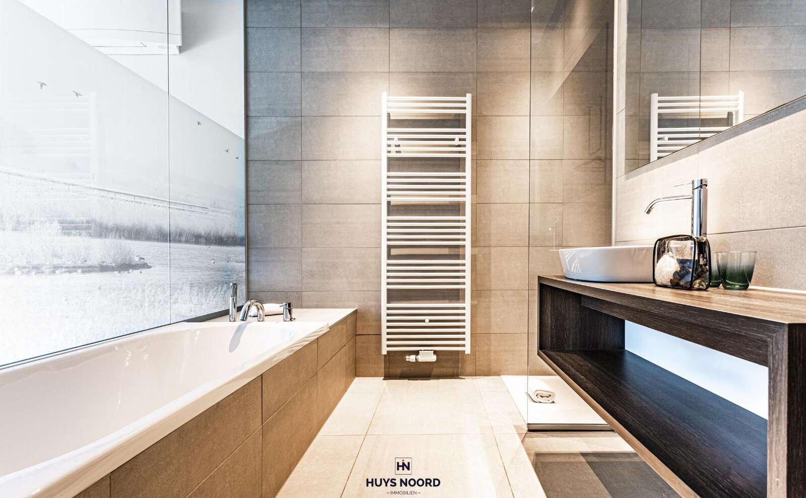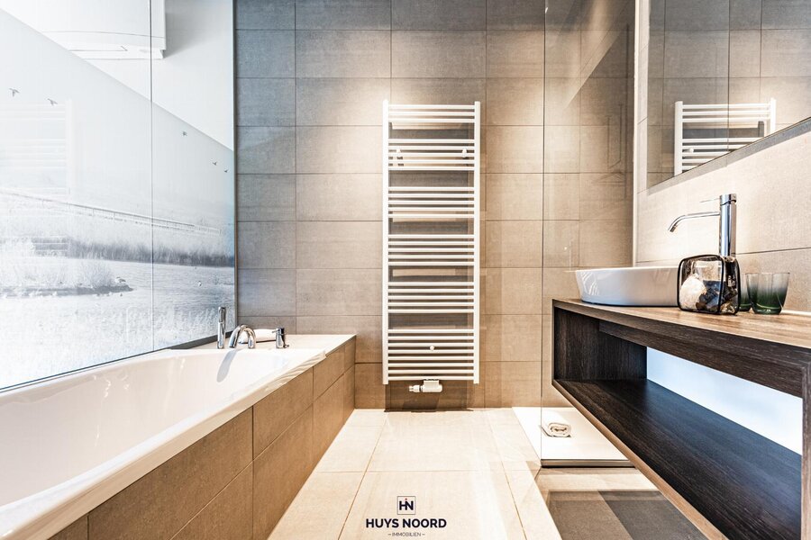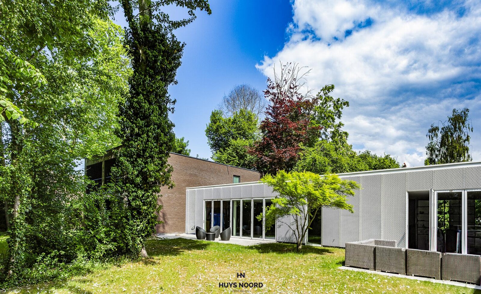 Het linkergedeelte beschikt over een aparte inkom met vestiaire en leidt naar een lichtrijke leefruimte en een open keuken met kookeiland, voorzien van hoogwaardige toestellen. Op de begane grond bevindt zich de masterbedroom met en-suite badkamer en dressing. De eerste verdieping telt twee extra slaapkamers, een badkamer met inloopdouche en een ontspanningsruimte.