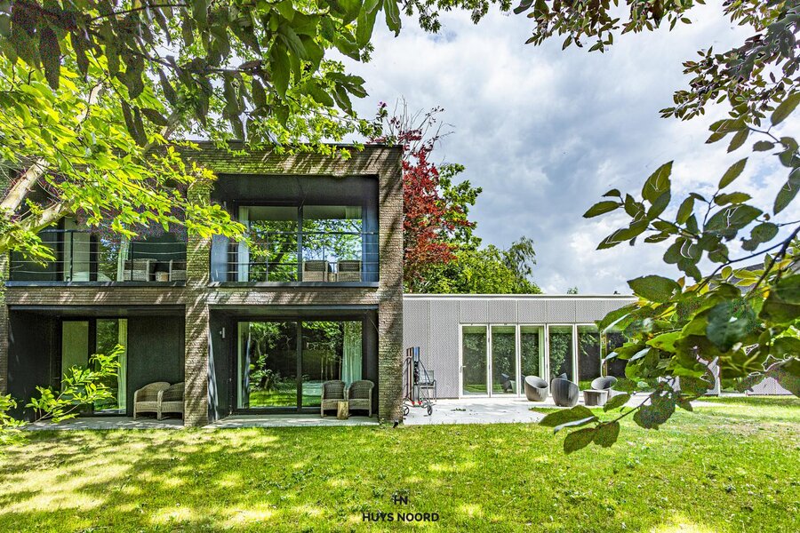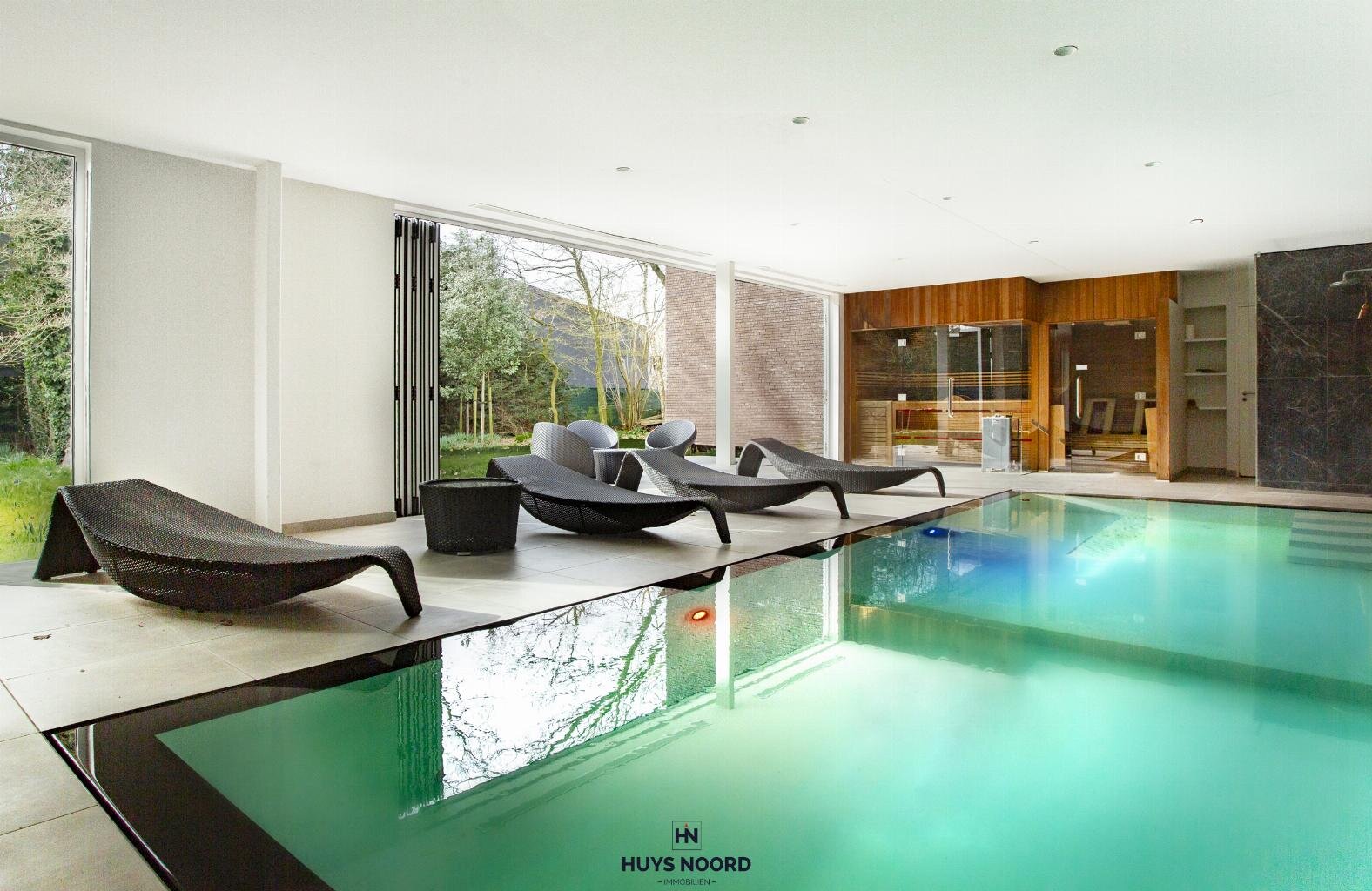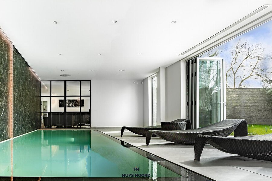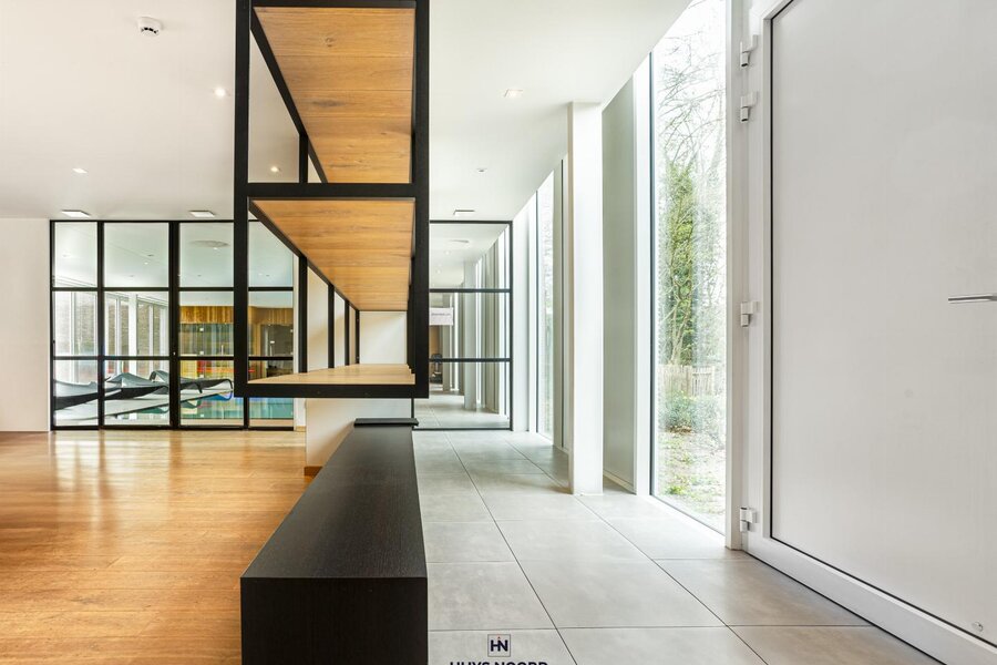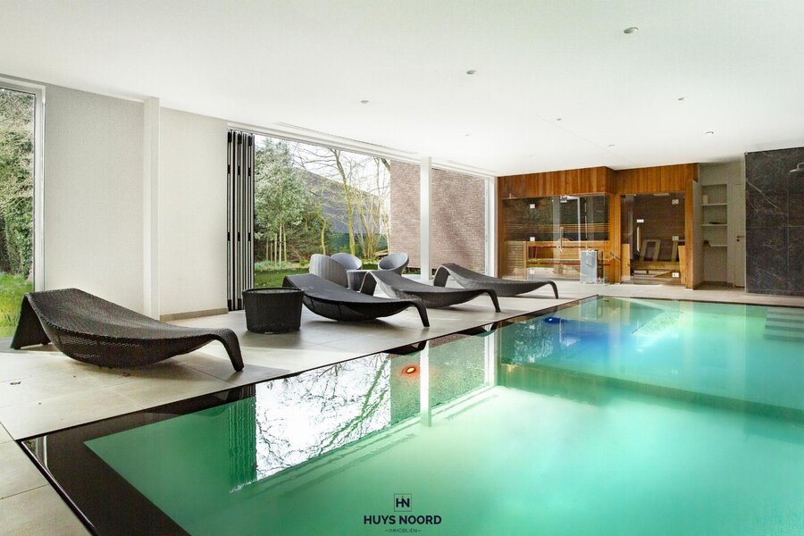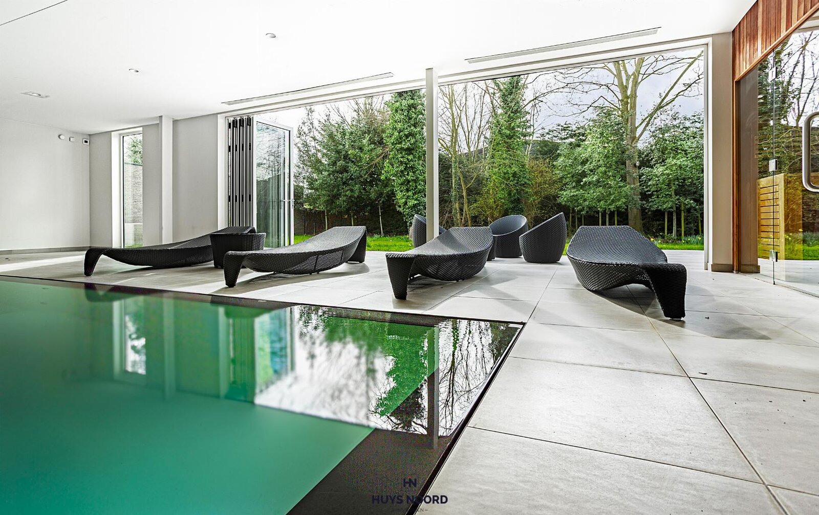 Een lange privé-oprit leidt naar de villa, waar een ruime parking plaats biedt aan minstens tien voertuigen. De woning bestaat uit twee afzonderlijke volumes, verbonden door een stijlvol tussenvolume met een binnenzwembad, wellness, Een indrukwekkend, opendraaiend raam van zeven meter laat binnen en buiten naadloos in elkaar overlopen, zodat je het hele jaar door optimaal geniet van deze exclusieve faciliteiten.