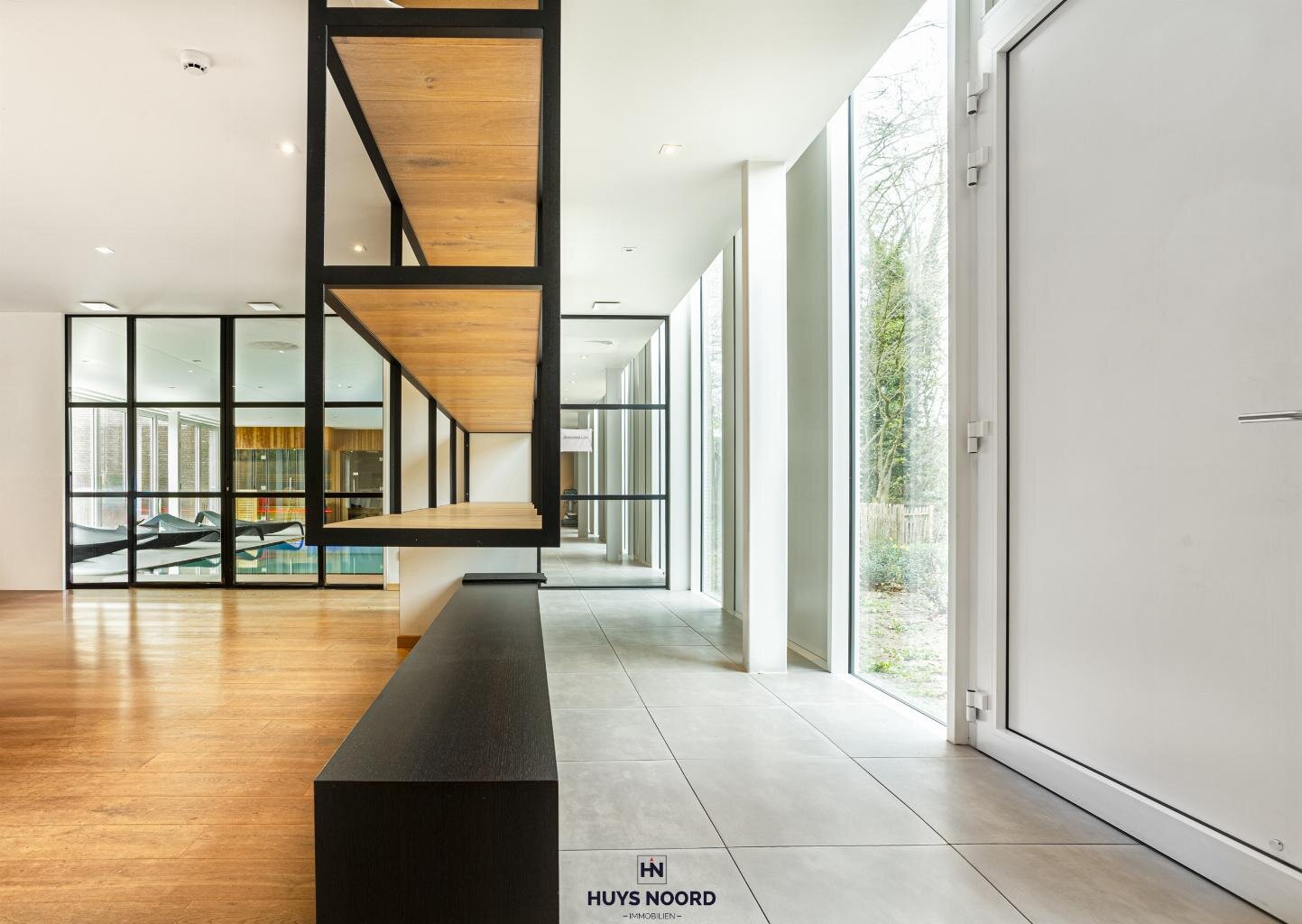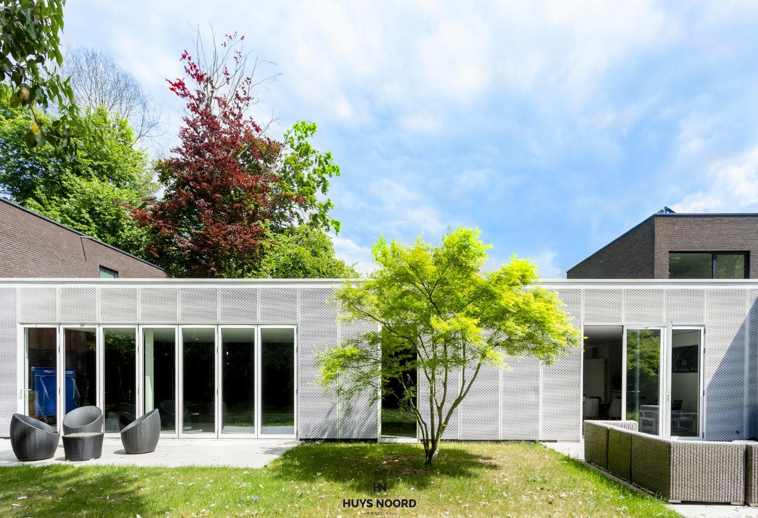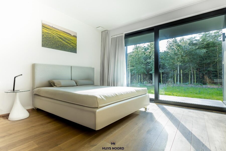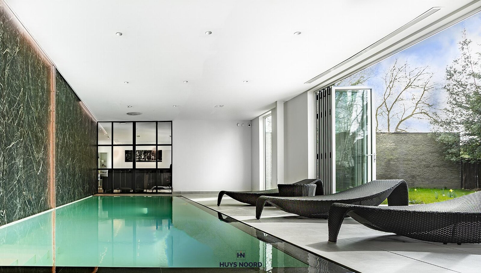 Een lange privé-oprit leidt naar de villa, waar een ruime parking plaats biedt aan minstens tien voertuigen. De woning bestaat uit twee afzonderlijke volumes, verbonden door een stijlvol tussenvolume met een binnenzwembad, wellness, Een indrukwekkend, opendraaiend raam van zeven meter laat binnen en buiten naadloos in elkaar overlopen, zodat je het hele jaar door optimaal geniet van deze exclusieve faciliteiten.