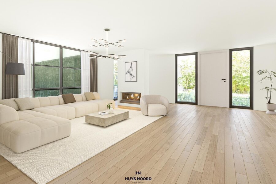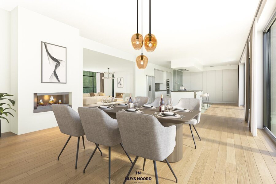 OP het gelijkvloers vinden we eveneens een grote leefruimte, living, overdekt terras.