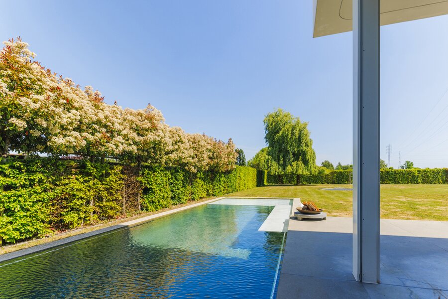 In 2012 ontwierp architect Hansi Ombregt deze top notch moderne luxevilla in het groen, een fantastisch walhalla van 680m2 bewoonbare oppervlakte op een perceel van 2360 m2. Licht en ruimte, split-levels, dubbele hoogtes... In elk hoekje word je getrakteerd op een boeiende architecturale beleving, waar iedereen wel een plekje vindt om rustig alleen of net gezellig samen te zijn.