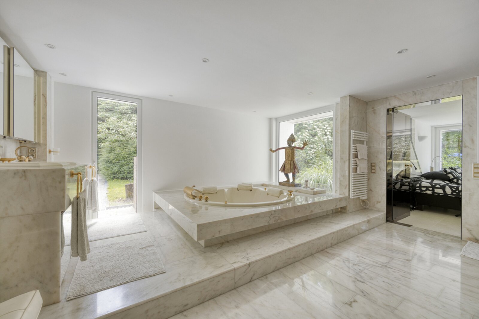 Deze unieke eigendom is rustig gelegen (achterliggend perceel) omringd door een prachtige tuin ±59a05ca. De villa heeft een bewoonbare oppervlakte van ±500m² en is als volgt ingedeeld: inkomhal met ingebouwde vestiaire – gastentoilet met lavabo – leefruimte + eetkamer (±68m²) met open haard en toegang tot het hoofdterras – bureau/tweede ontvangstruimte (±28m²) open naar de leefruimte en met toegang tot het tweede terras met ingebouwde barbecue – volledig uitgeruste keuken (dubbele lavabo, oven, vaatwasser, inductiekookplaat, ingebouwde friteuse en Amerikaanse koelkast) (±31m²) met ontbijthoek en ook toegang tot het hoofdterras – master suite (±58m²) met dressing en badkamer (bubbelbad, dubbele wastafel, douche en toilet) – 2 slaapkamers (±10m² en ±16m²), elk met eigen douchekamer (douche, wastafel), waarvan één met toegang tot de tuin – apart toilet – te renoveren wellnessruimte met binnenzwembad, sauna, douchekamer, toilet en kleedruimte – garage voor 3 wagens – wasruimte (±40m²) – gastentoilet.