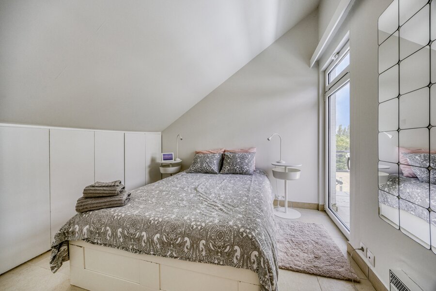 Op de eerste verdieping: 2 slaapkamers (±10m² en ±10m²), elk met wastafel en waarvan één met balkon – apart toilet – opbergruimte/zolder.