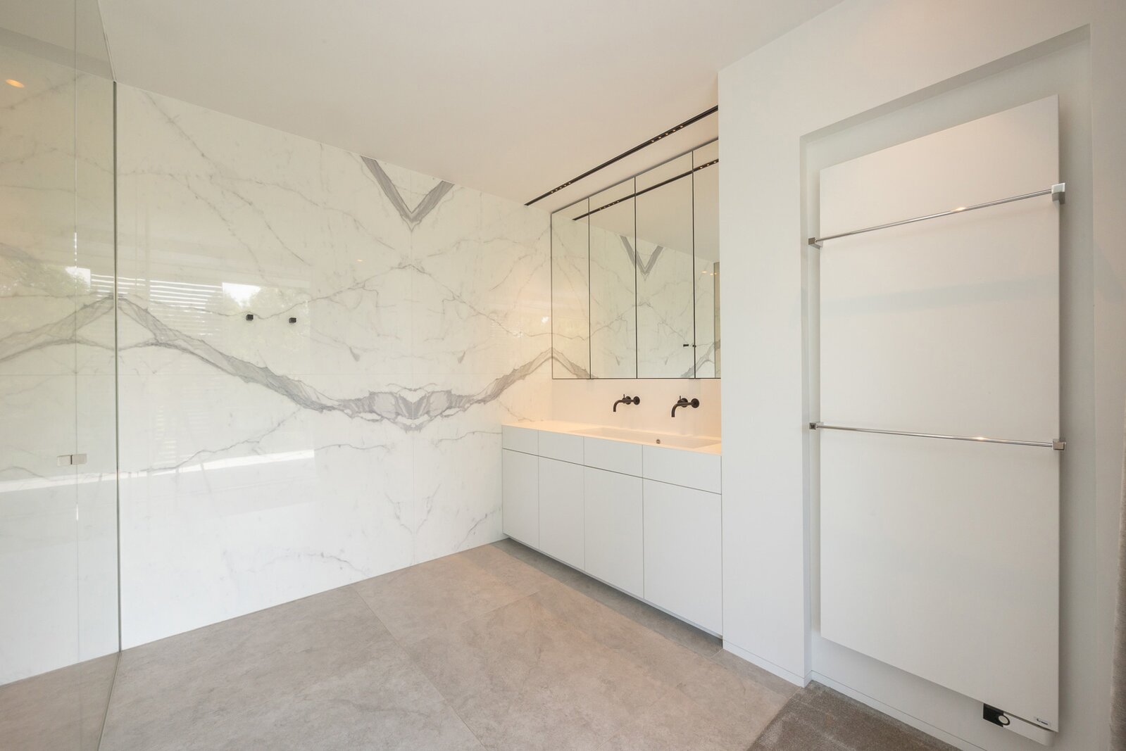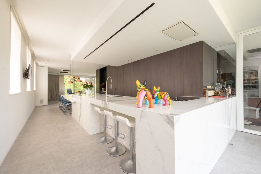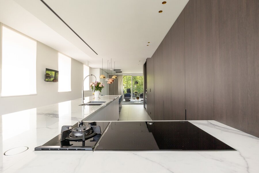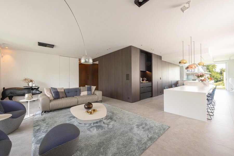 De volledig uitgeruste leefkeuken van maar liefst 44m² is een echte blikvanger met een kookeiland, een ontbijthoek en composieten werkblad in carrara marmerlook. Alle ingebouwde toestellen van het merk Neff, waaronder een inductiekookplaat, wok gasbrander, vaatwasmachine, microgolf combi-oven en oven met stoomfunctie. De dubbele Liebherr combi ijskast/vriezer is uitgerust met geïntegreerde ijsblokjesmachine.