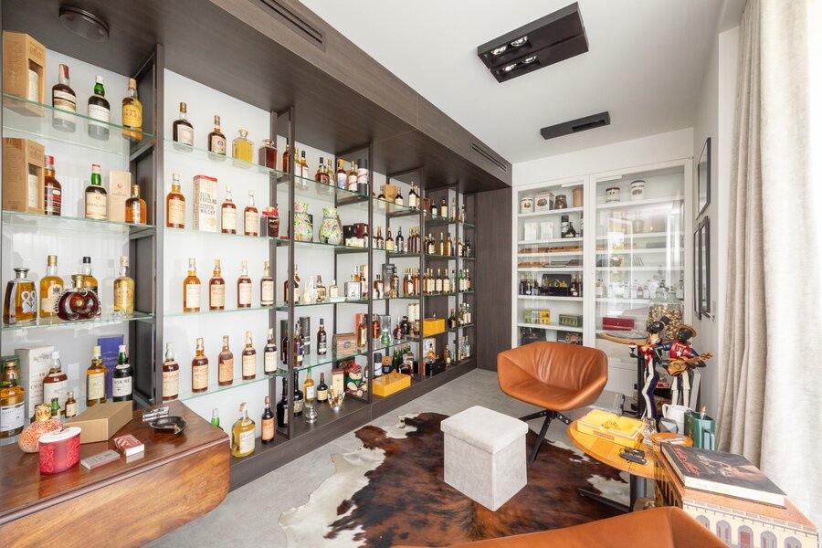 De royale woonkamer 44m² is afgewerkt met tegels in natuursteenlook en beschikt over een elegante barkast met ingebouwde frigo. Een aangrenzende bibliotheekkamer van 16m² is eveneens in natuursteenlook betegeld en bevat een veiligheidskast met humidor.