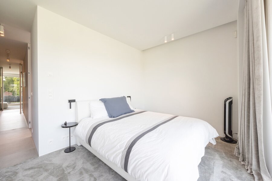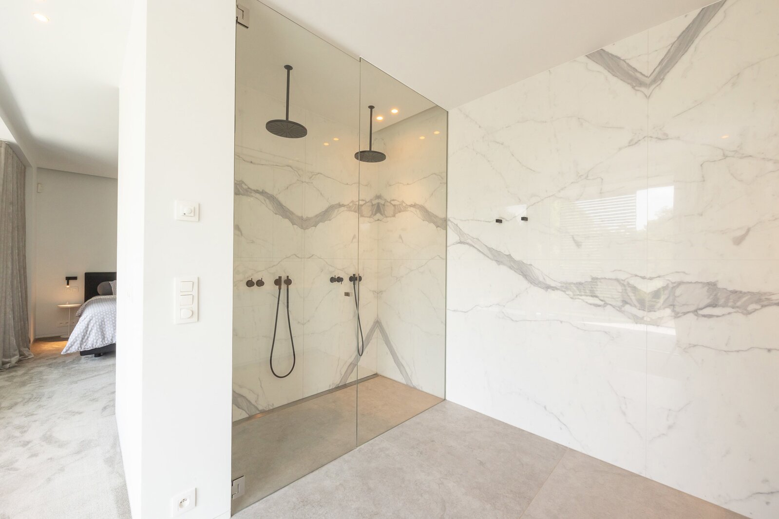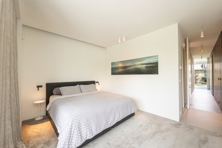 De hoofdslaapkamer 17m² is afgewerkt met vasttapijt en uitgerust met een Starck toilet voorzien van een Geberit Aquaclean module. De aangrenzende dressing 12m² en de hoofdbadkamer 12m² zijn beiden betegeld met natuursteenlook. De badkamer beschikt over een dubbele douche met rainshowers, een dubbel lavabomeubel met spiegelkasten en een aansluiting voor een bad.