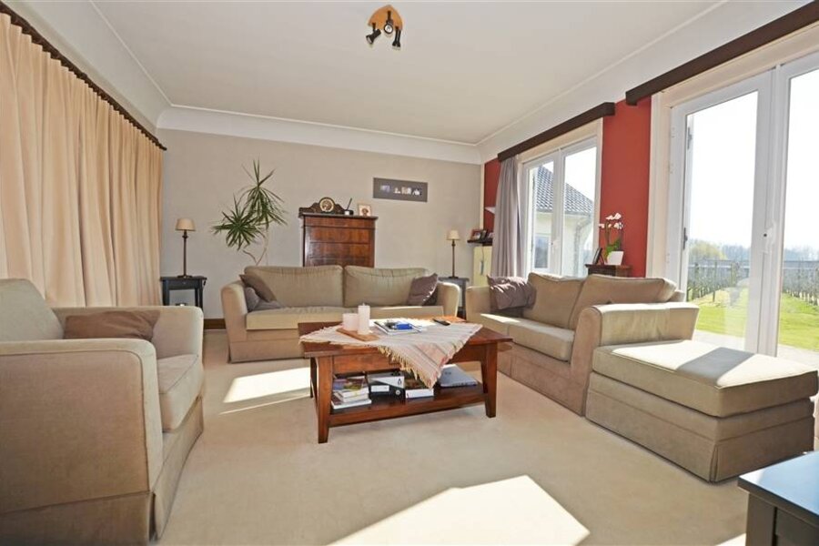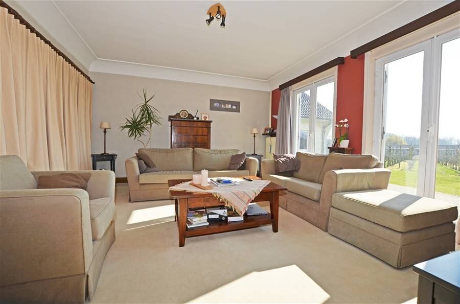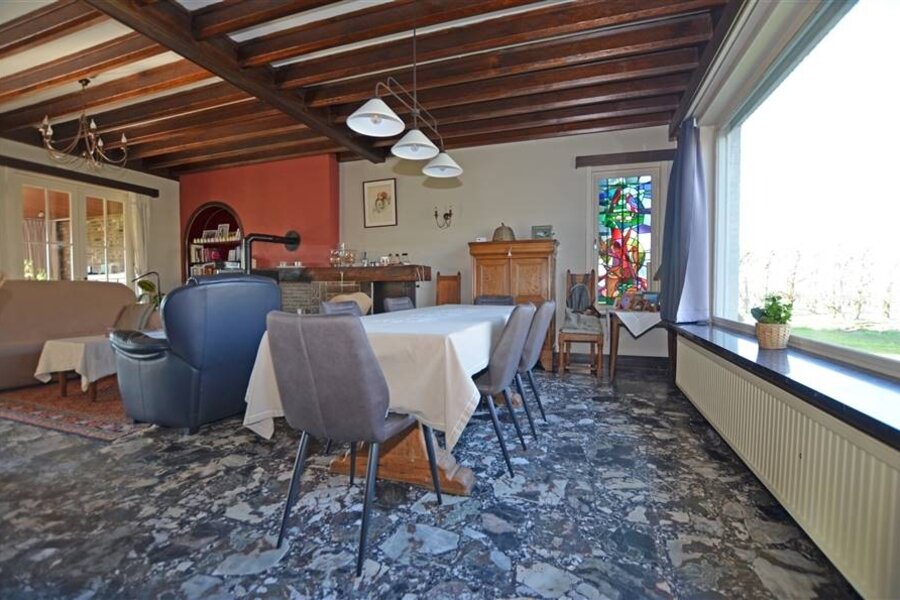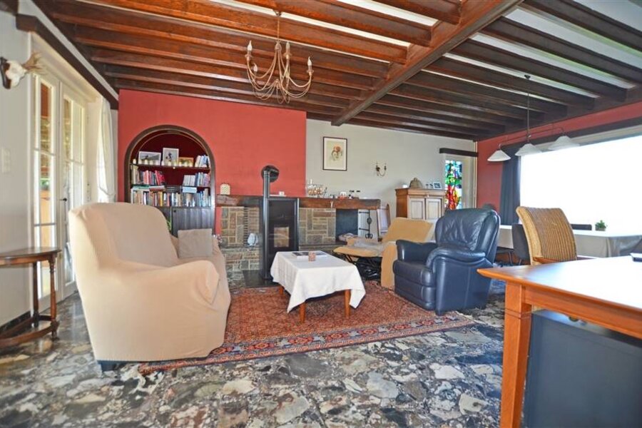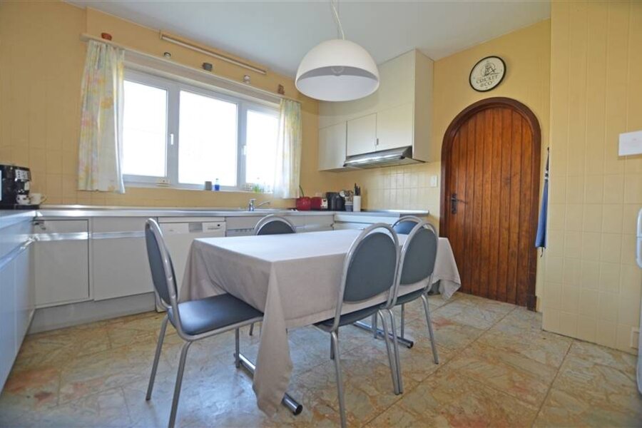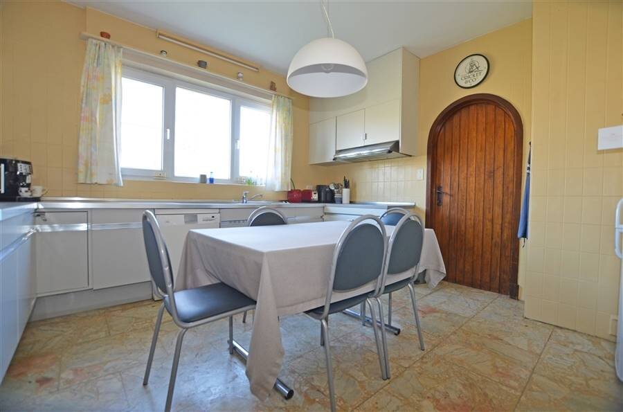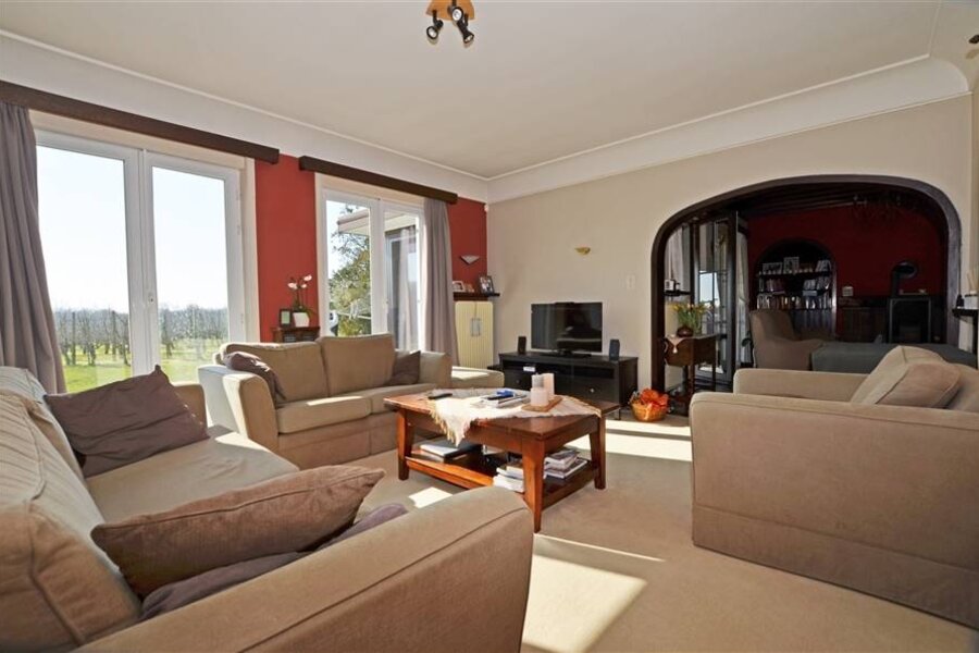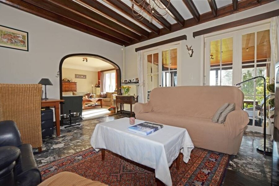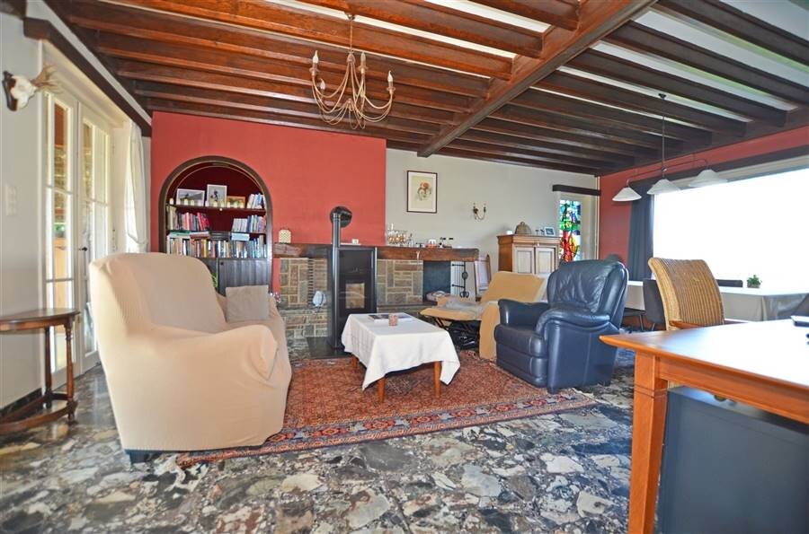 Deze klassieke villa werd gebouwd in ±1966 en resulteerde in een mooie gezinswoning. Via de inkomhal met gastentoilet bereiken we de aangename leefruimte. Deze bestaat uit een open aaneenschakeling van een zithoek, een ruime eetkamer met haard die een gezellige touch geeft aan deze ruimte en een tuinkamer met zicht op de achterliggende plantages. Aansluitend bevindt zich een leefkeuken en een bijkeuken/wasplaats.