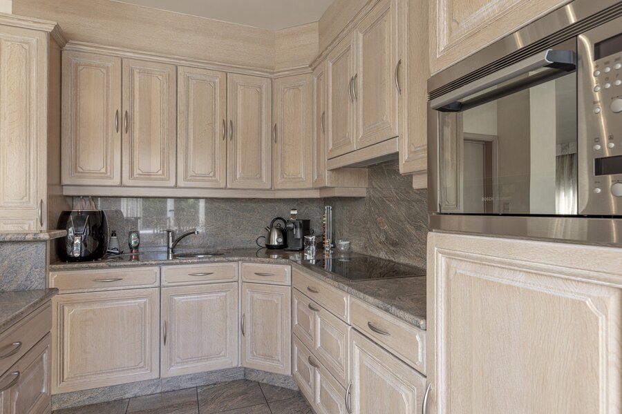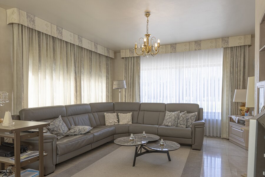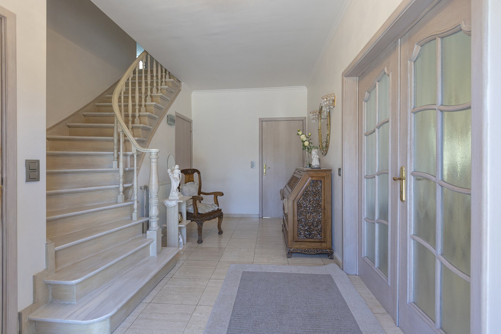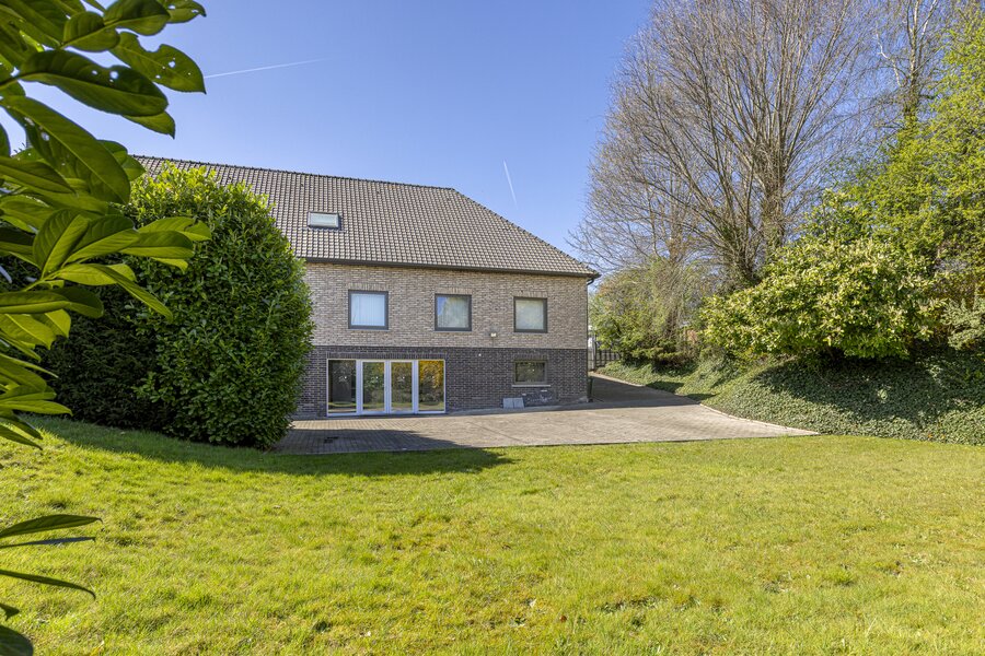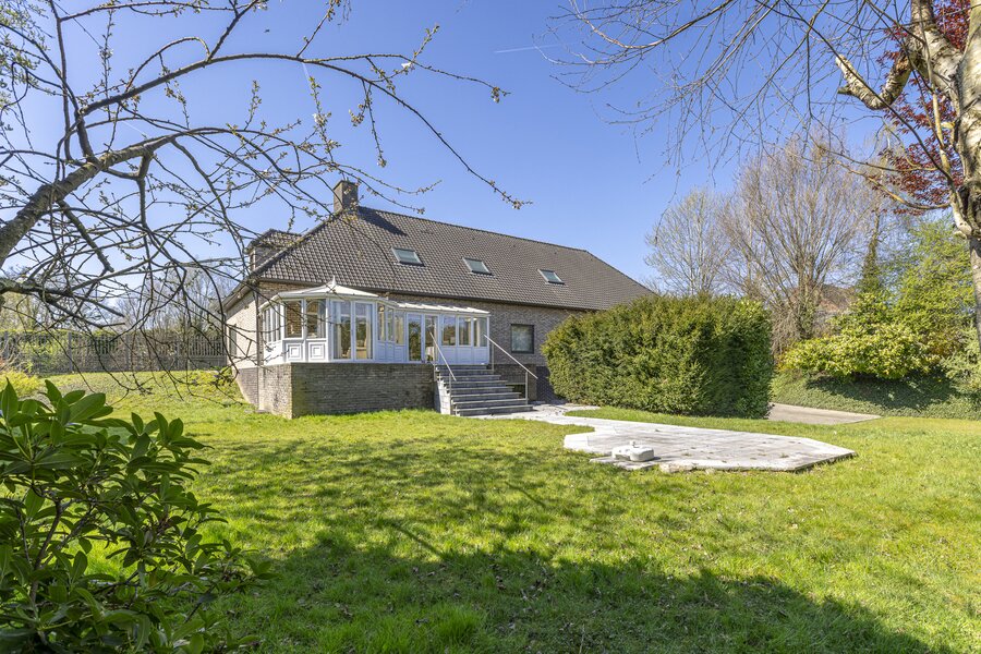 De woning beschikt over een statige inkomhal met gastentoilet, een lichtrijke leefruimte met open keuken, een aangename veranda en directe toegang tot het terras en de tuin – een oase van rust.