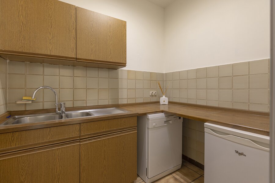 Bij binnenkomst word je verwelkomd in een royale inkomhal met aparte wachtruimte. Deze biedt toegang tot een ruime kantoorruimte (126,5 m²), voorzien van een kitchenette en twee afzonderlijke sanitaire voorzieningen.
