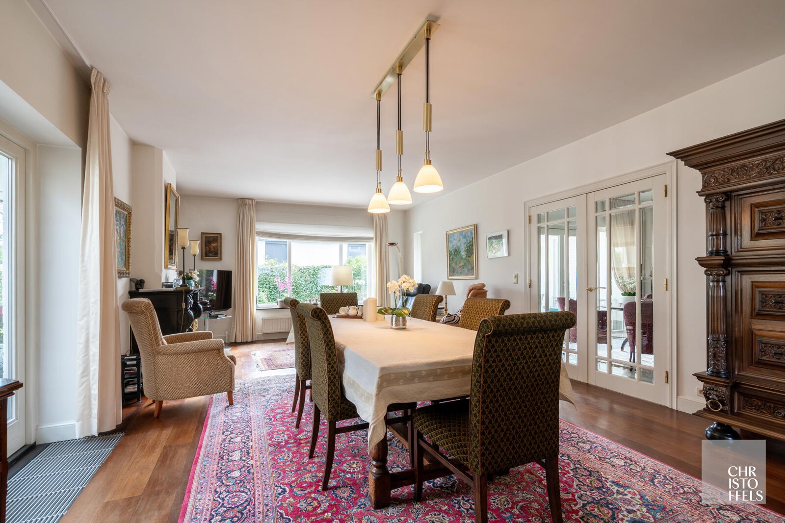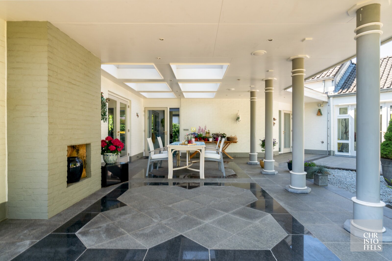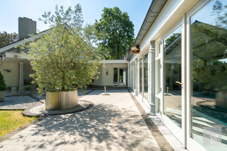 De villa beschikt over een ruime inkomhal met vestiaire en gastentoilet, die toegang biedt tot een centrale ontvangst- en leefruimte. Aansluitend bevinden zich een zitkamer met gashaard, een afzonderlijk thuiskantoor en een eetkamer die naadloos overgaat in de open leefkeuken met centraal kookeiland. Een ruime bijkeuken verbindt het leefgedeelte met de dubbele inpandige garage.
