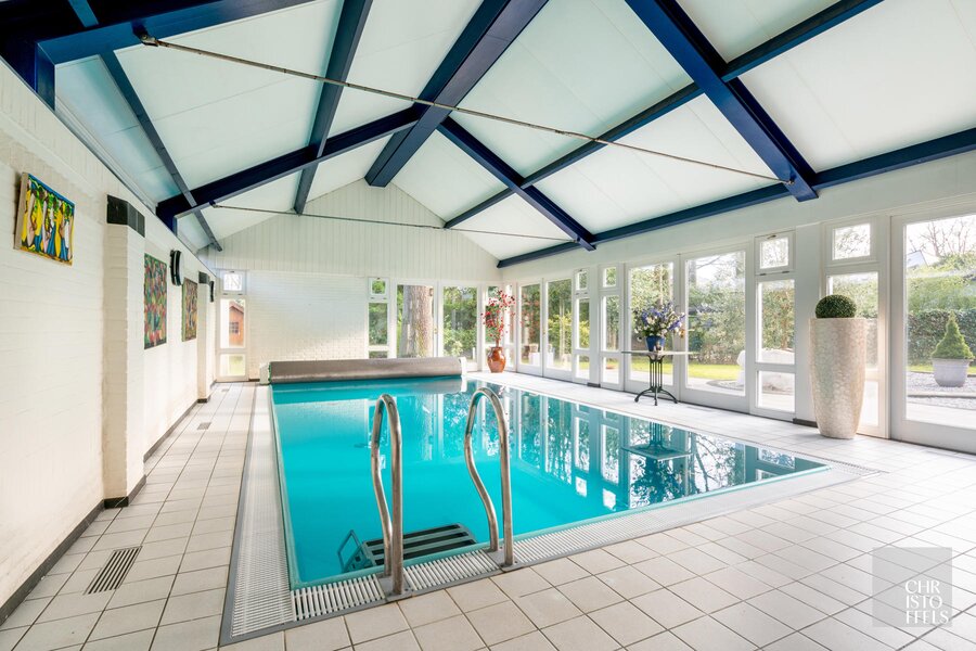 Aan de tuinzijde is een wellnessruimte voorzien, uitgerust met een binnenzwembad dat via een grote glaspartij rechtstreeks uitkijkt op de aangelegde tuin. De wellness beschikt tevens over een aparte doucheruimte en toilet. De volledige benedenverdieping is hoogwaardig afgewerkt met massieve hardhouten parketvloeren en natuursteen.