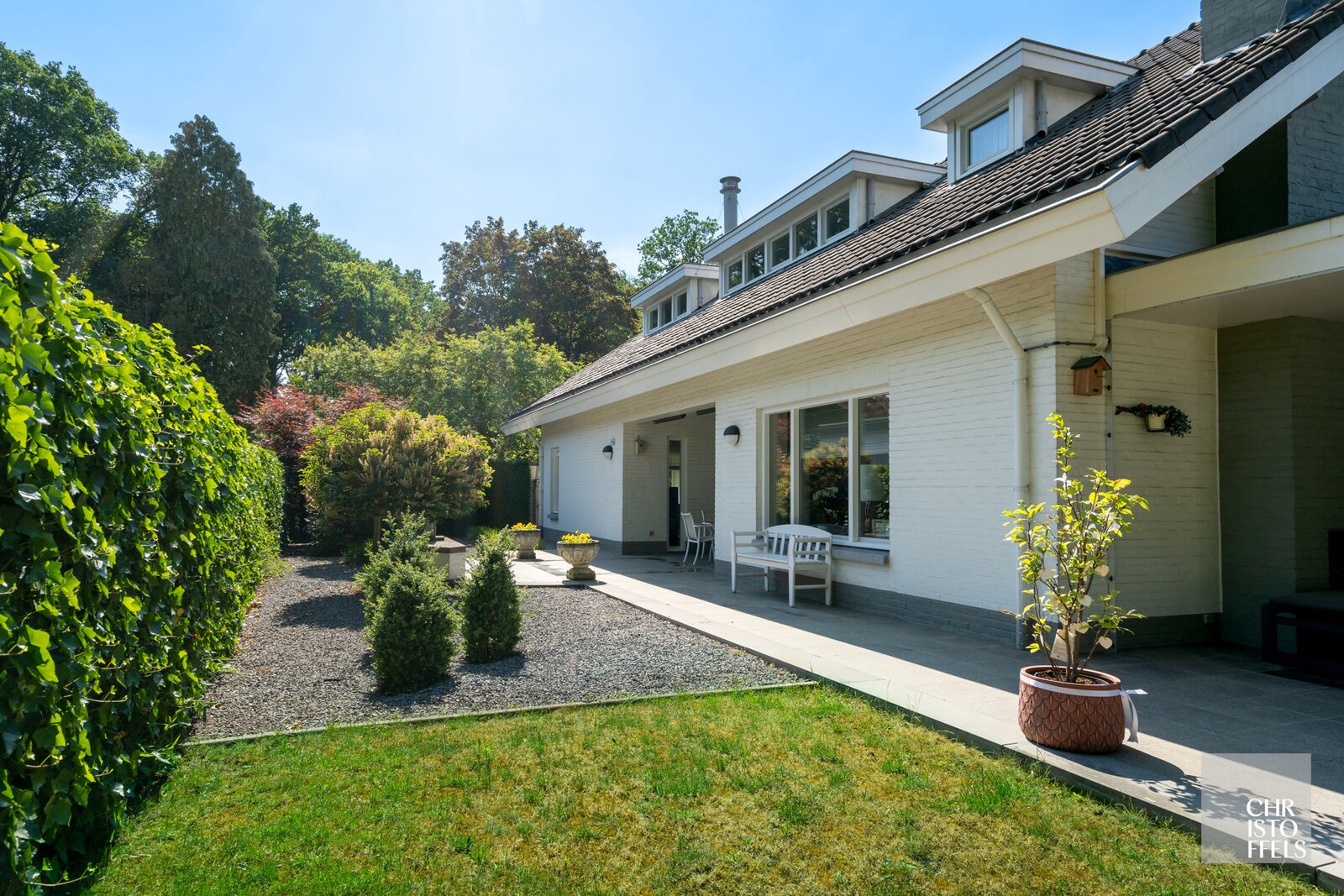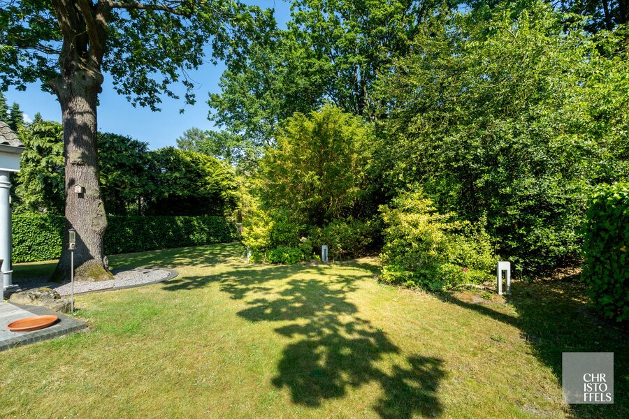 De woning is deels onderkelderd; in deze ruimte zijn de technische installaties van het binnenzwembad ondergebracht. De zuidoostelijk georiënteerde tuin beschikt over een groot overdekt terras en is volledig omheind. Achterin bevindt zich een houten blokhut met extra slaapgelegenheid, een toilet en een wastafel — ideaal als gastenverblijf of poolhouse.