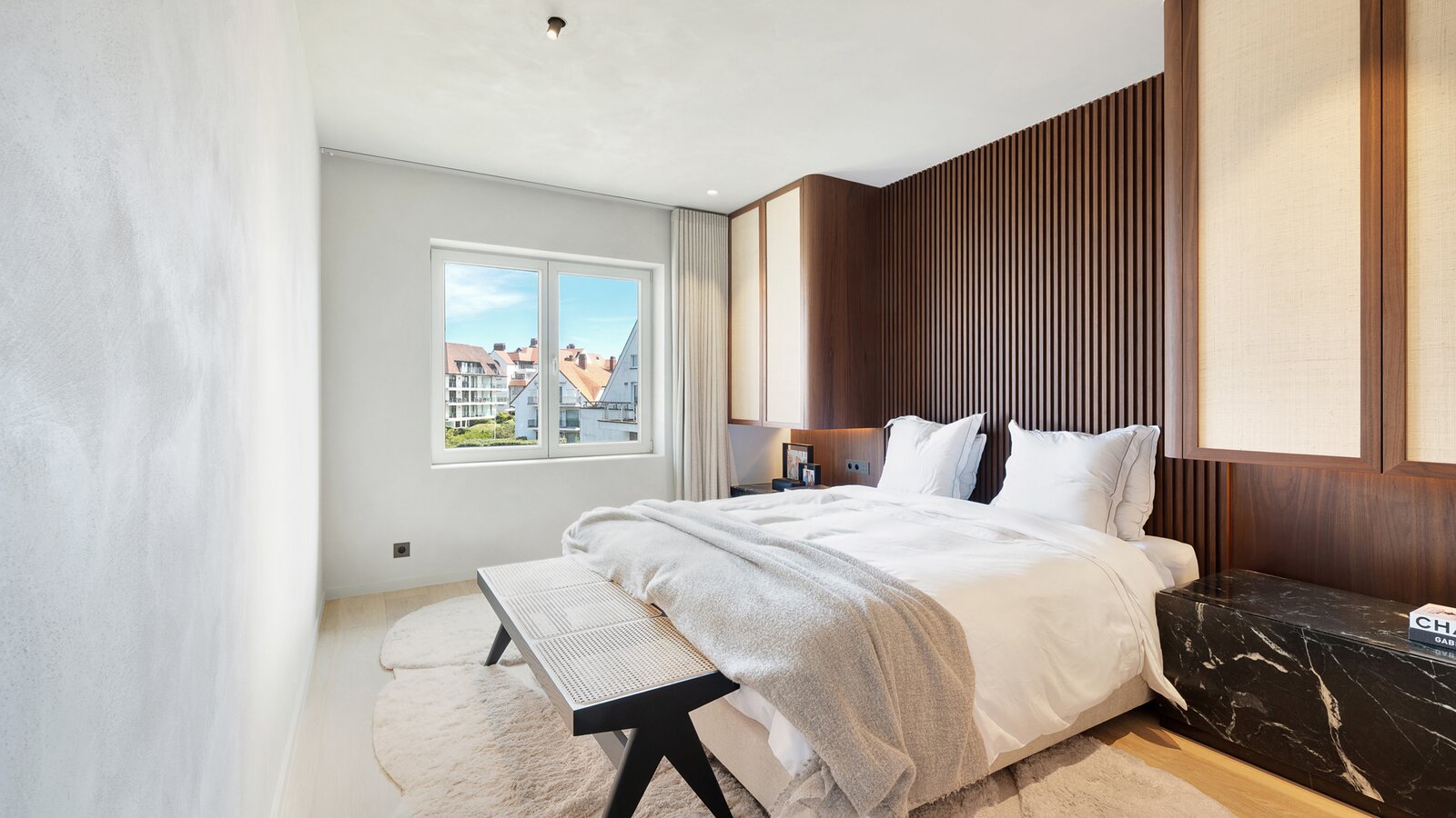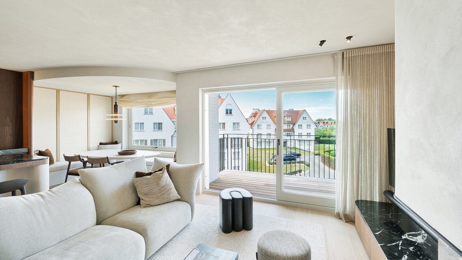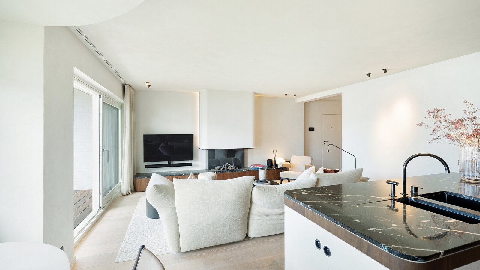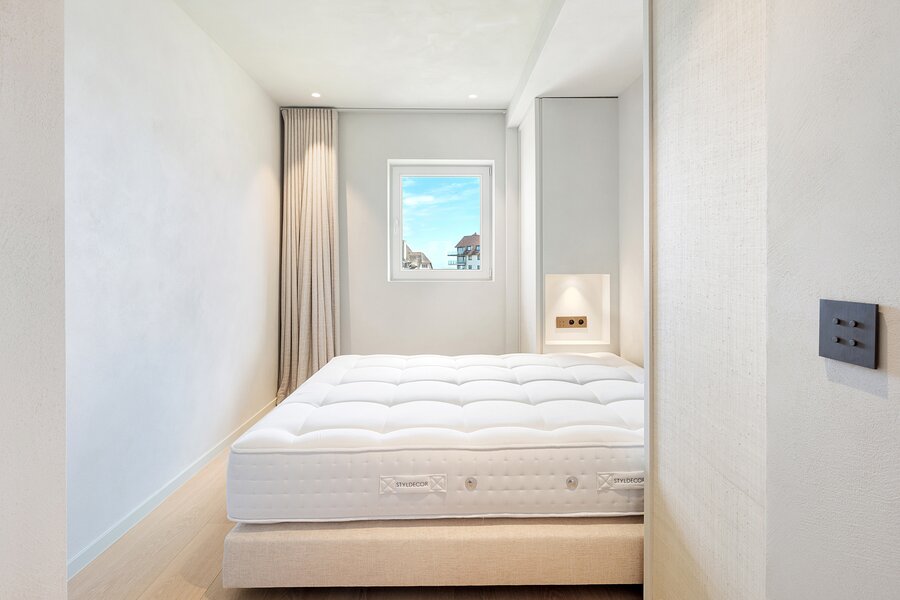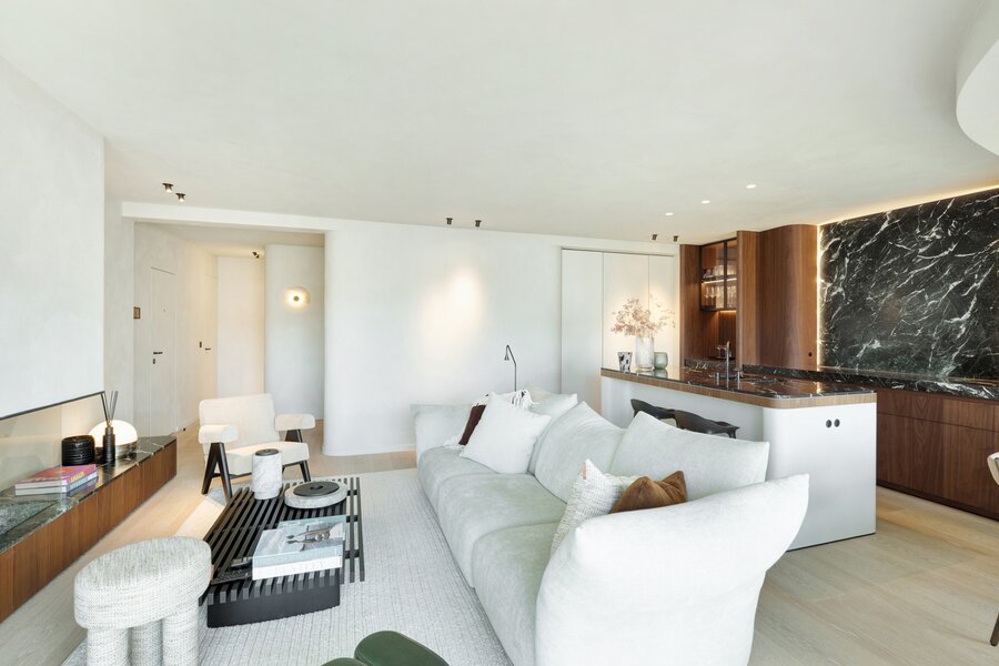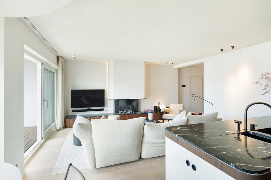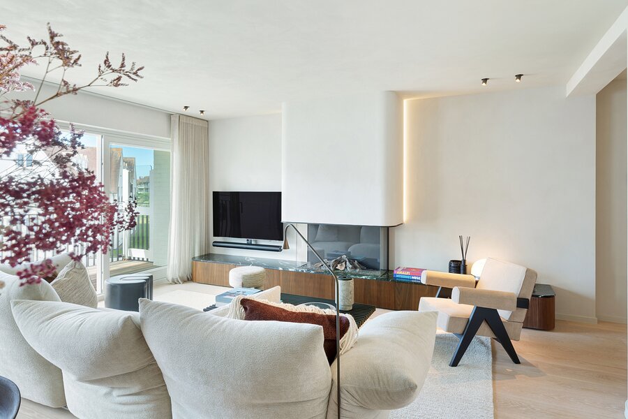 Bij het betreden van het appartement wordt u verwelkomd in een ruime inkomhal met vestiaire en gastentoilet. De indrukwekkend brede leefruimte is voorzien van een elegant salon met gashaard en opent naadloos naar het perfect georiënteerde zonneterras.