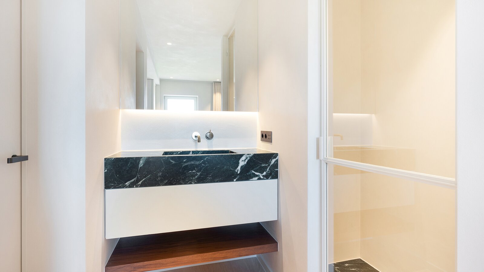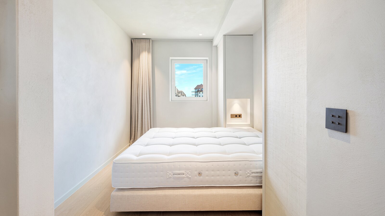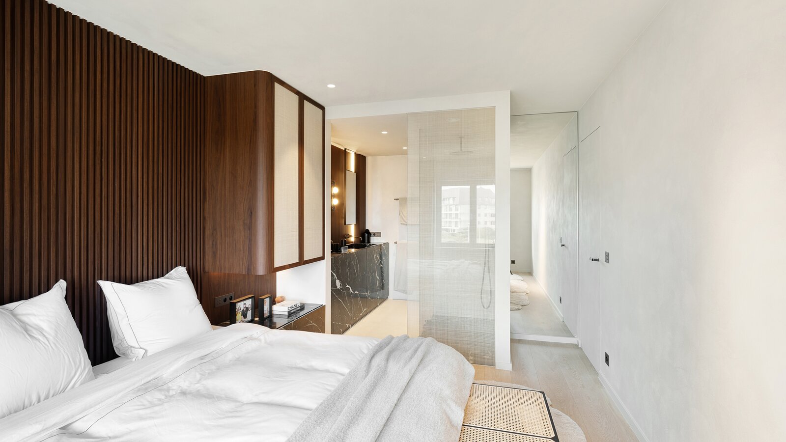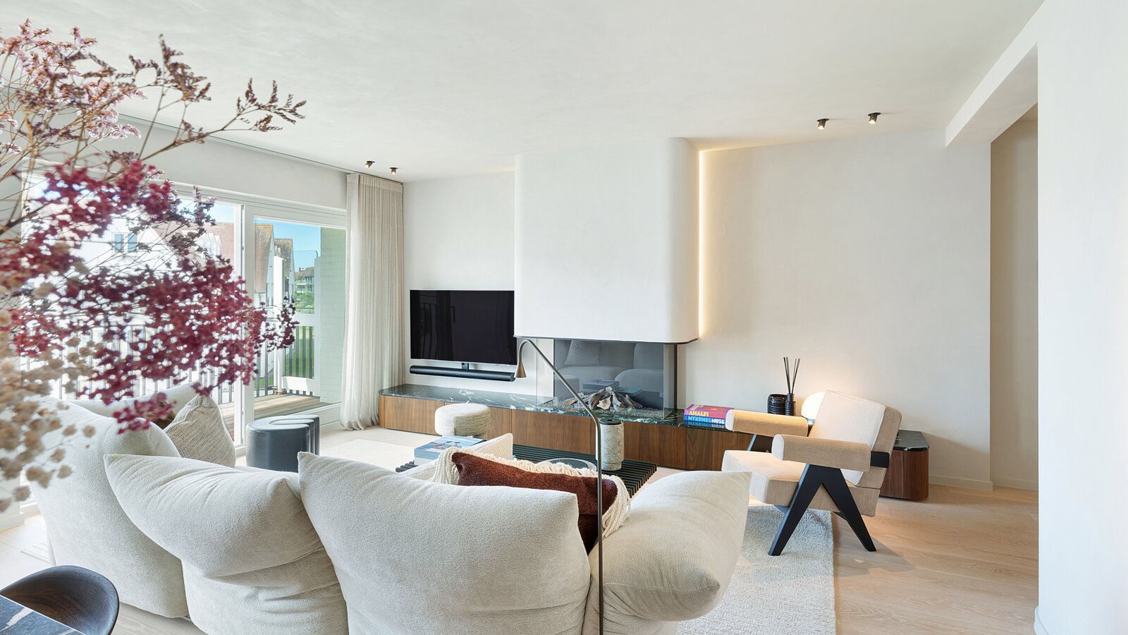 Bij het betreden van het appartement wordt u verwelkomd in een ruime inkomhal met vestiaire en gastentoilet. De indrukwekkend brede leefruimte is voorzien van een elegant salon met gashaard en opent naadloos naar het perfect georiënteerde zonneterras.