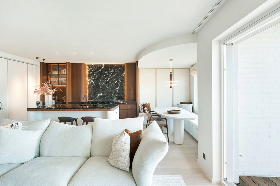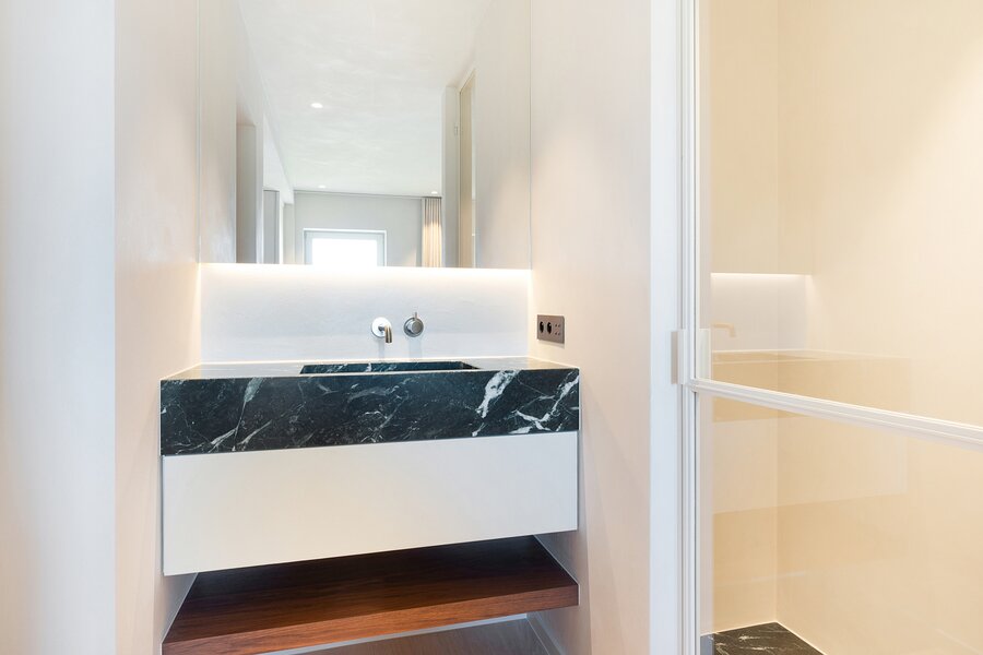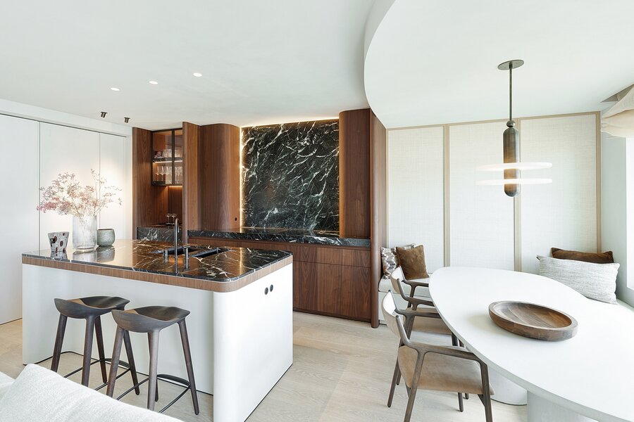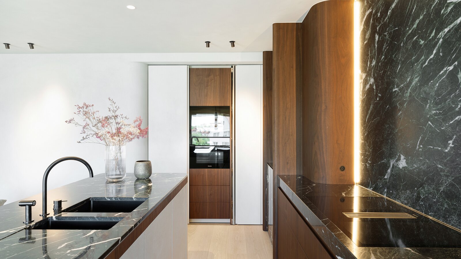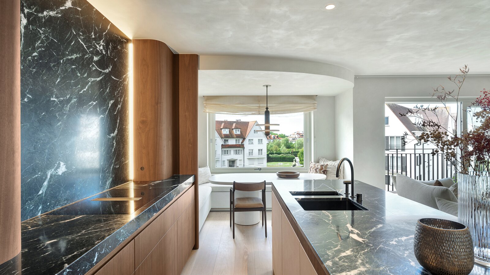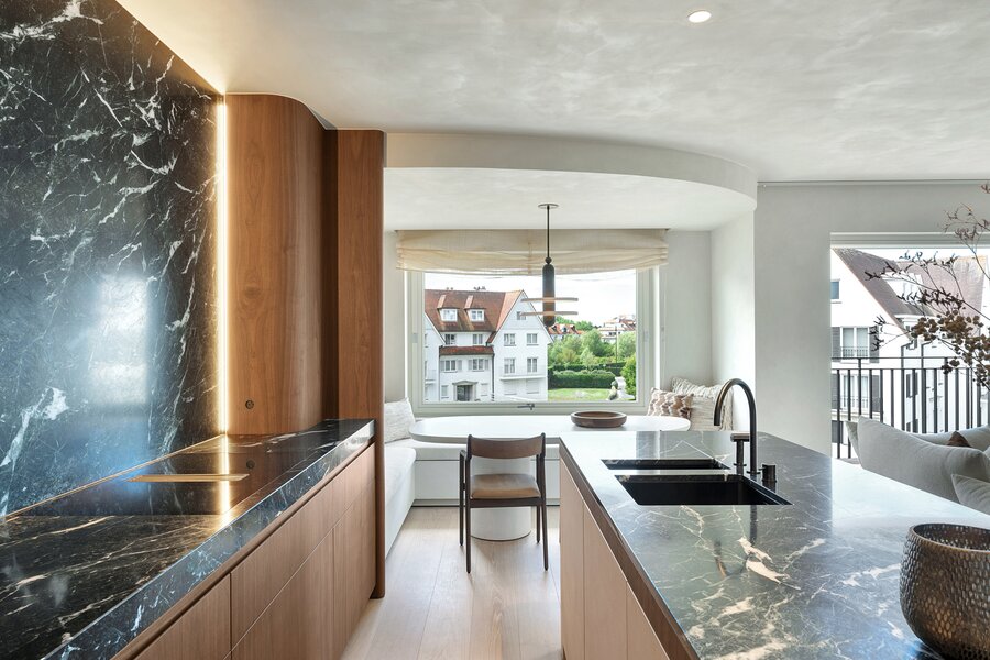De leefkeuken, uitgerust met Miele-toestellen, met afwerking in marmer straalt tijdloze klasse en verfijning uit. Aansluitend een gezellige eethoek.