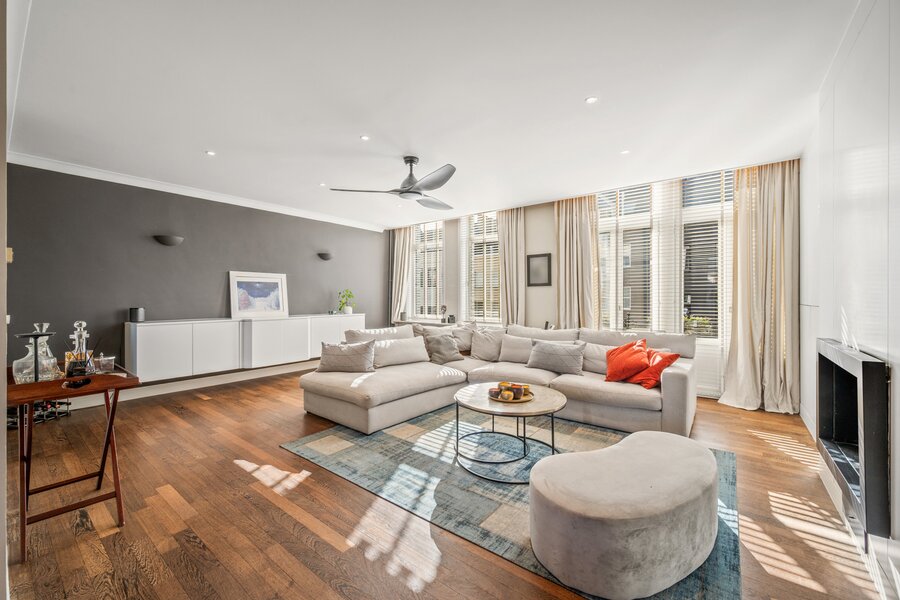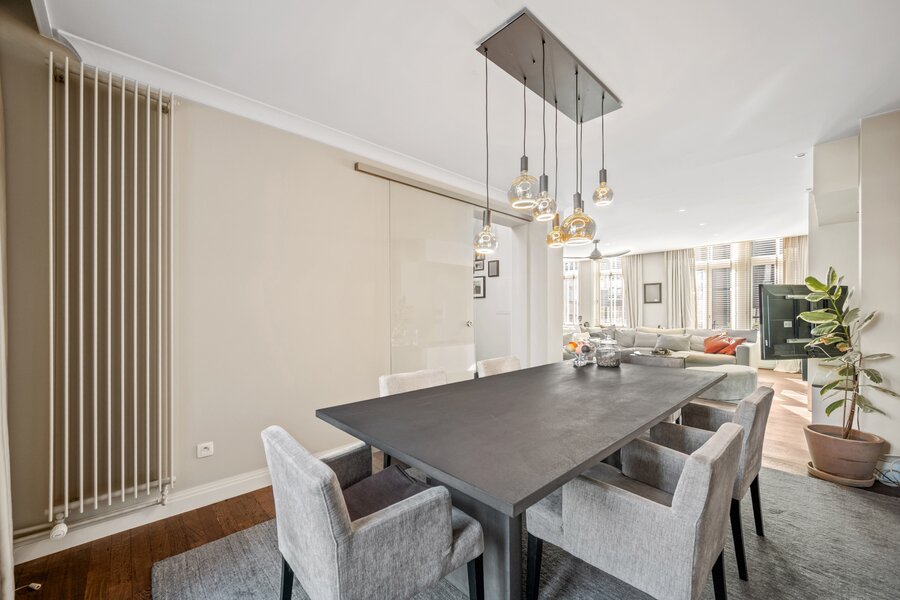 De tweede verdieping biedt een ruime, lichtrijke woonkamer op parketvloer met een open haard. Aansluitend is er een sfeervolle eetkamer en een volledig ingerichte keuken. Achteraan is er op deze verdieping een zeer groot zonnig dakterras met open uitzicht. De derde verdieping heeft drie slaapkamers, waarvan één nu gebruikt wordt als dressing en een badkamer. Op de vierde verdieping is er een zeer grote master bedroom met dressing en luxueuze badkamer en een berging.