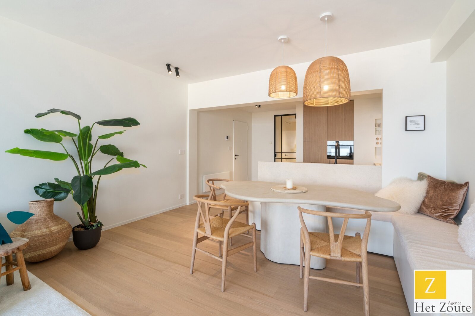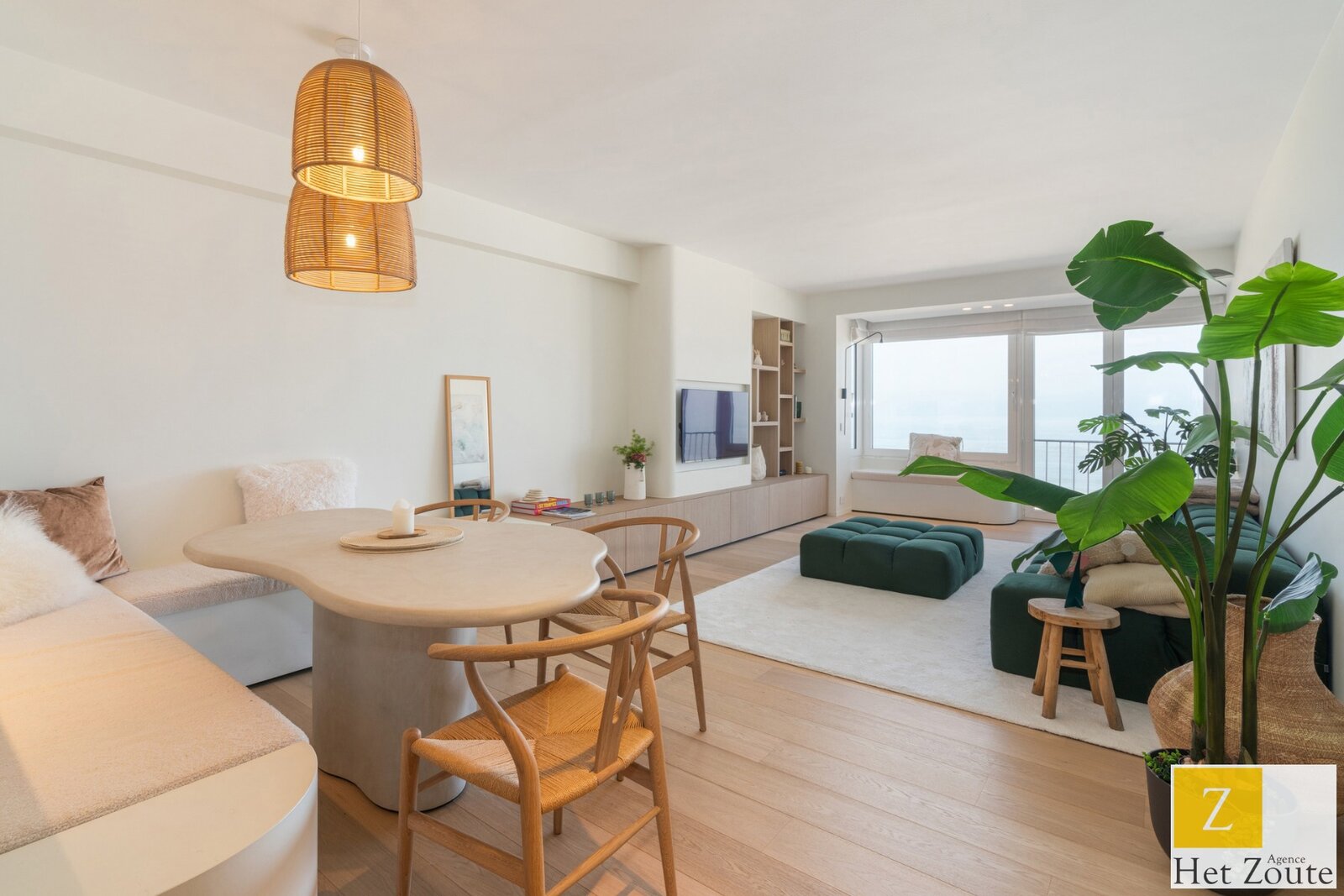 Bij binnenkomst valt het direct op: een open, volledig ingerichte keuken die naadloos overgaat in de eetruimte en de ruime woonkamer. De woonkamer is voorzien van op maat gemaakte kasten, die zowel praktisch als esthetisch zijn, terwijl het panoramische zeezicht de ruimte overspoelt met licht. Dit maakt het appartement tot een ideale plek om te ontspannen en te genieten van de natuur.
