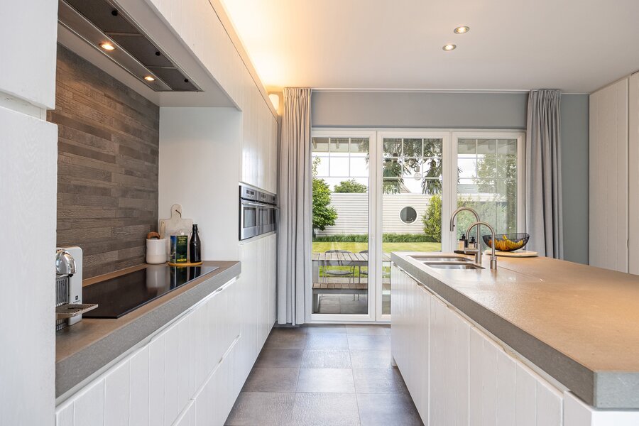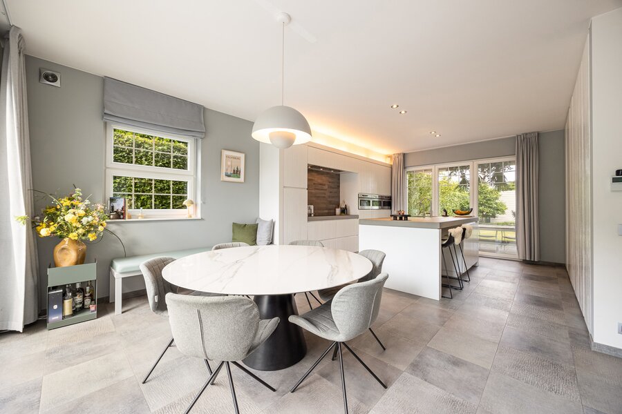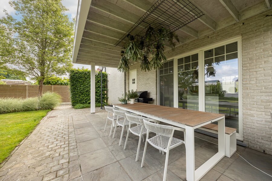 Beschrijving: Binnenkomen doe je in de prachtige inkomhal met apart toilet. Aansluitend bevindt zich de leefruimte met gashaard die doorloopt in de smaakvol ingerichte keuken (Segers interieur) met eiland en eetplaats. Vanuit de keuken heb je 2 mogelijkheden om buiten te zitten, afhankelijk van welk moment op de dag, kan je in de zon of in de schaduw vertoeven. De keuken is voorzien van alle comfort (inductie kookplaat dd. 2024, combi heteluchtoven met microgolf, heteluchtoven, vaatwasser dd. 2025, grote ijskast, aparte heetwaterkraan). Van zowel deze leefkeuken als de living heb je zicht op de terrassen en de onderhoudsvriendelijke tuin die aangelegd is incl. beregening.