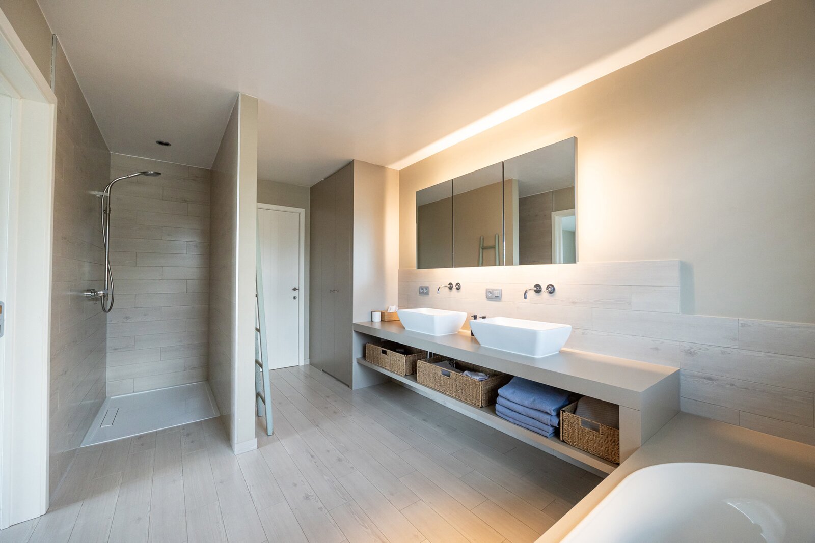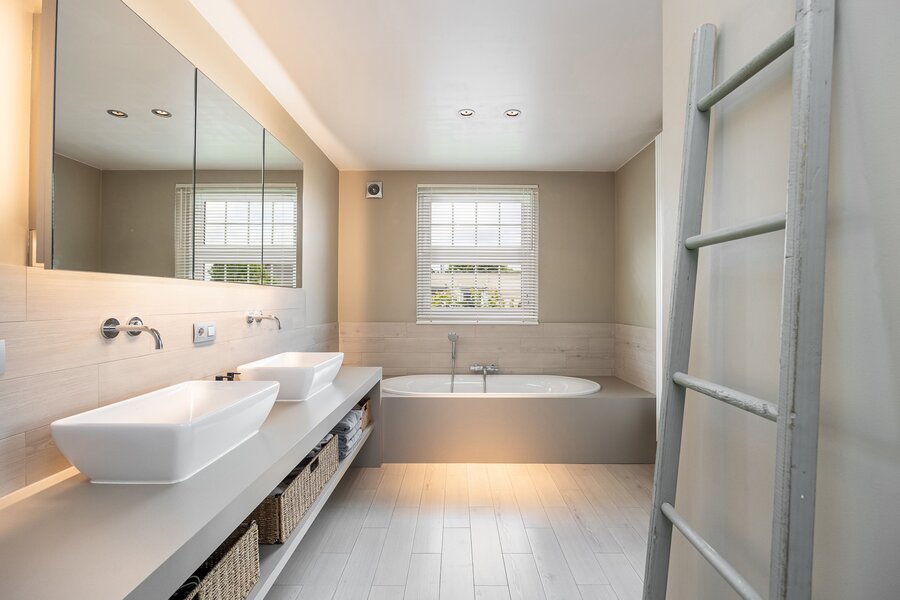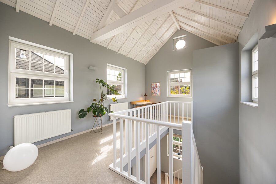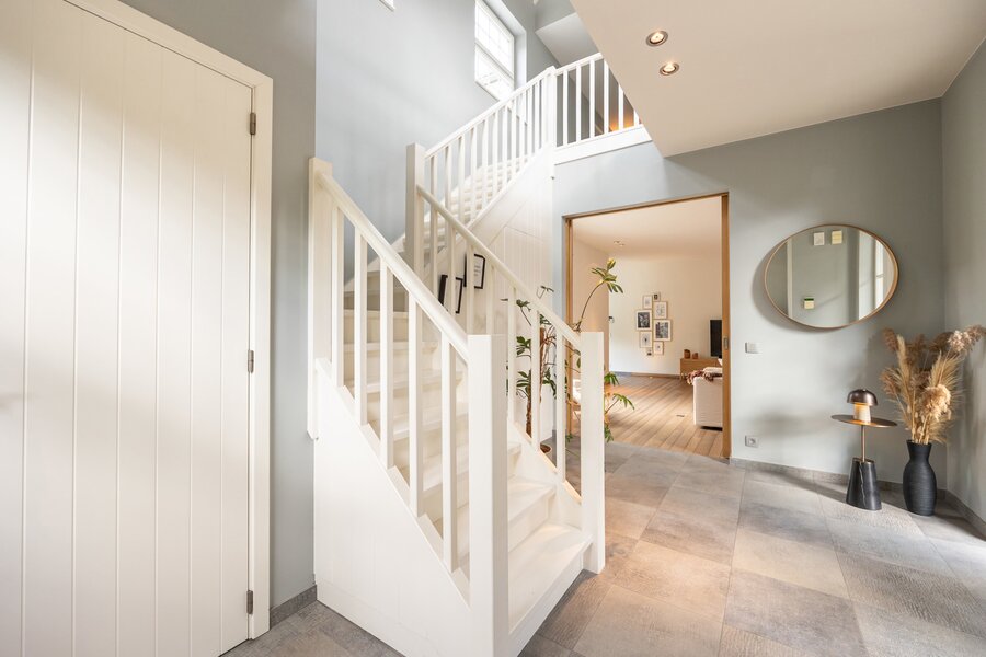 Via de houten trap in de lichtovergoten traphal betreed je de verdieping. Hier vinden we naast het aparte toilet en royale overloop, een eerste ruime kinderkamer. Lopen we verder, komen we in de master bedroom, inloopdressing met aansluiting voor een (infrarood)sauna en ensuite badkamer. De badkamer is voorzien van een prachtige dubbele wastafel, kastruimte, inloopdouche en ligbad.