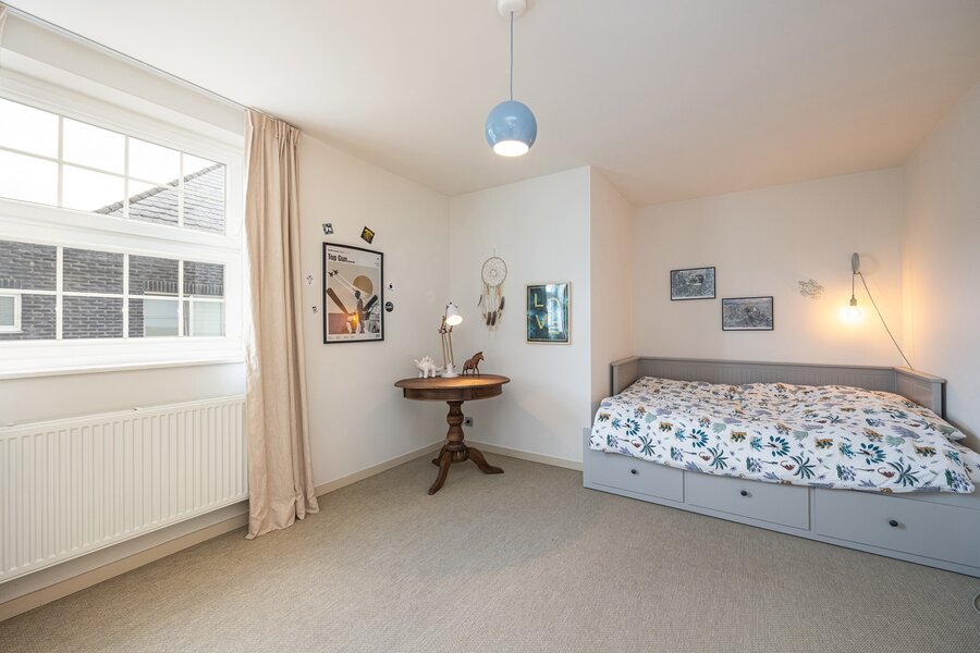 Ten slotte is er de zolderverdieping die toegankelijk is met een vaste trap en helemaal afgewerkt is. Deze 2 zonovergoten kamers dienen nu als bureau en slaapkamer en bieden zeer veel extra ruimte.