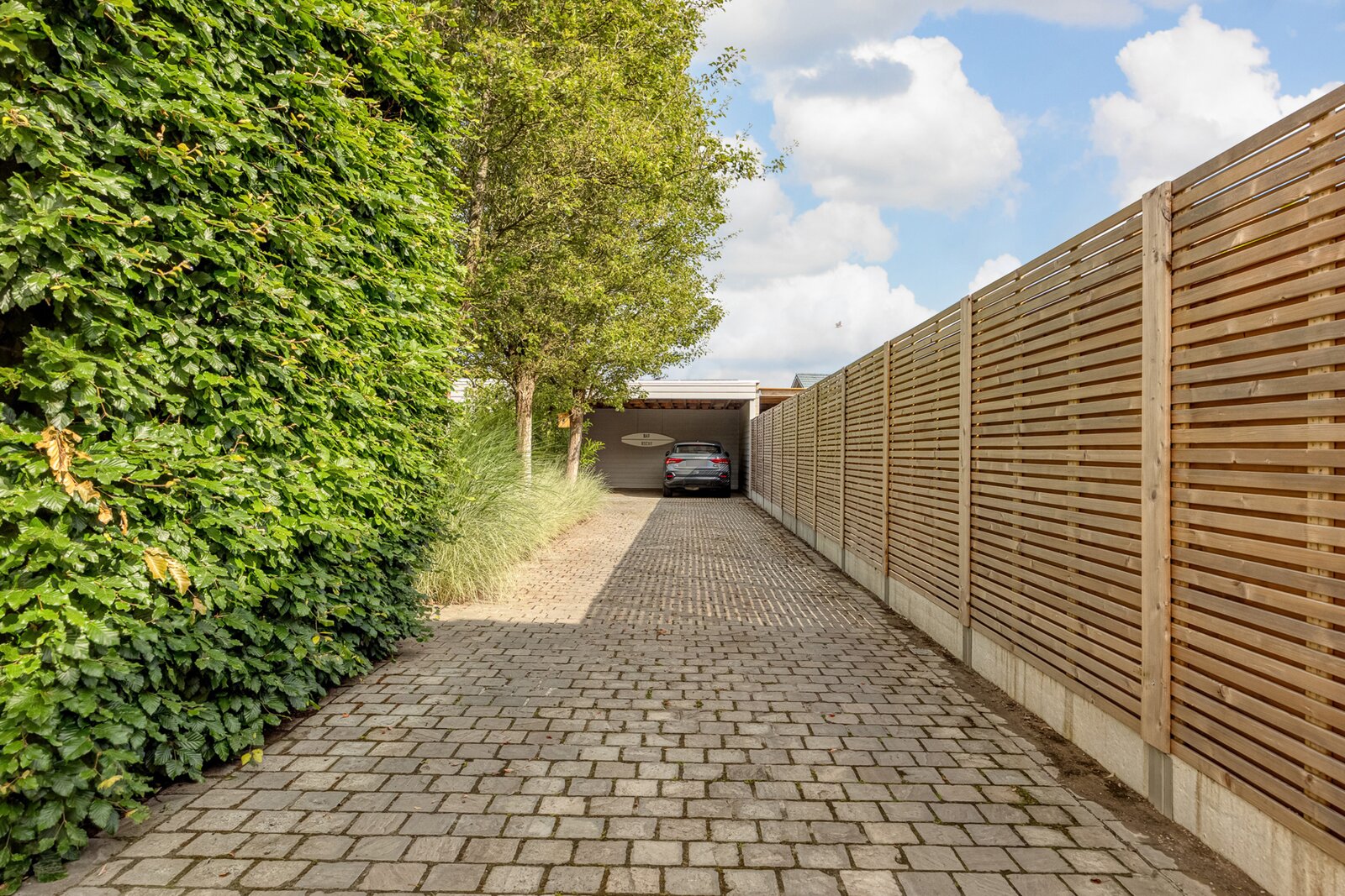 De carport achteraan de tuin biedt ruimte voor 2 auto's en loopt door in een grote tuinberging/ multifunctionele ruimte die heel wat extra bergplaats biedt. In deze onderhoudsvriendelijke tuin met aangename terrassen is het heerlijk vertoeven.