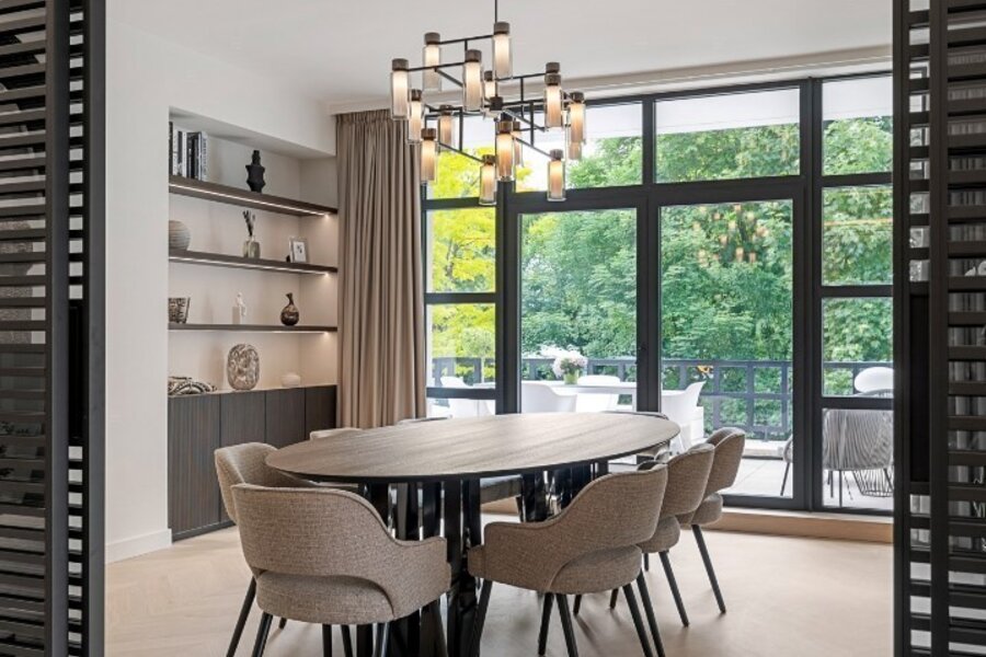 Vanuit de ruime inkomhal met vestiaire en gastentoilet betreedt u een elegante eetkamer met directe toegang tot een prachtig zuidwestgericht terras van 15 m² – een idyllische plek met zicht op het groen, een gezellige woonkamer met haard en ingebouwde bar.