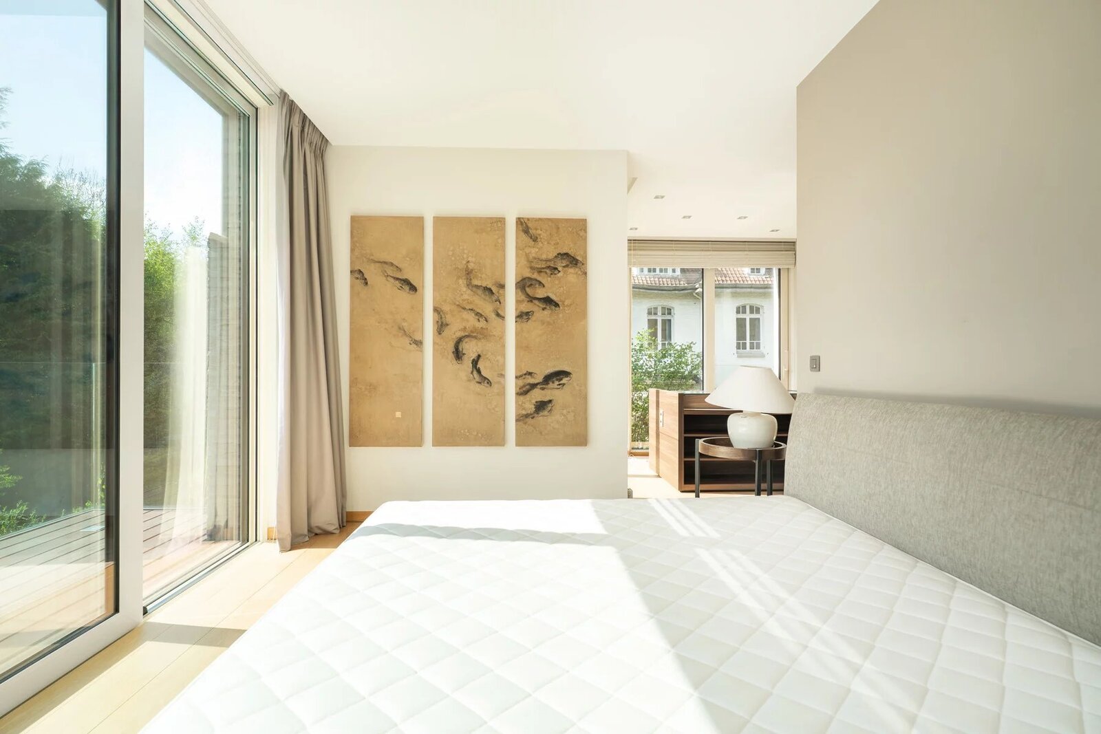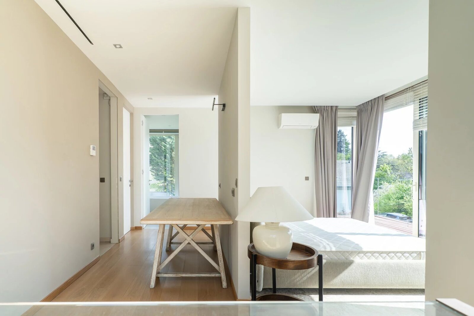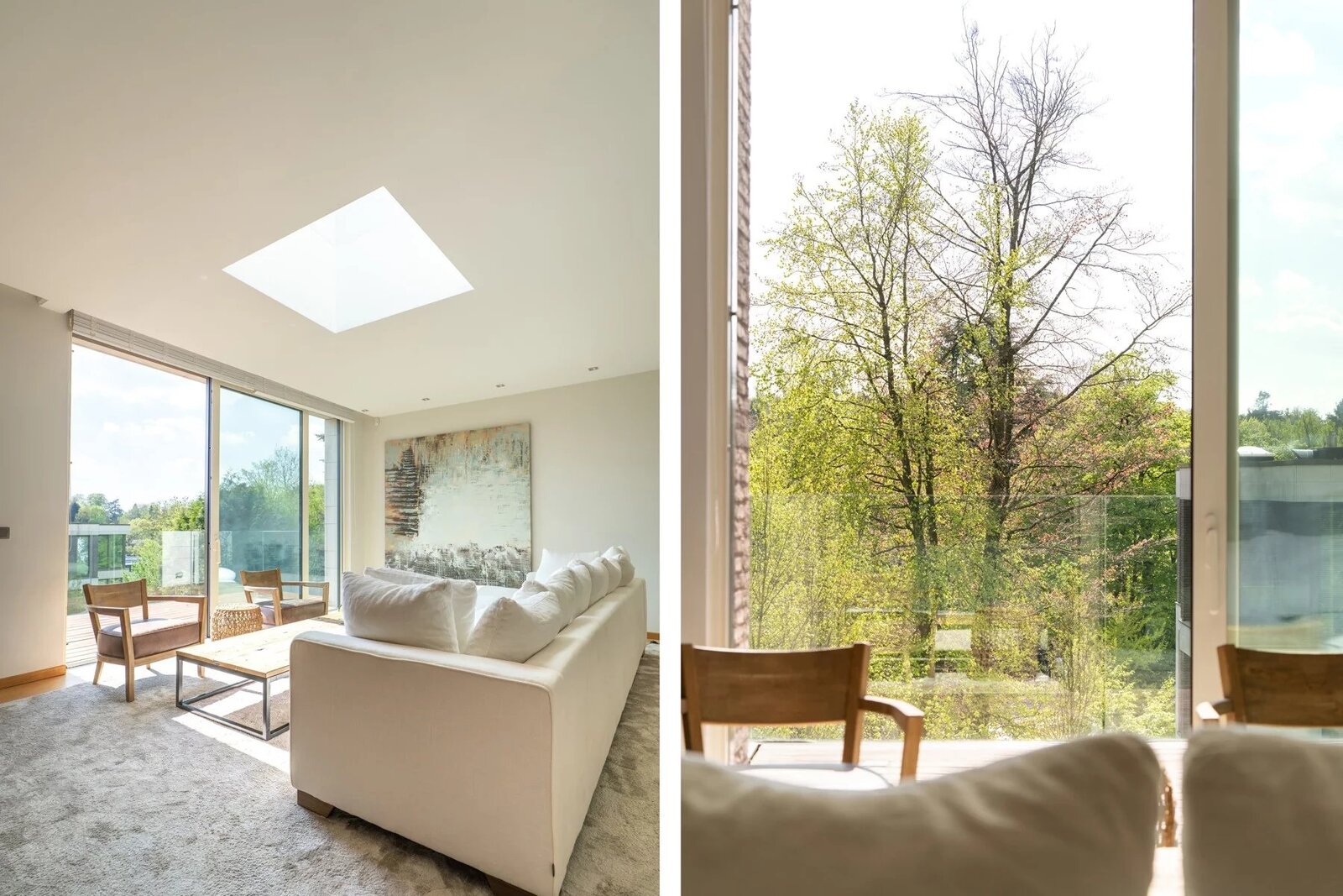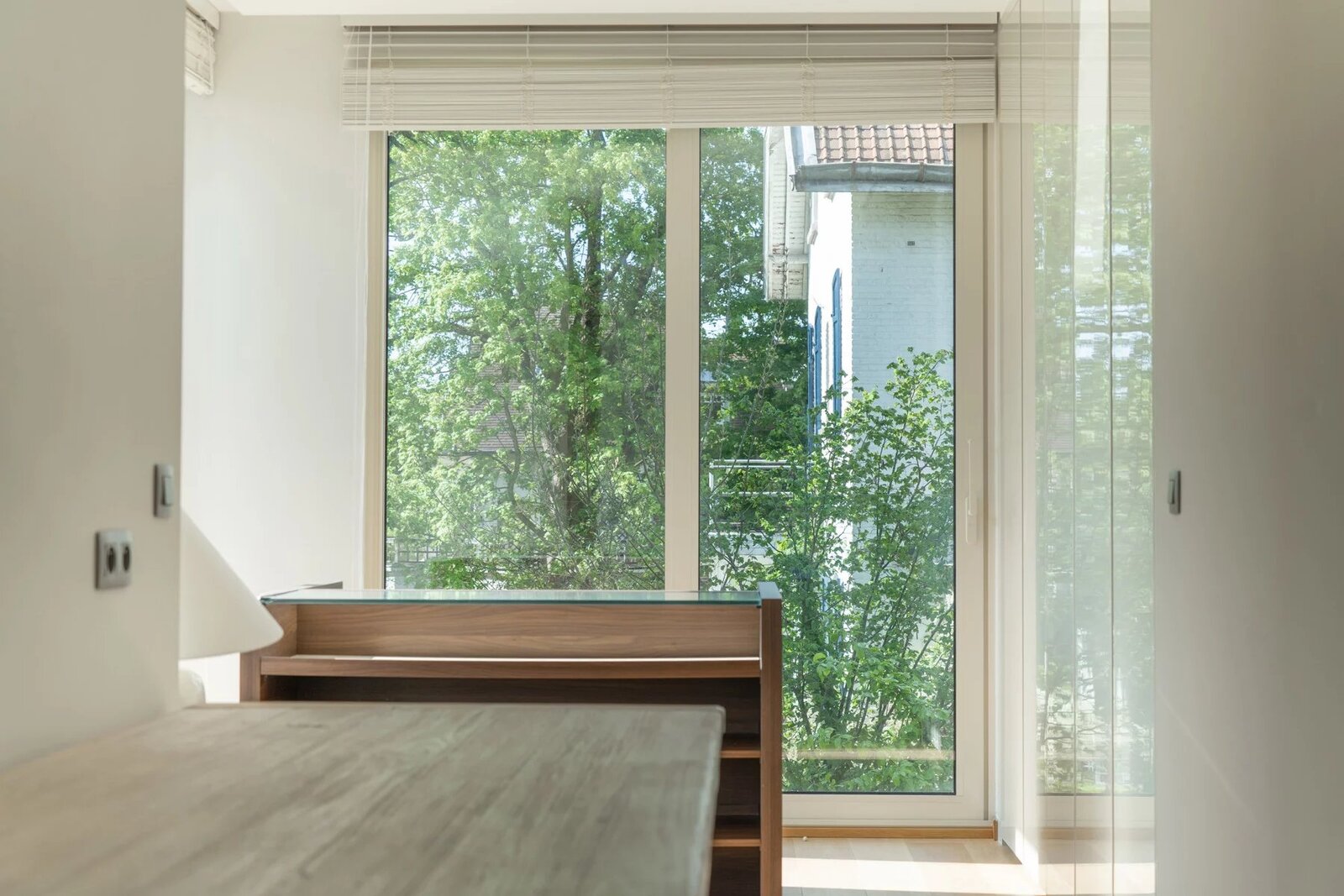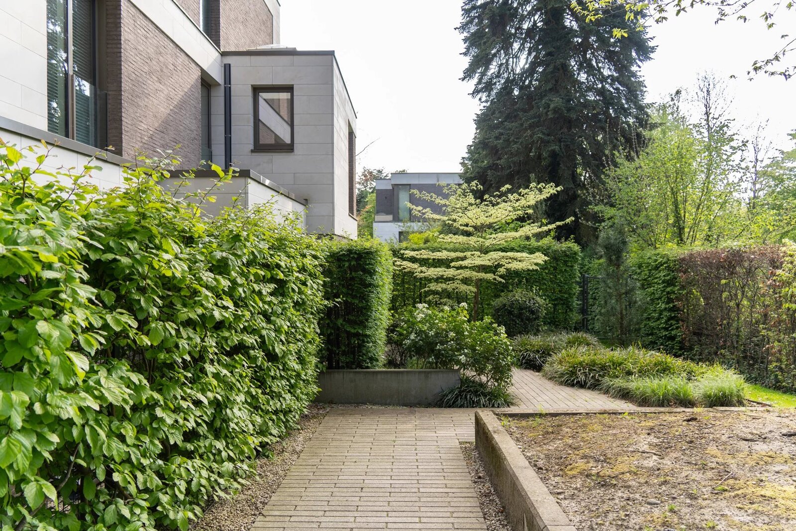 Extra: maatmeubilair van Molteni, vloer in travertin en parket, dubbele ventilatie, driedubbele beglazing, domotica, zonwering, alarm. EPC B.