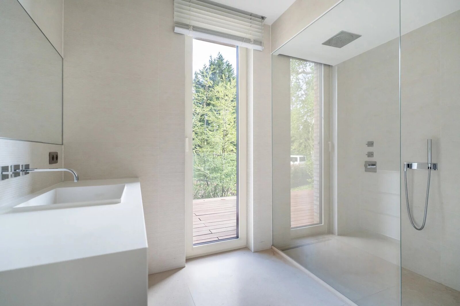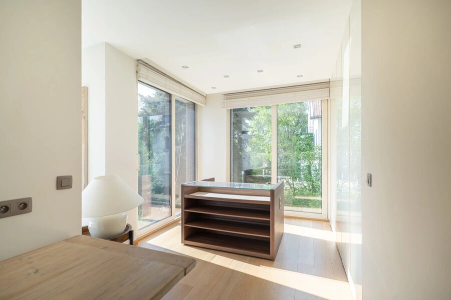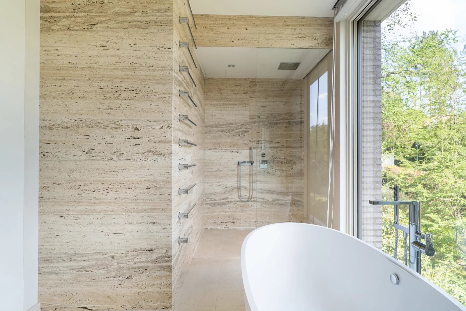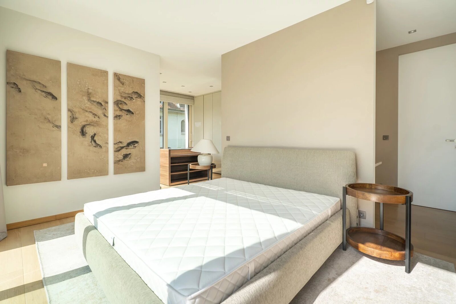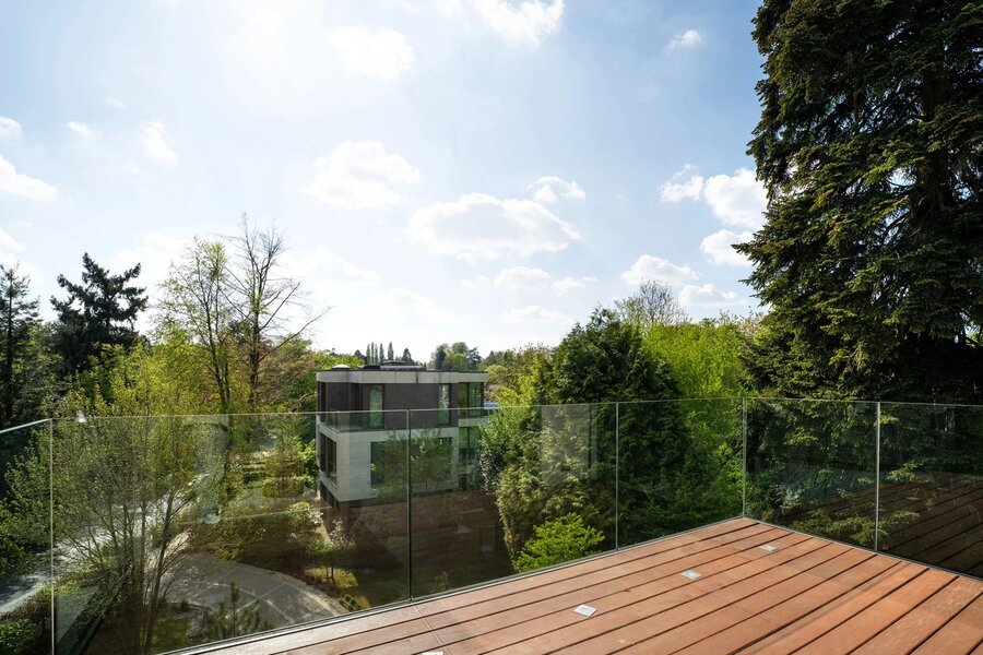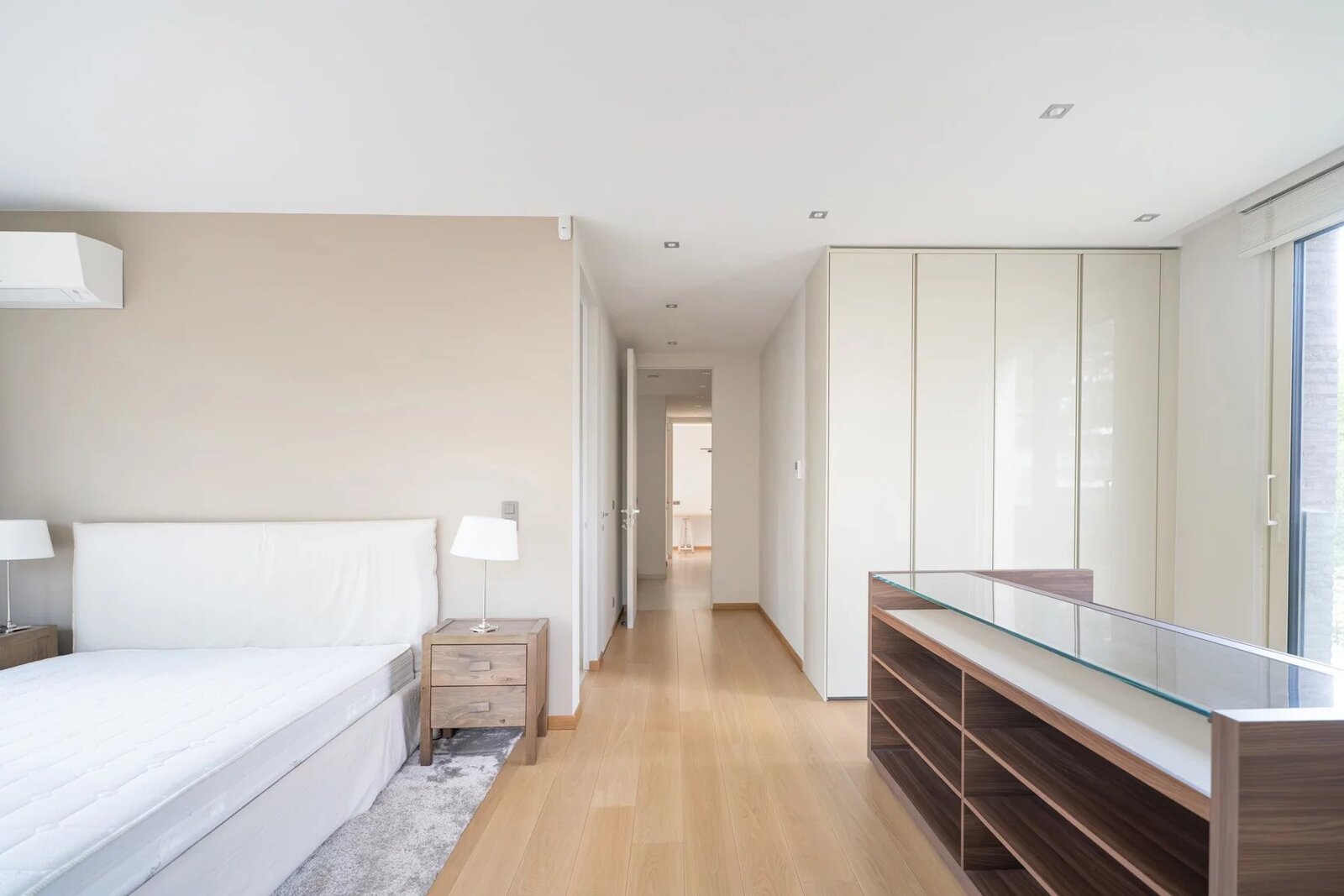 Extra: maatmeubilair van Molteni, vloer in travertin en parket, dubbele ventilatie, driedubbele beglazing, domotica, zonwering, alarm. EPC B.