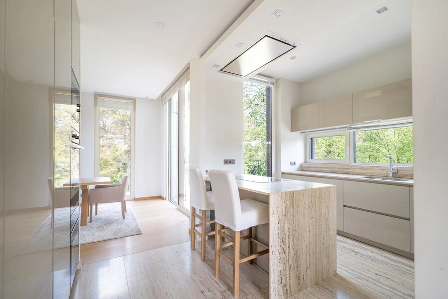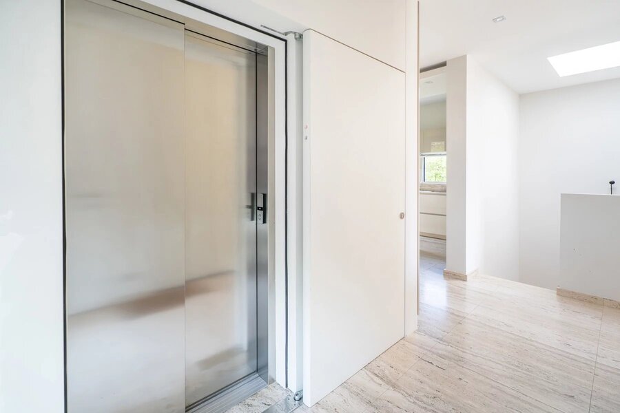 Op de 2e verdieping, rechtstreeks bereikbaar met de lift: inkomhal met vestiaire en gastentoilet, prachtige lichtrijke ontvangstruimtes met toegang tot het perfect georiënteerde terras, eetkamer, volledig ingerichte open keuken.