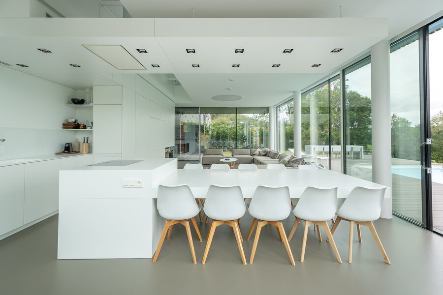De elegante en uitnodigende leefruimte vloeit harmonieus over in een volledig uitgeruste keuken met sobere, tijdloze afwerkingen. Het geheel geeft uit op het terras en de aangelegde tuin met zwembad, ideaal voor ontspanning en een verfijnde buitenbeleving. De technische ruimtes — bijkeuken, functionele wasruimte en garage — zijn ontworpen met het oog op optimaal dagelijks comfort.