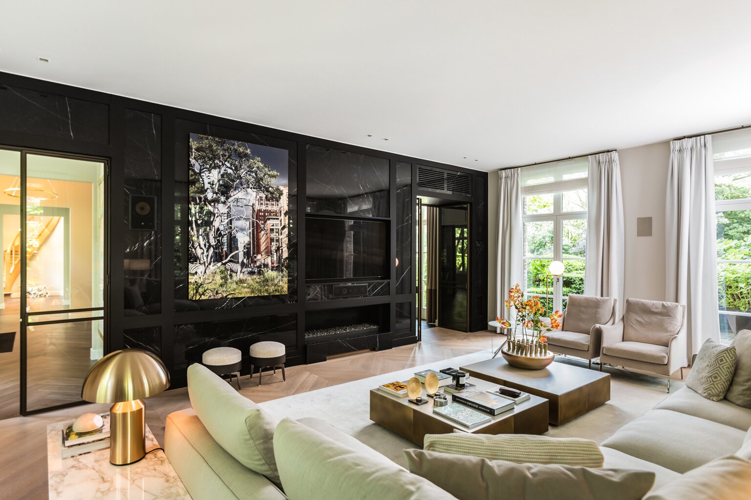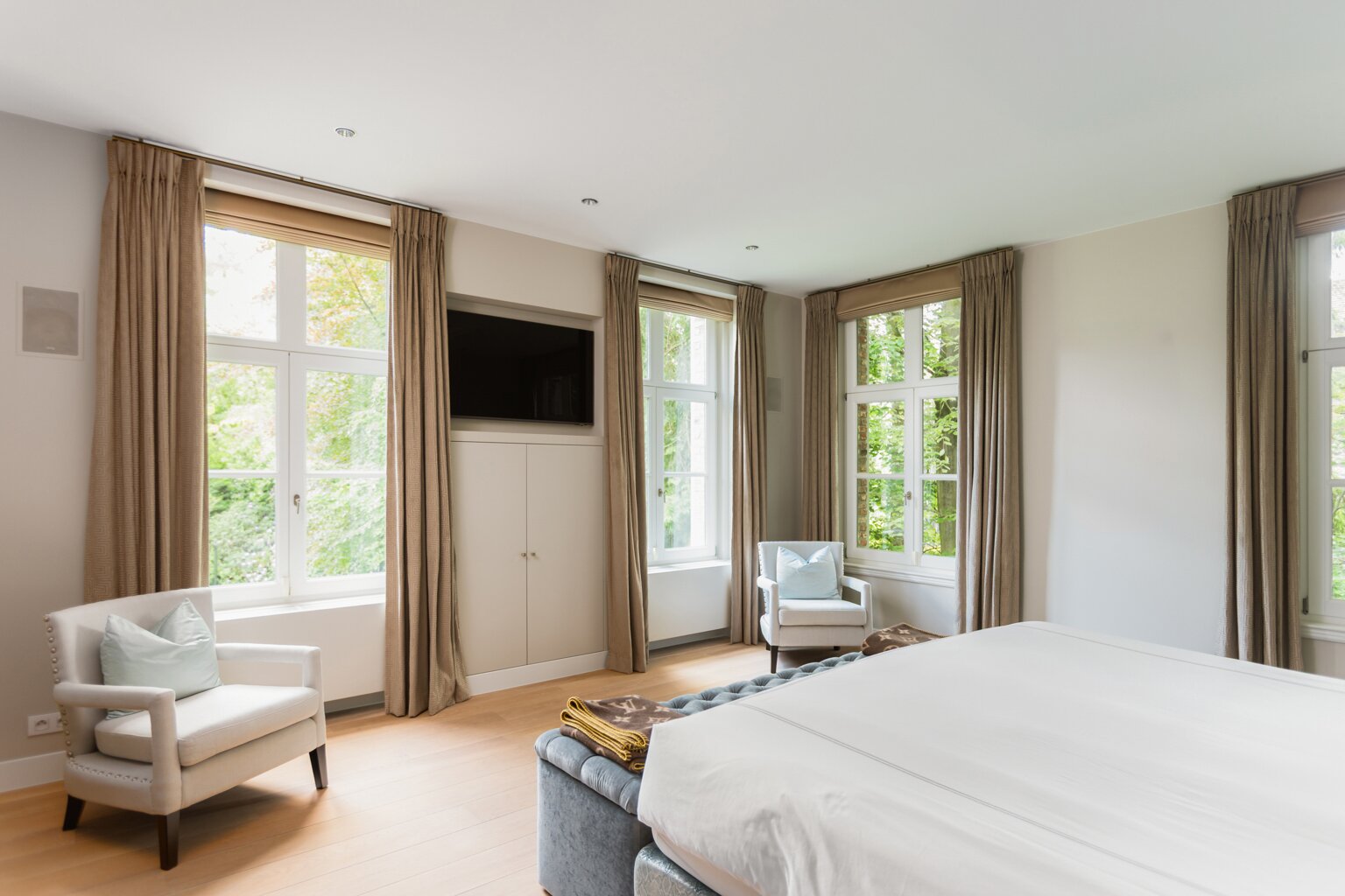 Betreed een wereld van pure elegantie via de imposante entreehal, waar dubbele deuren de weg openen naar leefruimtes die naadloos eikenhout, marmer en leer combineren tot een harmonieuze en verfijnde sfeer. De woon- en eetkamers, verlicht door het zachte daglicht, bieden een prachtig uitzicht op de tuin en worden geaccentueerd door een indrukwekkende gashaard – het ideale decor voor onvergetelijke momenten en het ontvangen van gasten in stijl.