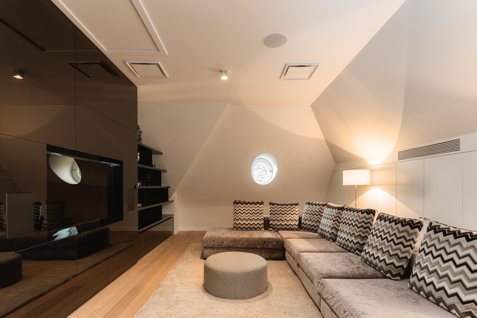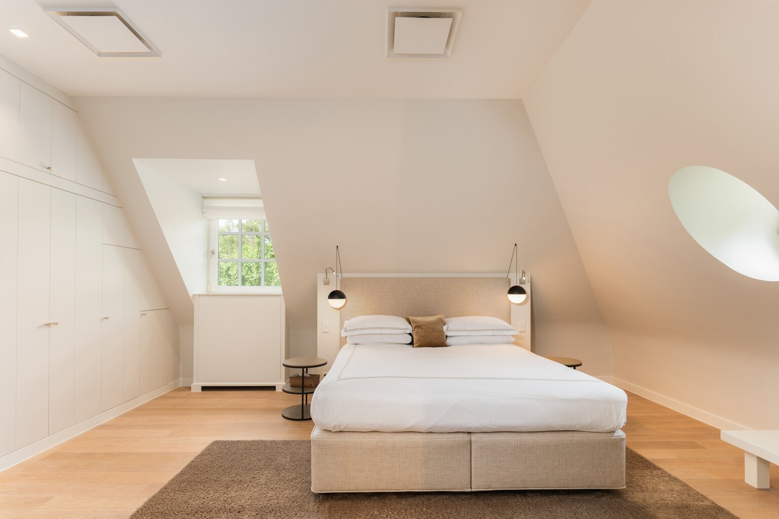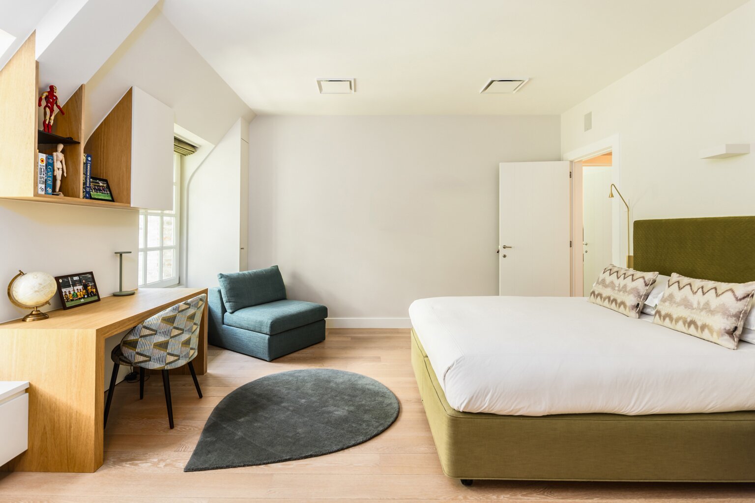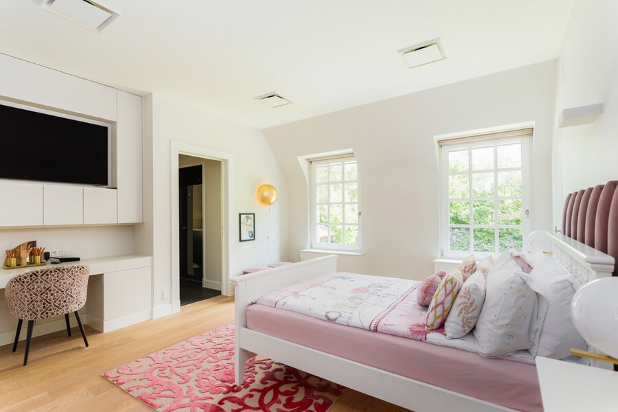 Op de eerste verdieping biedt de master suite een intieme sfeer van privacy en rust, met een royale kleedkamer voor hem en haar, en een luxueus en op maat gemaakt badkamer. Drie kindersuites, elk met een eigen en-suite badkamer, bieden ultiem comfort. De volledig uitgeruste zolderstudio biedt ongekende veelzijdigheid – ideaal voor een inwonende nanny, een student, of voor multigenerational living.