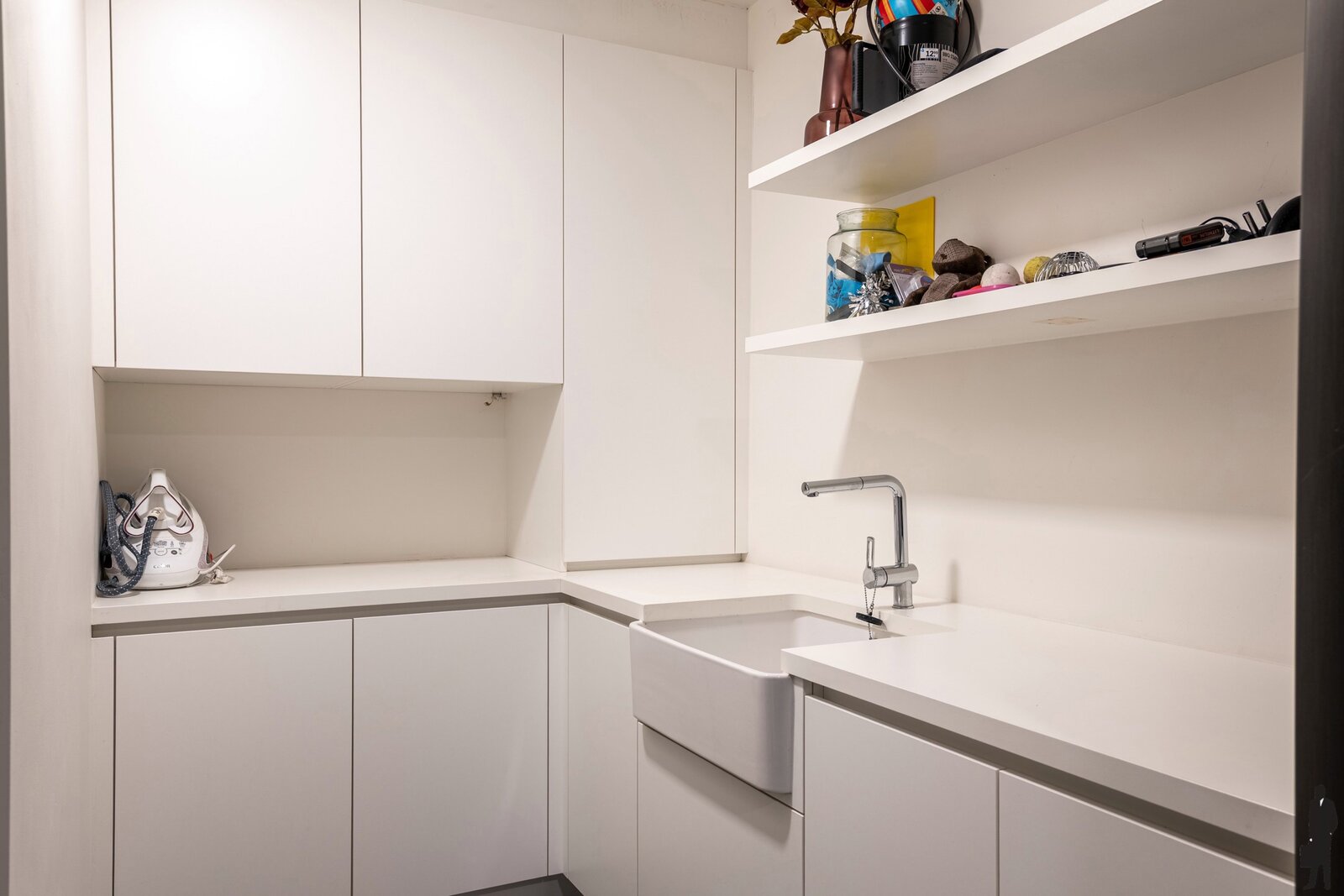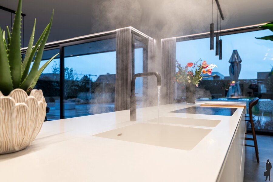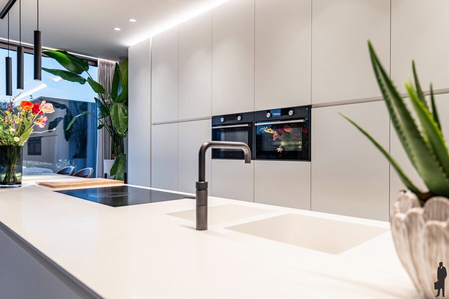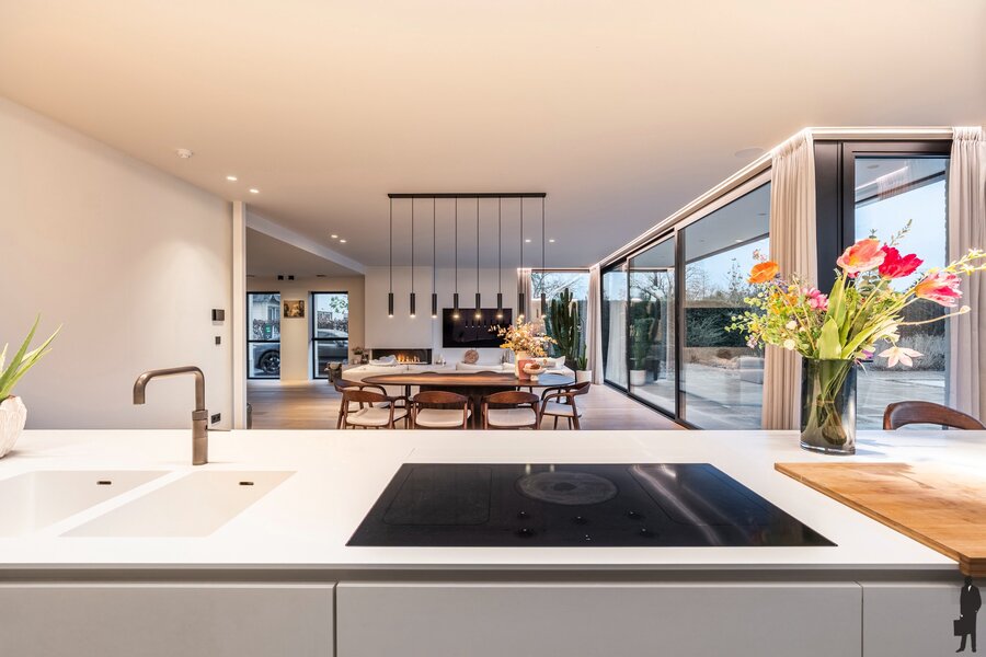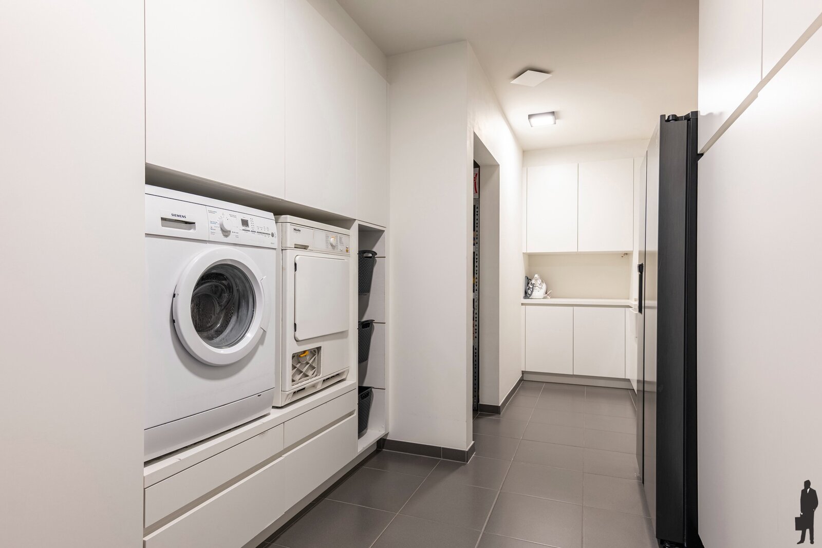 De zeer ruime leefruimte is ingedeeld in verschillende gezellige zones: een tweede bureau of speelkamer aan de straatzijde, een zithoek met gashaard, een centraal gelegen eetplaats en een open keuken. De keuken is hoogwaardig ingericht en uitgerust met een groot kookeiland met ontbijtgedeelte en kwalitatieve inbouwtoestellen. Vanuit de keuken is er toegang tot de bijkeuken en wasplaats, én tot de kelder die extra bergruimte biedt.