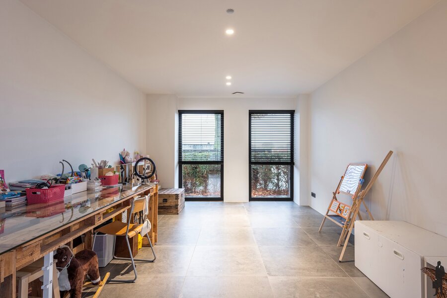 Ook de tweede verdieping werd volledig afgewerkt en ingericht. Deze etage biedt een grote polyvalente ruimte die momenteel dienstdoet als hobbykamer, speelzolder of extra werkruimte, maar eenvoudig kan worden aangepast naar een vierde slaapkamer, fitnessruimte of ontspanningsruimte.