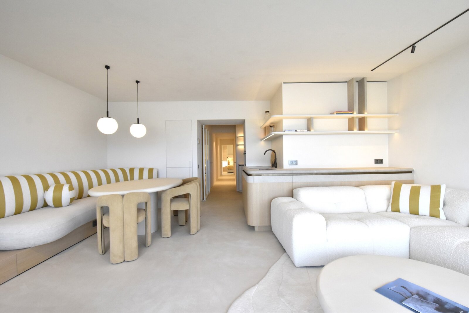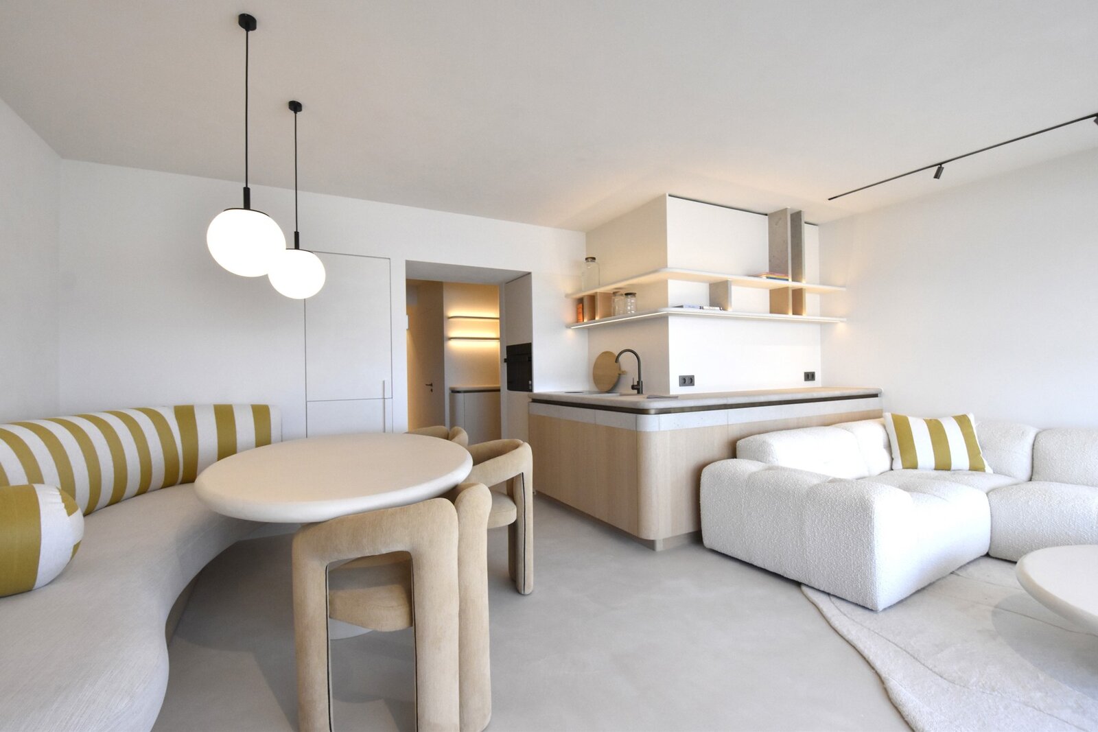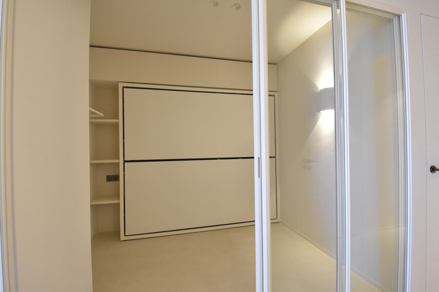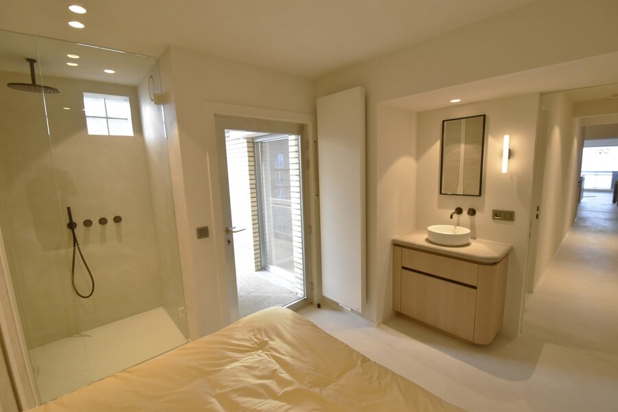 Stijlvolle inkomhal met vestiairekast en gastentoilet. Een ruime, lichtrijke woonkamer met een weids panoramisch zeezicht en toegang tot het balkon. Volledig ingerichte open keuken met kwalitatieve toestellen en praktische berging.
