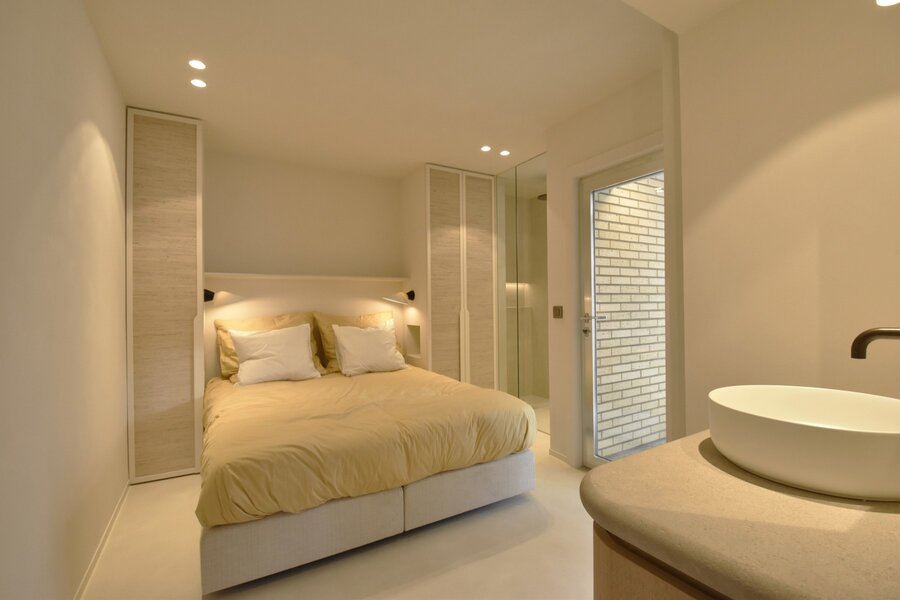 Slaapgedeelte bestaande uit een stapelbedkamer met ingemaakte kasten, een masterbedroom met ingemaakte kasten en ensuite douchekamer (inloopdouche, dubbele lavabo en wc), en een tweede volwaardige slaapkamer eveneens met ingemaakte kasten en eigen douchecel. Beide slaapkamers geven uit op het zonnige achterterras. Alle meubilair inclusief !