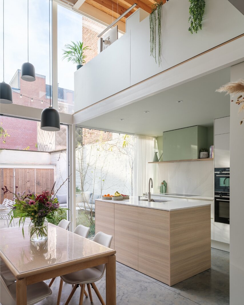Dankzij de indrukwekkende vide met mezzanine genieten zowel de eetplaats als de keuken van een uitzonderlijk ruimtelijk gevoel en een overvloed aan natuurlijk daglicht. De zuidgerichte stadstuin vormt een aangename, zonnige buitenruimte en sluit perfect aan bij het warme, huiselijke karakter van de woning.