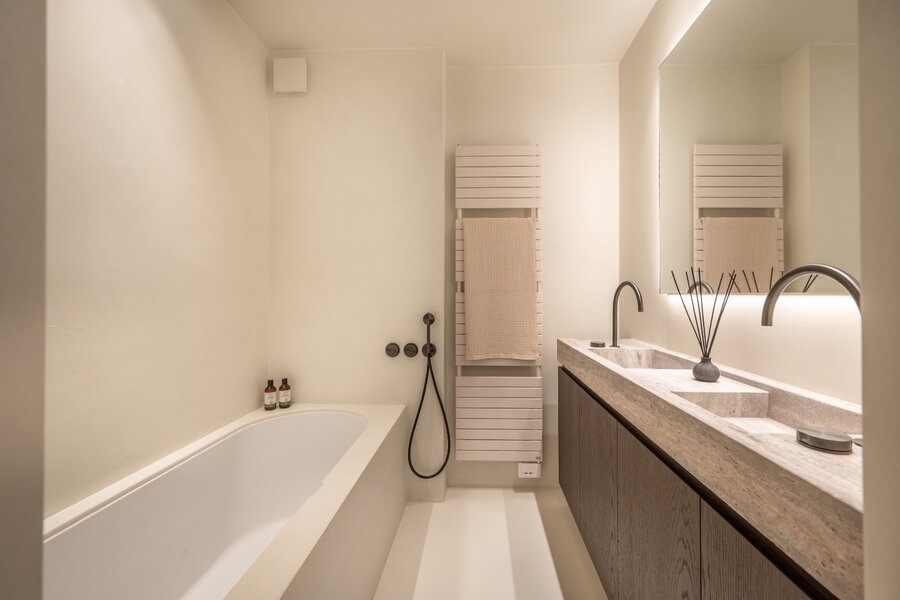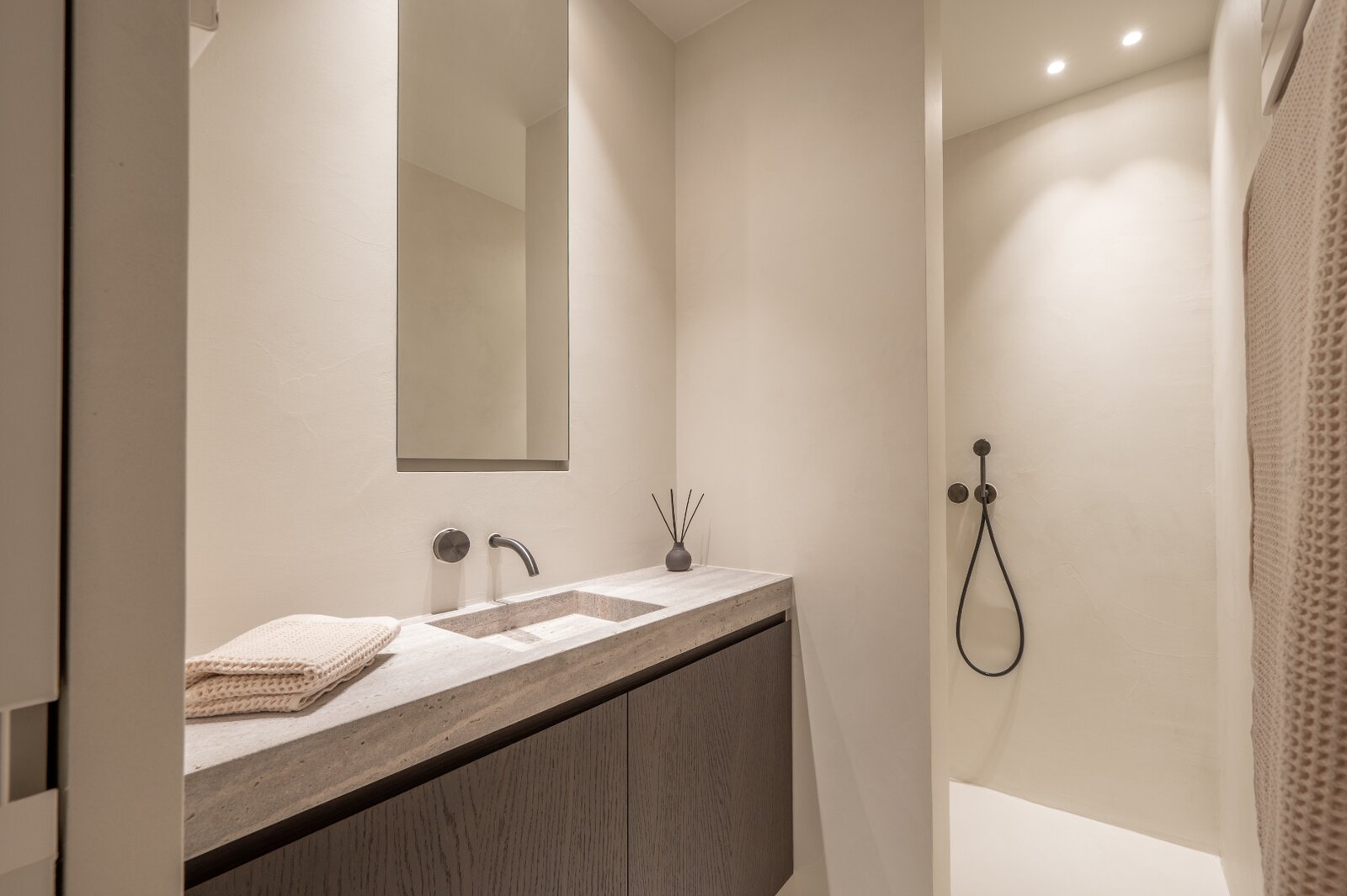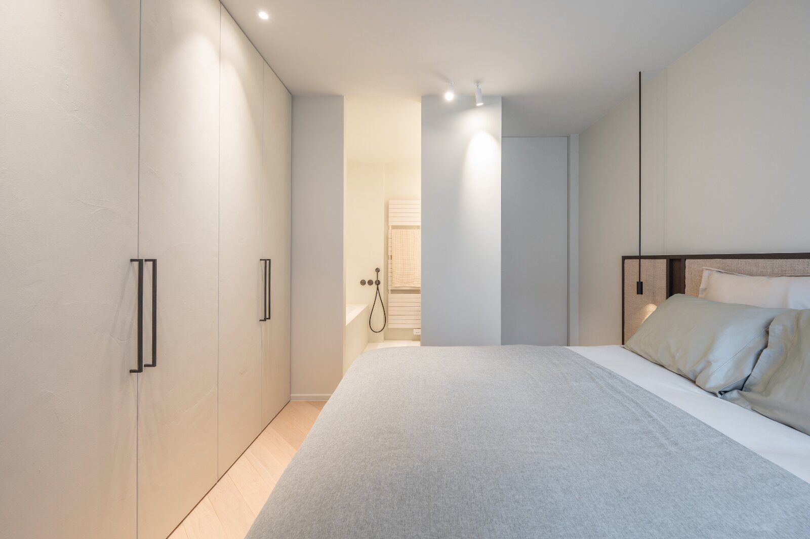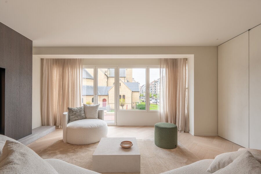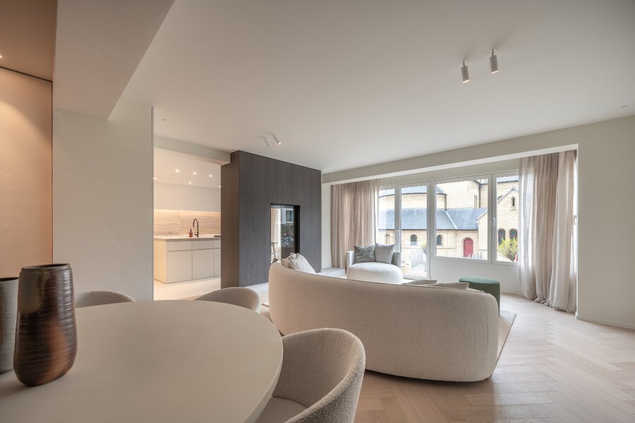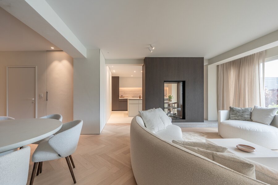 Dit appartement weerspiegelt een architecturaal lijnenspel in een overvloed aan natuurlijk licht. De gezellige leefruimte omvat een zithoek met een afzonderlijke eethoek. De stijlvol afgewerkte tunnelhaard zorgt hier voor de verbinding met de ruime open keuken. Daar waar de lichtrijke leefruimtes een loftgevoel oproepen, bieden de slaapvertrekken een serene cocon voor ultieme rust. Via een sas zijn de drie slaapkamers met elkaar verbonden, waardoor privacy gewaarborgd wordt. Elke slaapkamer heeft een ensuite badkamer, luxueus afgewerkt en perfect voor een moment van ontspanning. De warme, natuurlijke materialen maken het geheel af met een rustgevend zen-gevoel.