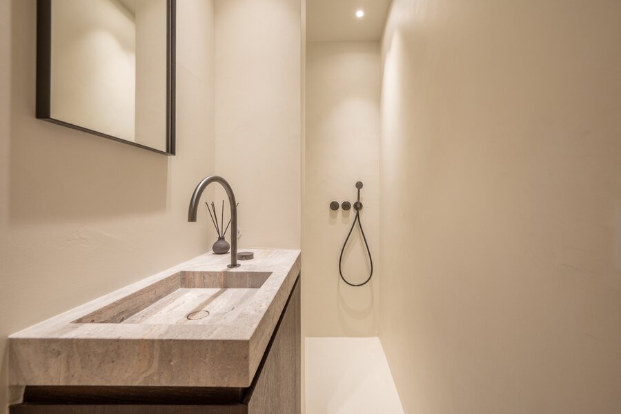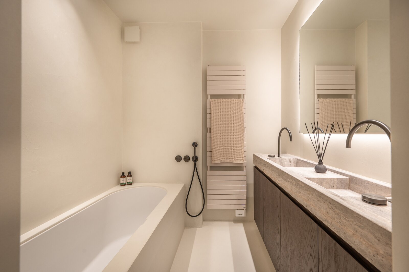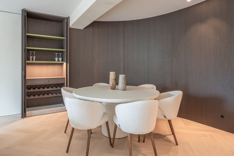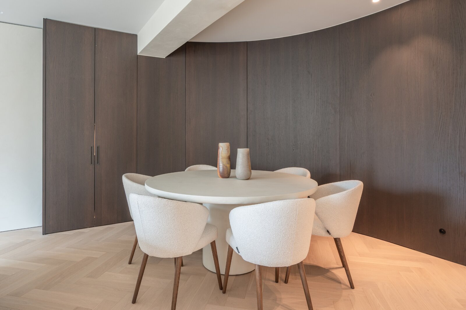 Bij de productie van het maatwerkmeubilair bleef geen enkel detail onbesproken. Een uitgepuurde keuze betreffende de verlichting, raamdecoratie en designmeubelen geeft dit project een serene, klassevolle uitstraling. Deze luxueuze ambiance wordt versterkt door het visgraatpatroon van de eikenhouten parketvloeren en het gebruik van travertin natuursteen.