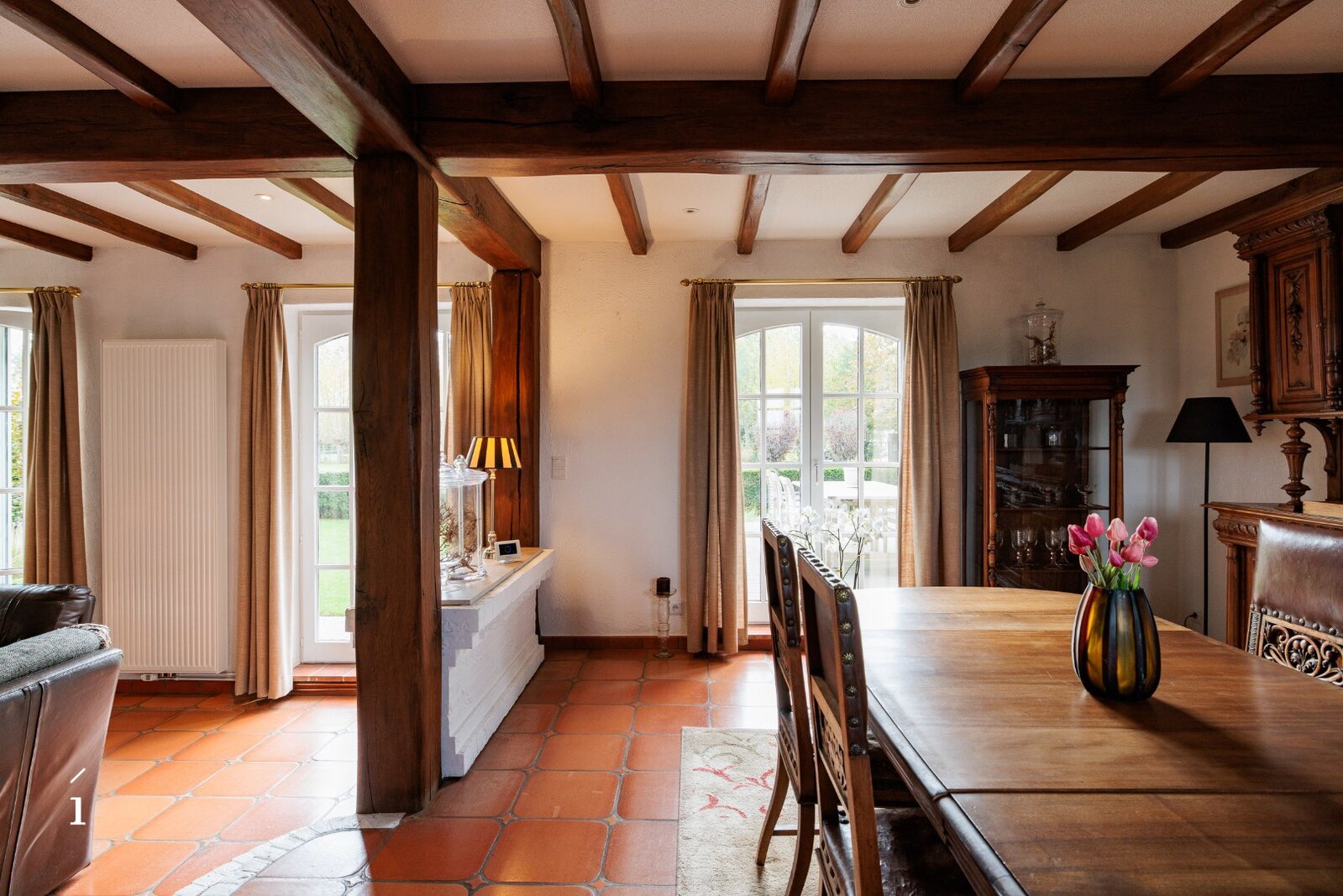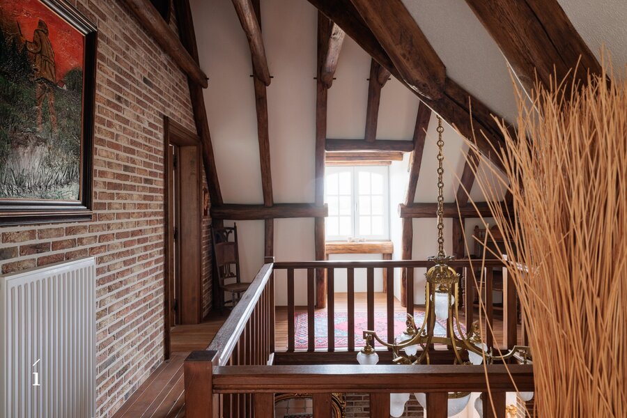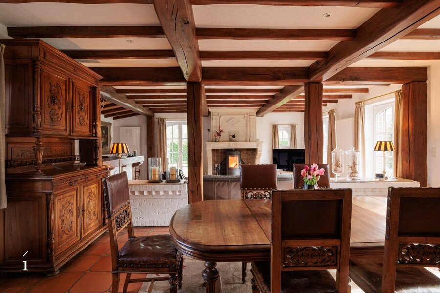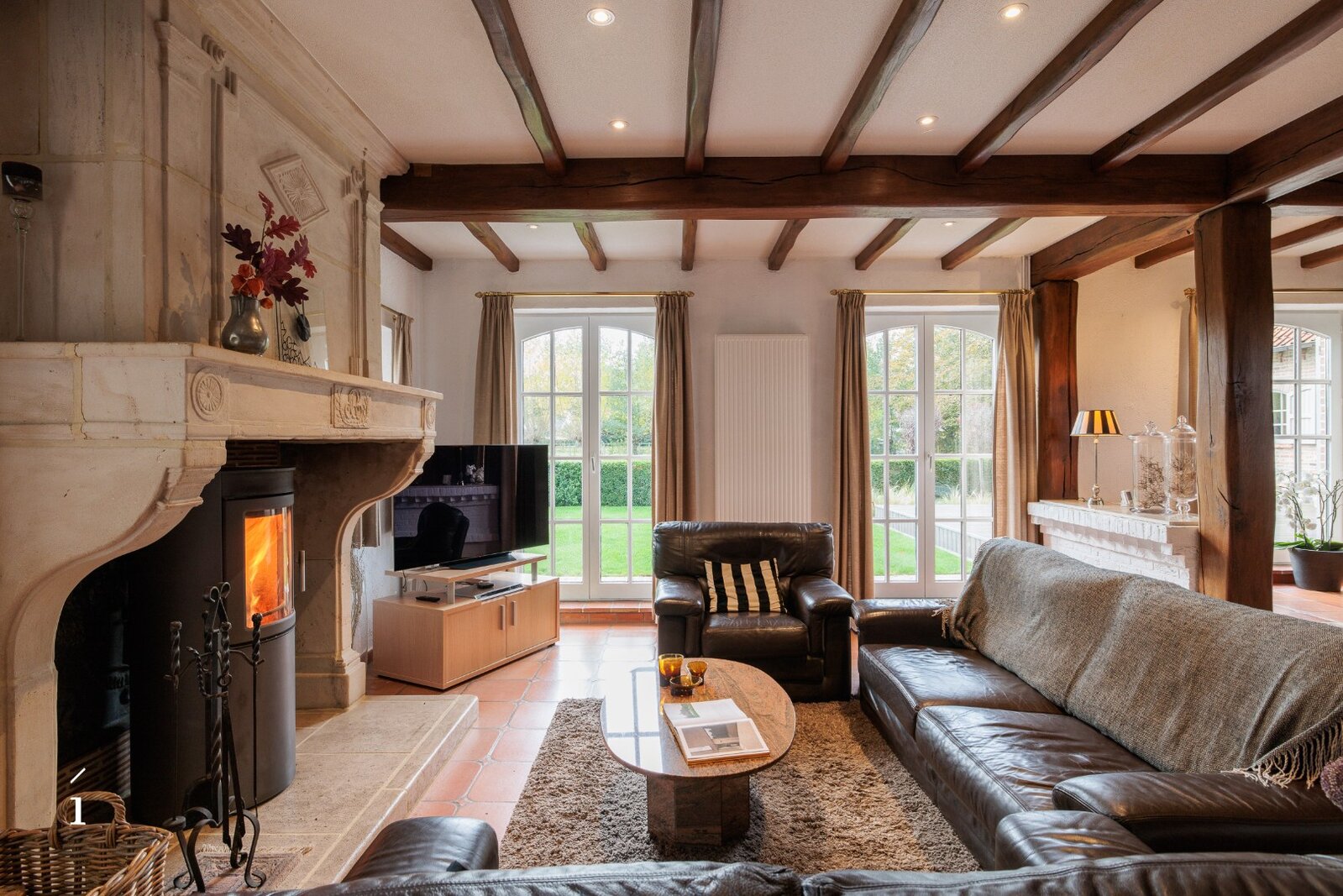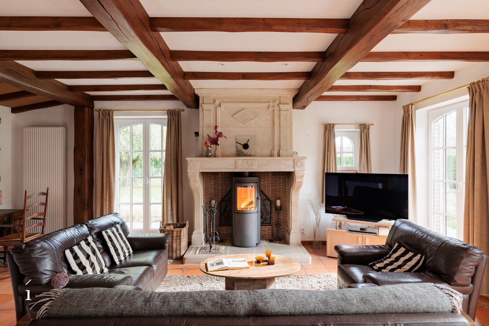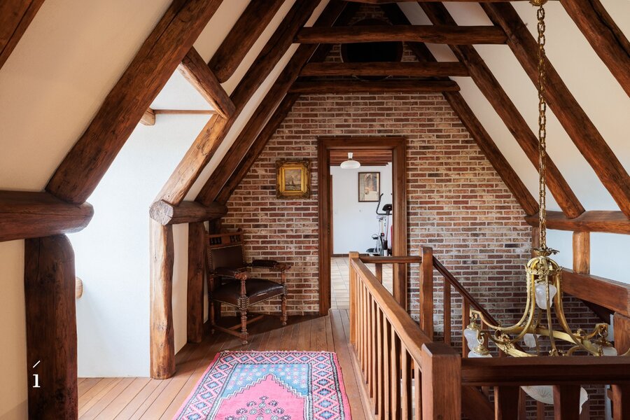 Binnen ademt de woning warmte en karakter, met duurzame materialen die tijdloos blijven. Authentieke eiken balken geven structuur en ziel, terwijl twee open haarden - waaronder een indrukwekkende Franse stenen haard - zorgen voor gezelligheid en een rustgevende sfeer. De combinatie van natuurlijke materialen en grote raampartijen zorgt voor een harmonie tussen binnen en buiten.