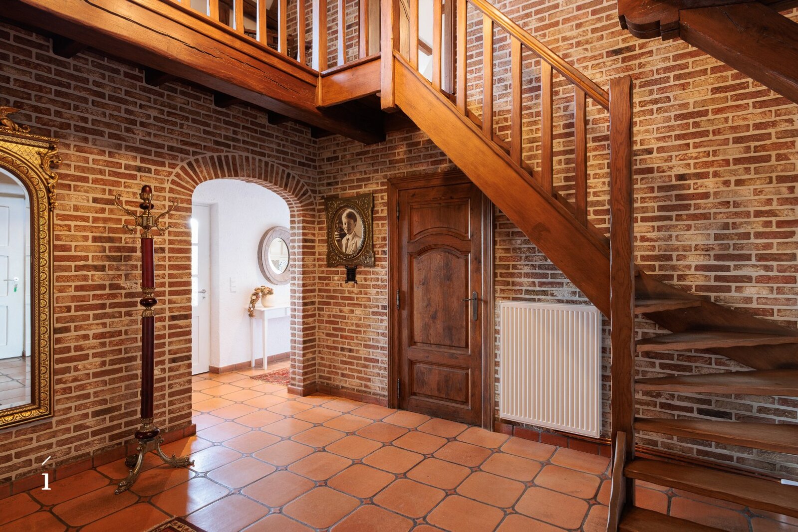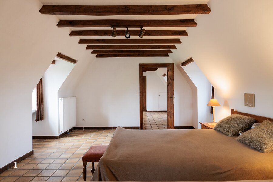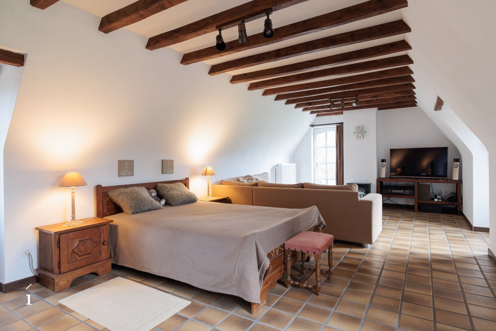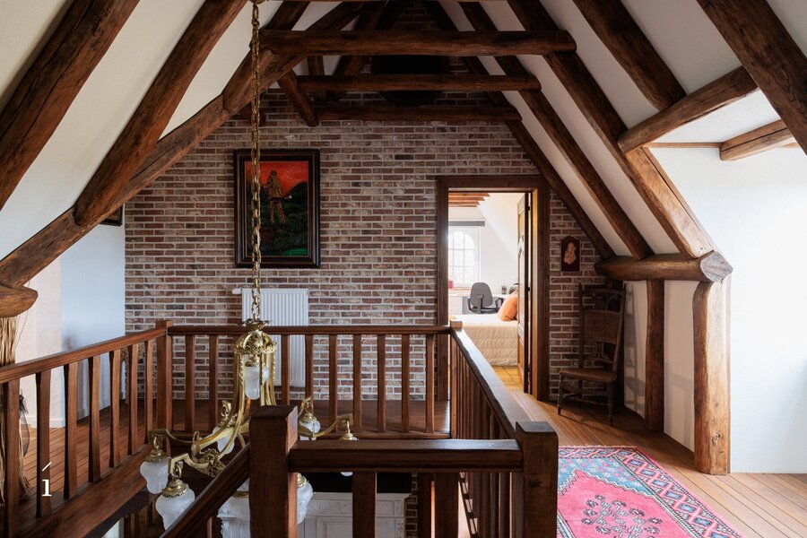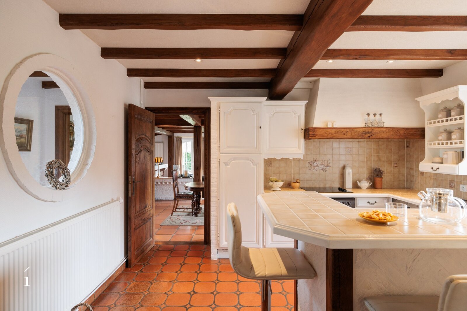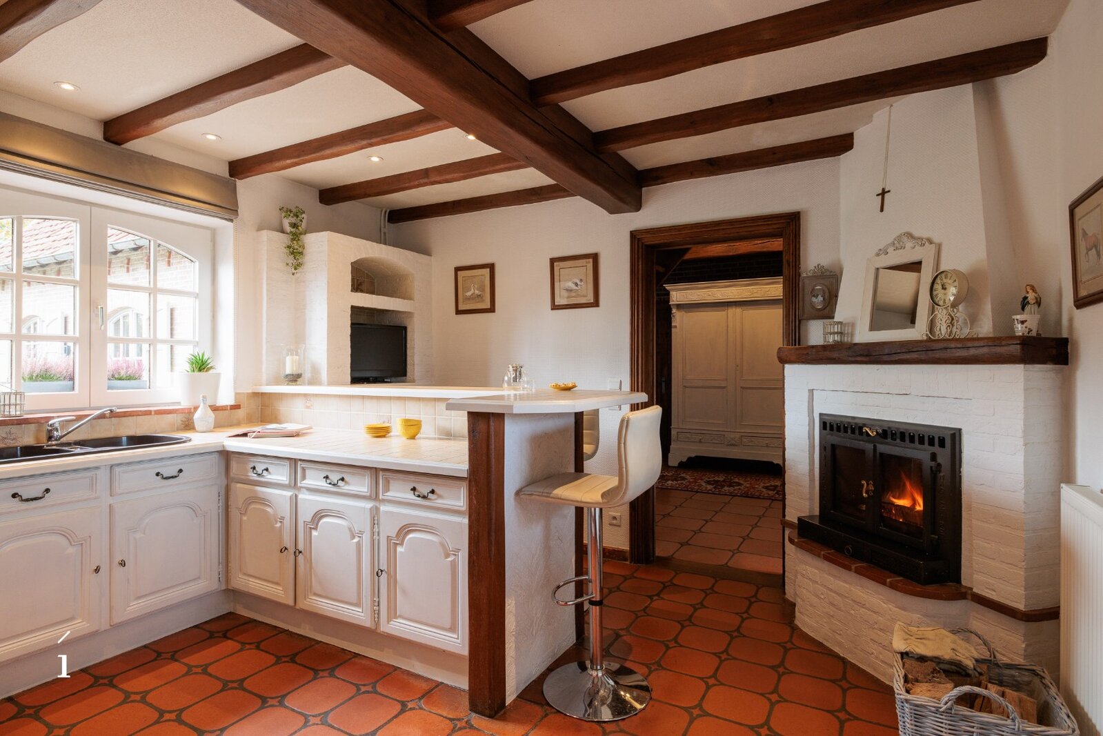 Binnen ademt de woning warmte en karakter, met duurzame materialen die tijdloos blijven. Authentieke eiken balken geven structuur en ziel, terwijl twee open haarden - waaronder een indrukwekkende Franse stenen haard - zorgen voor gezelligheid en een rustgevende sfeer. De combinatie van natuurlijke materialen en grote raampartijen zorgt voor een harmonie tussen binnen en buiten.