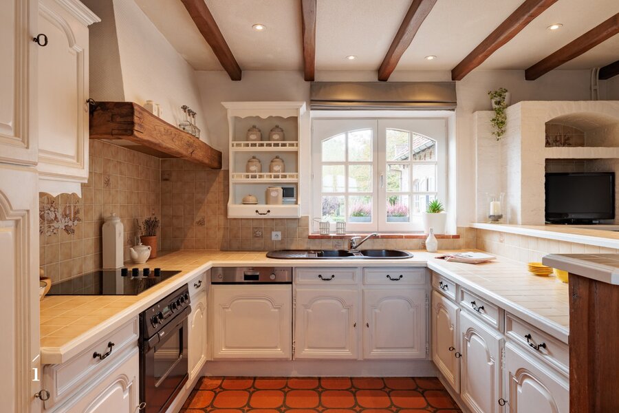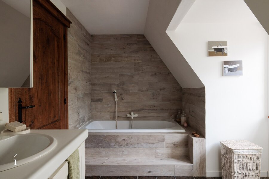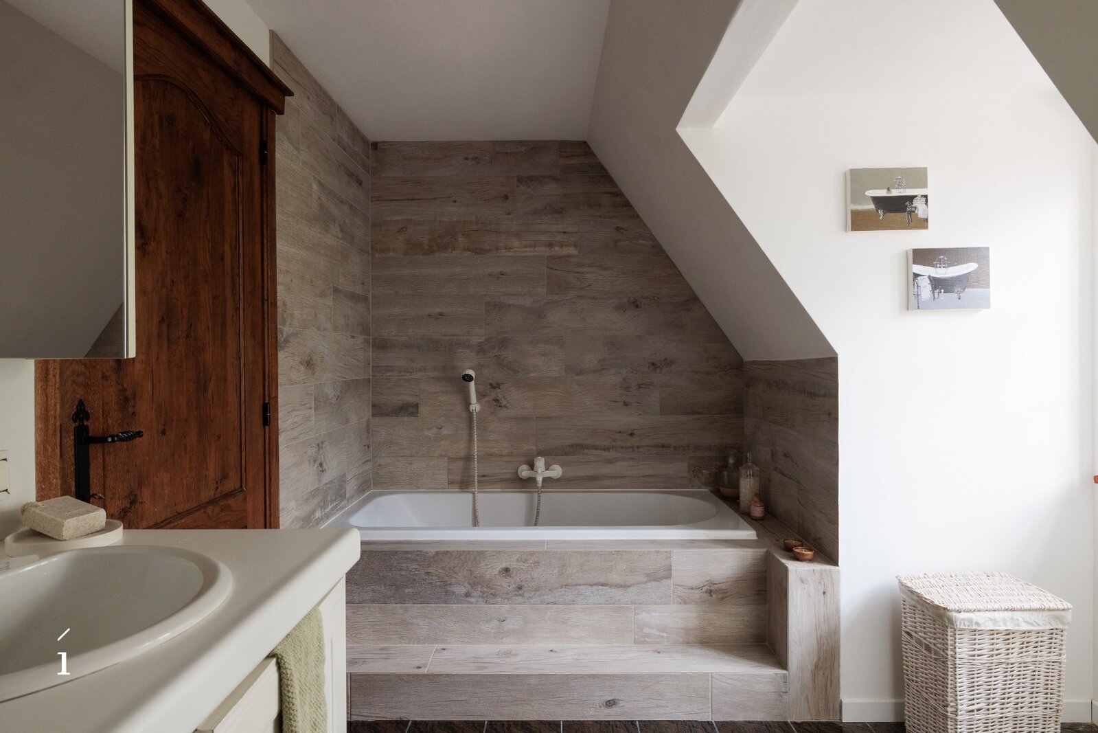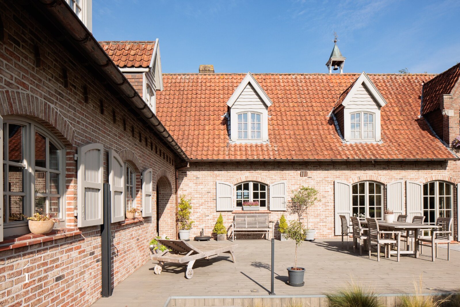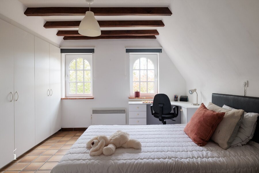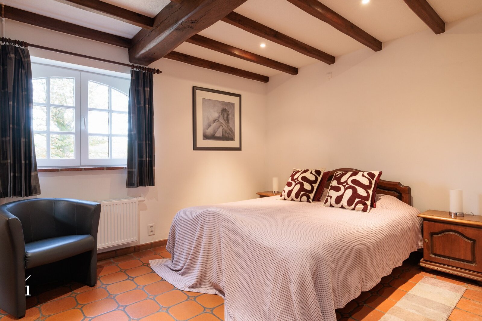 Binnen ademt de woning warmte en karakter, met duurzame materialen die tijdloos blijven. Authentieke eiken balken geven structuur en ziel, terwijl twee open haarden - waaronder een indrukwekkende Franse stenen haard - zorgen voor gezelligheid en een rustgevende sfeer. De combinatie van natuurlijke materialen en grote raampartijen zorgt voor een harmonie tussen binnen en buiten.