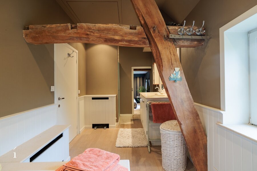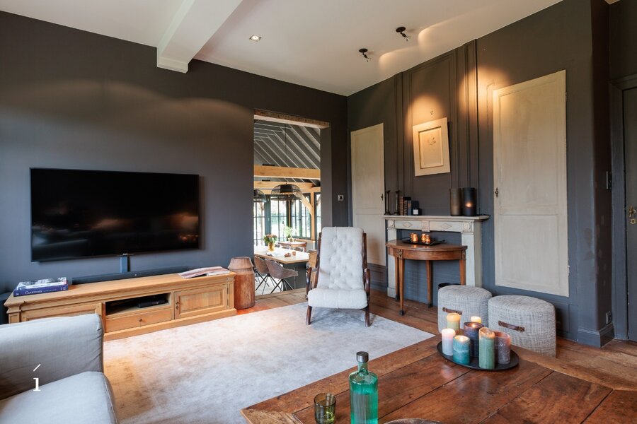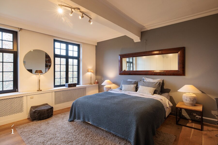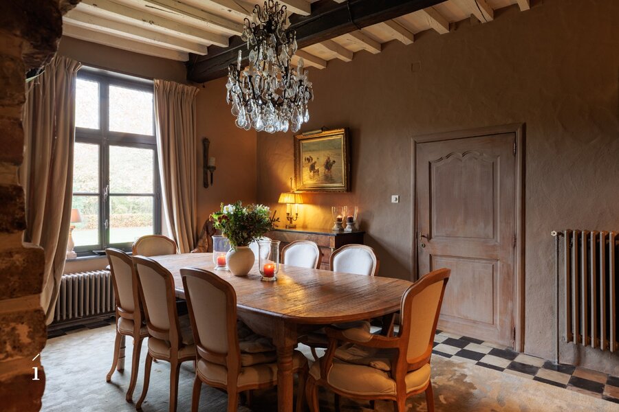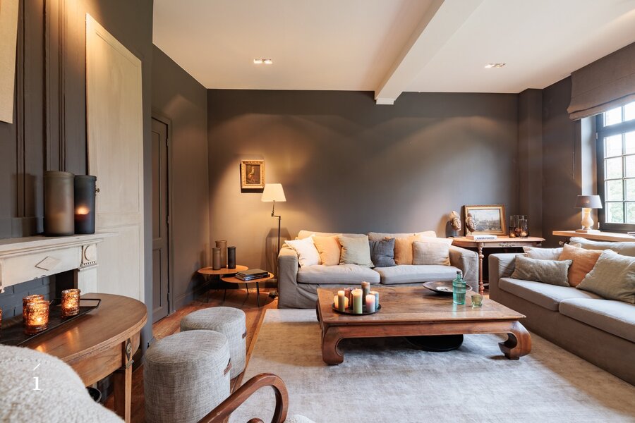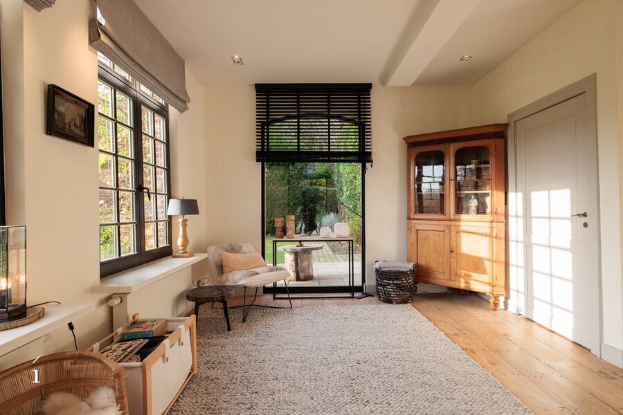 Op de gelijkvloerse verdieping van de authentieke woning vindt u twee sfeervolle zithoeken. Achteraan bevindt zich een lichtrijke leefruimte met uitzicht op de tuin en een gezellige houthaard. Aan de voorzijde ligt een tweede, karaktervolle zithoek, eveneens met tuinzicht - vooraan, waar de authentieke charme van het landgoed extra uit komt.