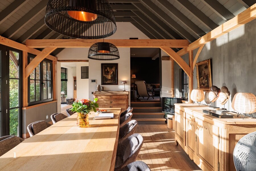 Aan de andere kant van de inkomhal in het hoofdgebouw is er de tweede eetplaats, deze is uitgerust met een open houthaard. Vanuit deze ruimte bereikt u de volledig geïnstalleerde keuken, met aansluitend een proviandruimte en een wasruimte. Via de proviandruimte kunt u de woning ook binnentreden.