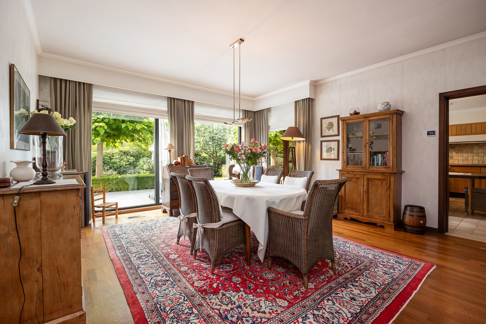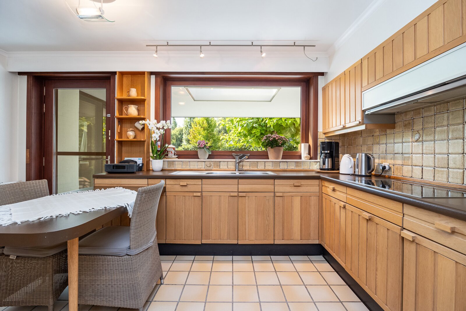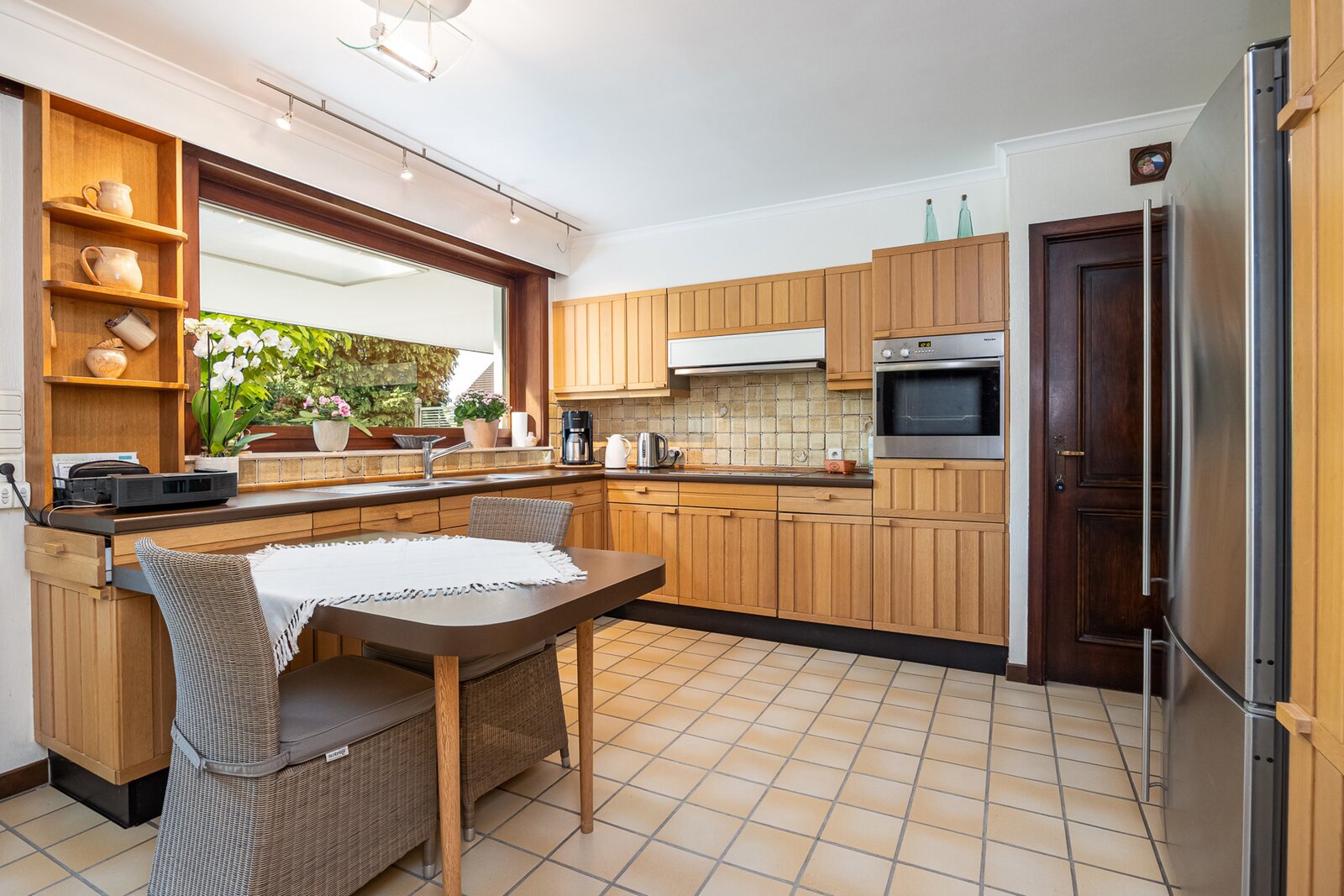 Aansluitend bevindt zich de keuken die rechtstreeks toegang geeft tot zowel de praktische bijkeuken als de dubbele inpandige garage.