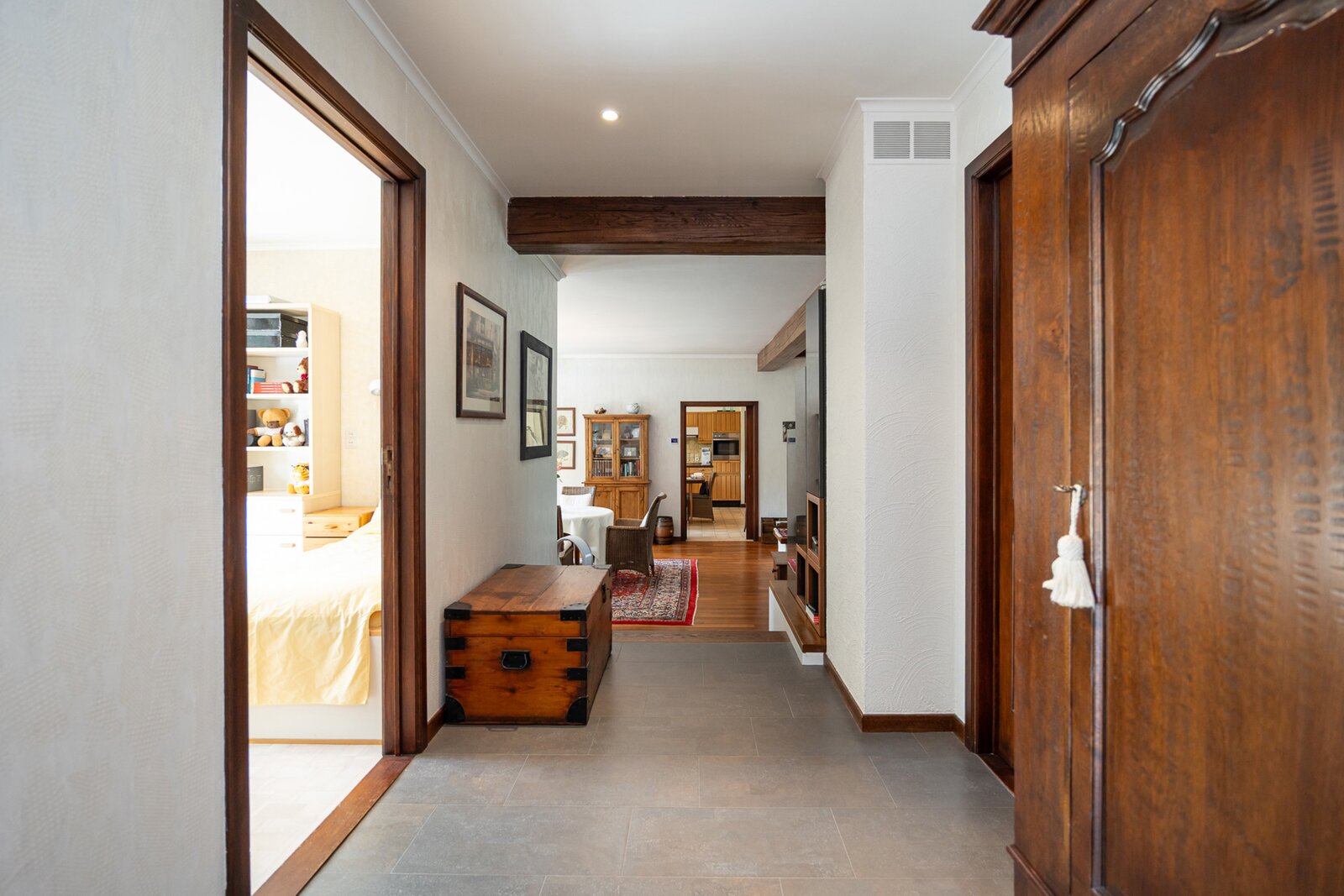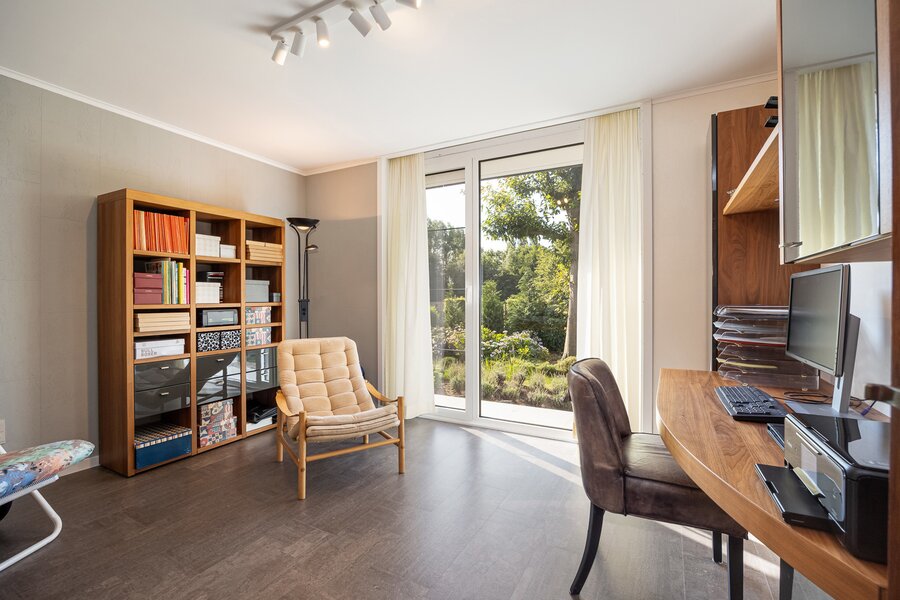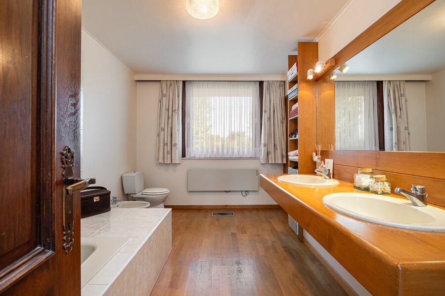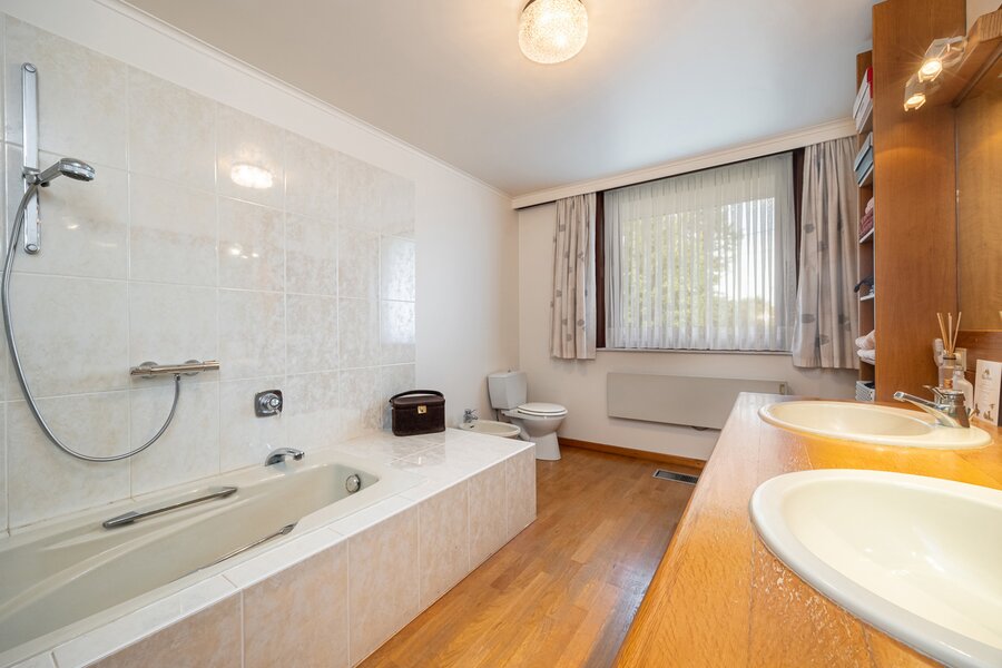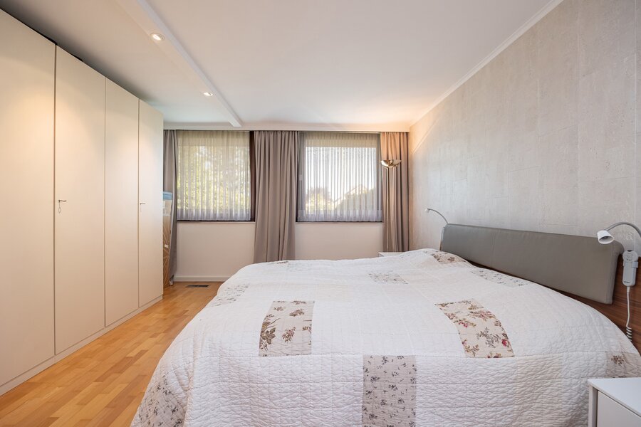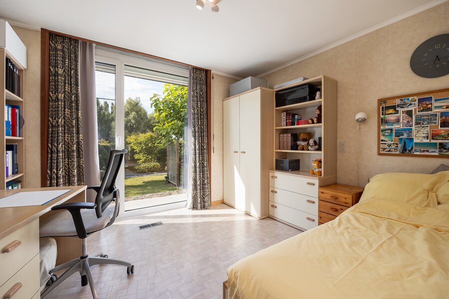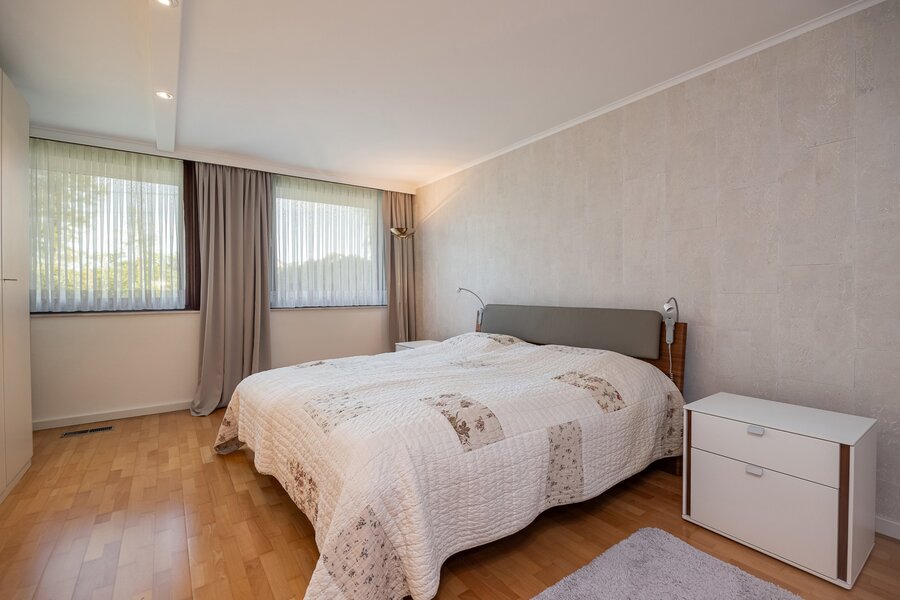 Vanuit de leefruimte bereikt u via enkele treden het slaapgedeelte. De bungalow is gebouwd volgens een uniek concept waarbij het hoogteverschil tussen het woongedeelte en de slaapkamers zorgt voor een uitzonderlijk gevoel van ruimte en privacy. De master bedroom geeft rechtstreeks toegang tot de ruime badkamer met ligbad, dubbele lavabo en toilet. Daarnaast zijn er nog twee mooie slaapkamers, elk met uitzicht op tuin en velden.