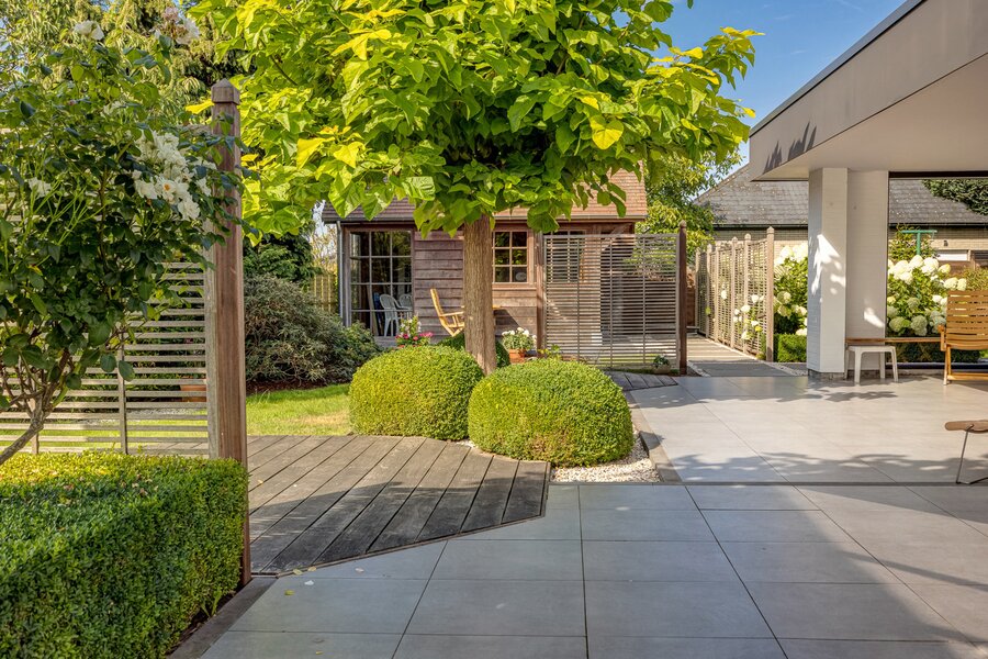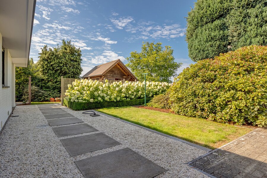 De tuin is prachtig aangelegd en voorzien van een groot eiken bijgebouw dat tal van mogelijkheden biedt.