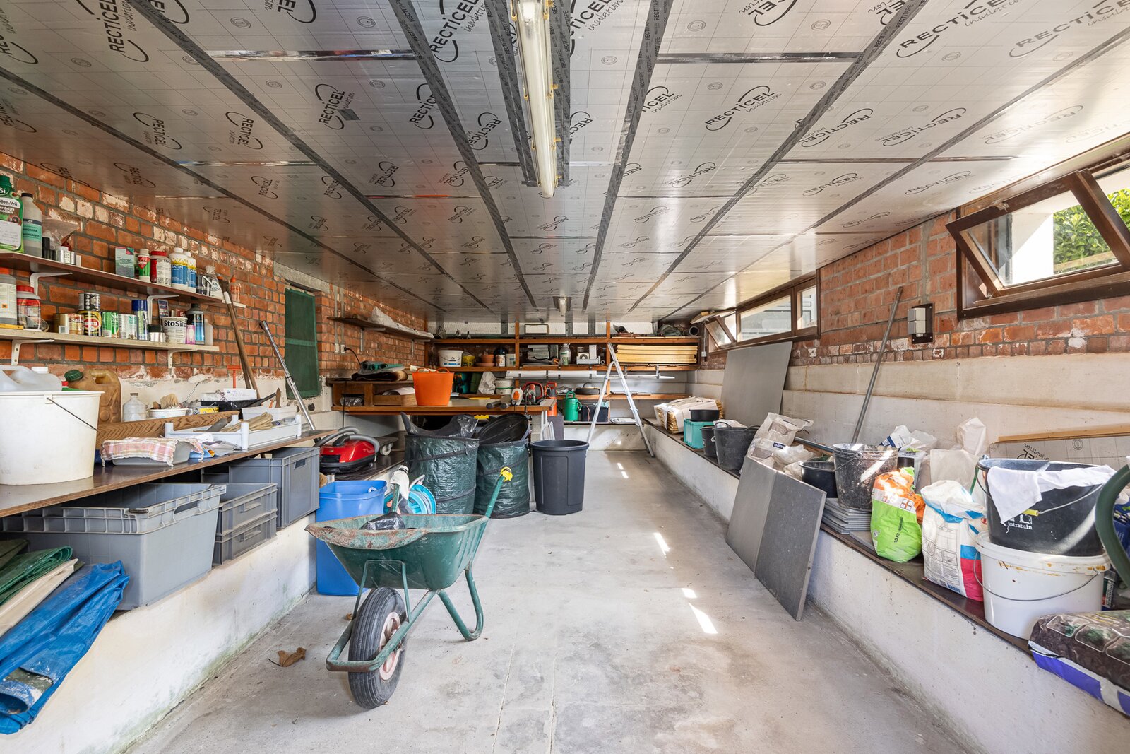 Aan de Oostkant van de woning bevindt zich een grote geïsoleerde gedeeltelijk ondergrondse kelder, perfect geschikt voor hobby's of extra bergruimte.