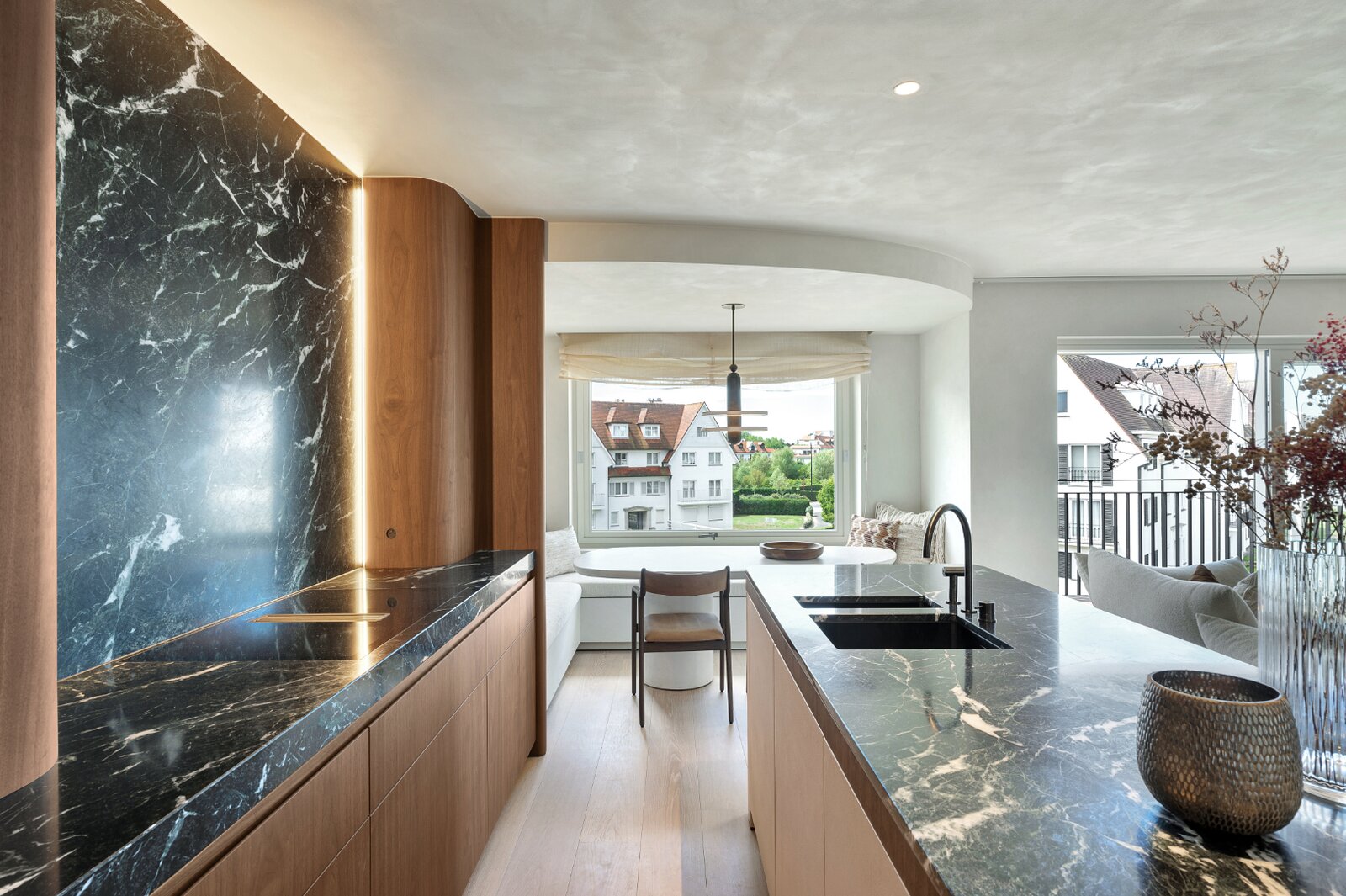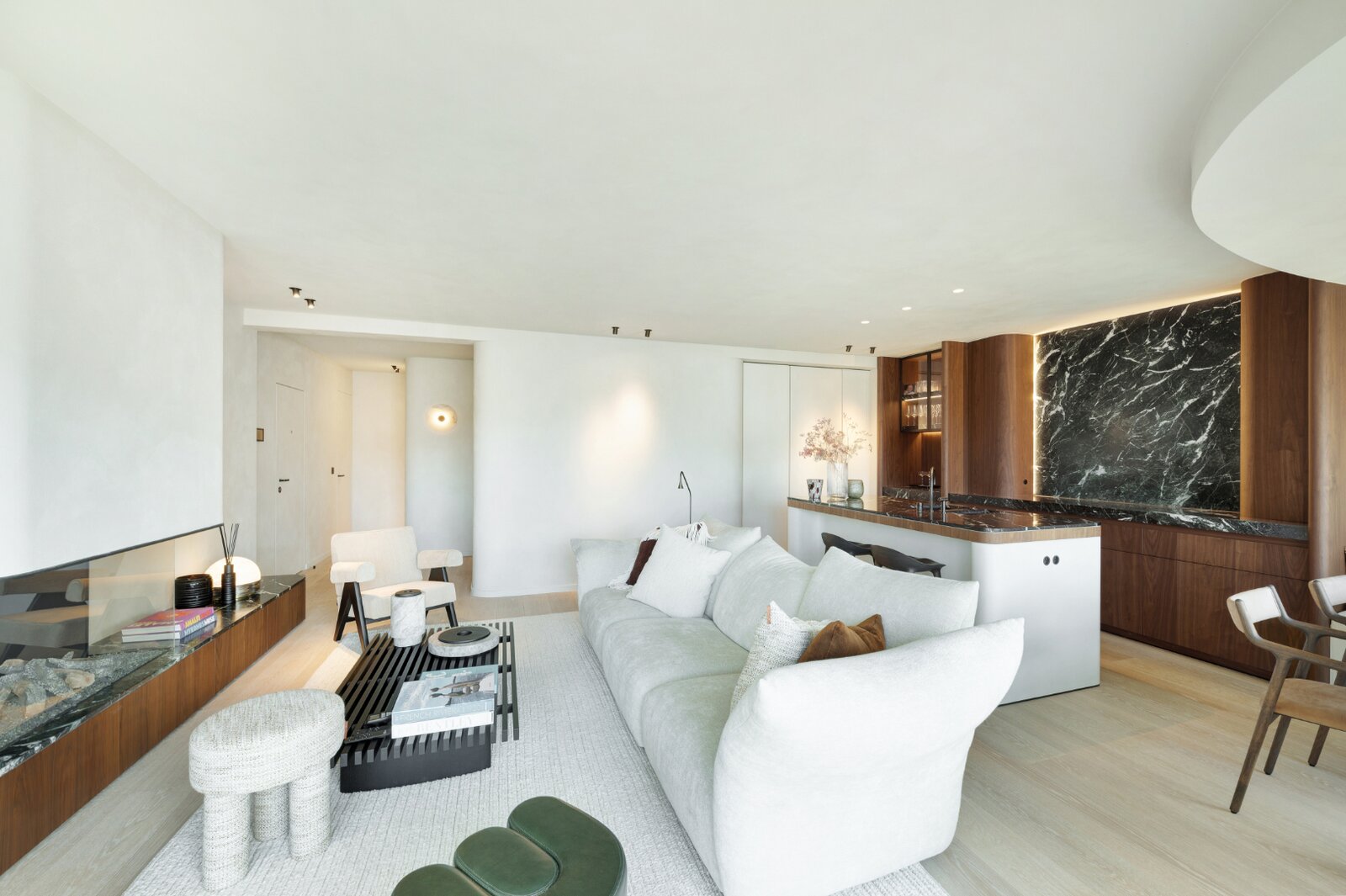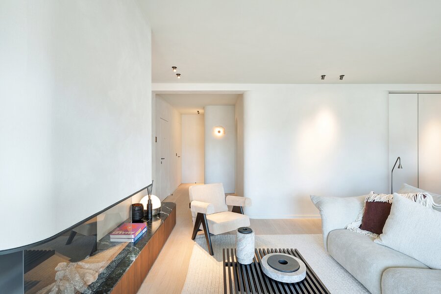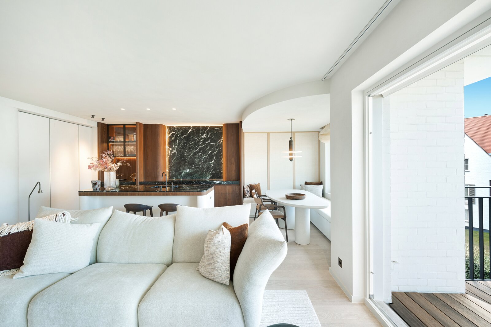 Bij binnenkomst een ruime inkomhal met vestiaire en gastentoilet. De indrukwekkende leefruimte van meer dan 7 meter breed beschikt over een elegant salon met gashaard en opent naar een zonneterras met middag- tot ondergaande zon. De volledig in marmer uitgevoerde leefkeuken (Miele-toestellen) biedt een gezellige eethoek met geïntegreerde zitbank – perfect voor intieme diners of ontvangst van gasten.